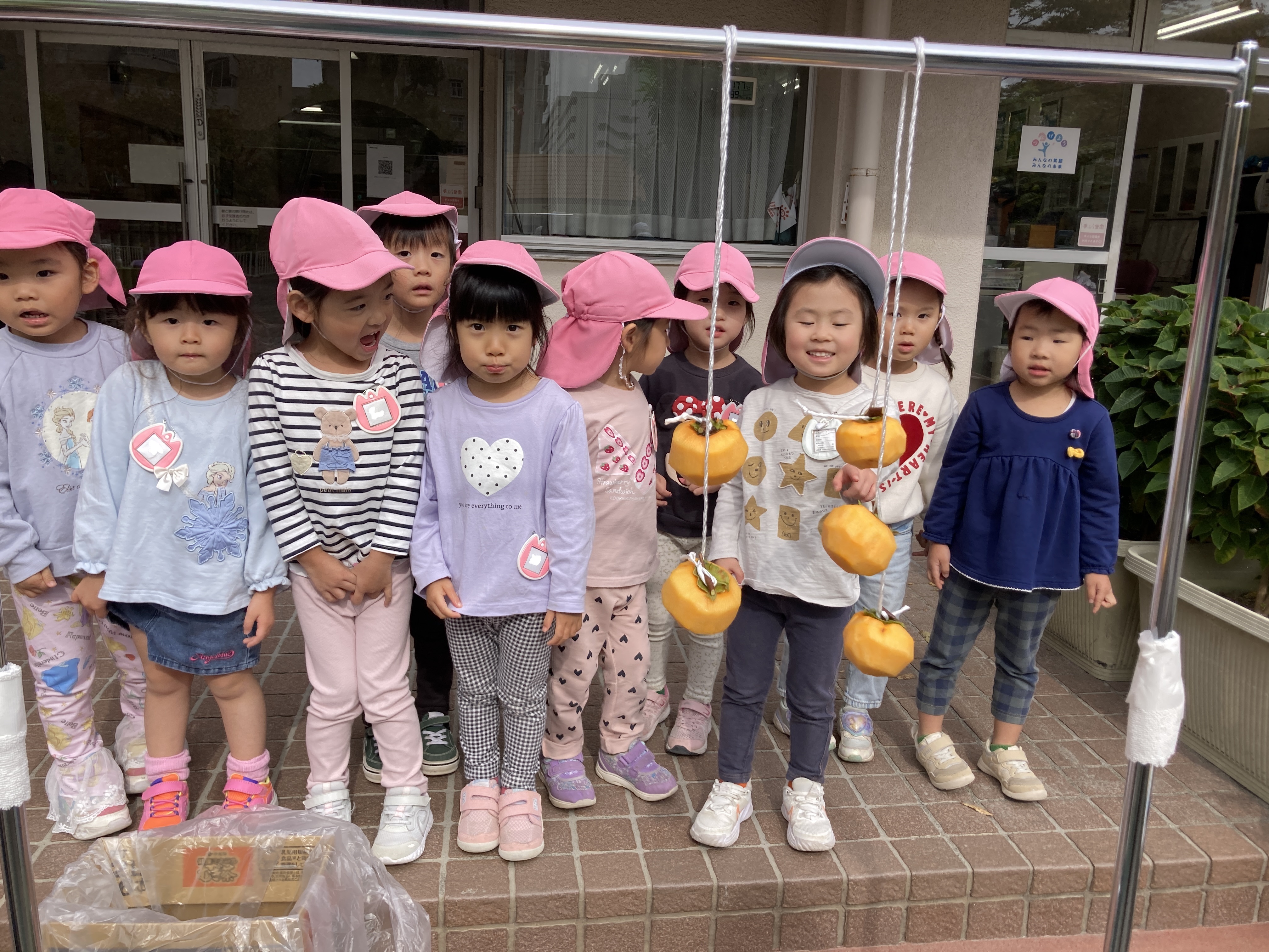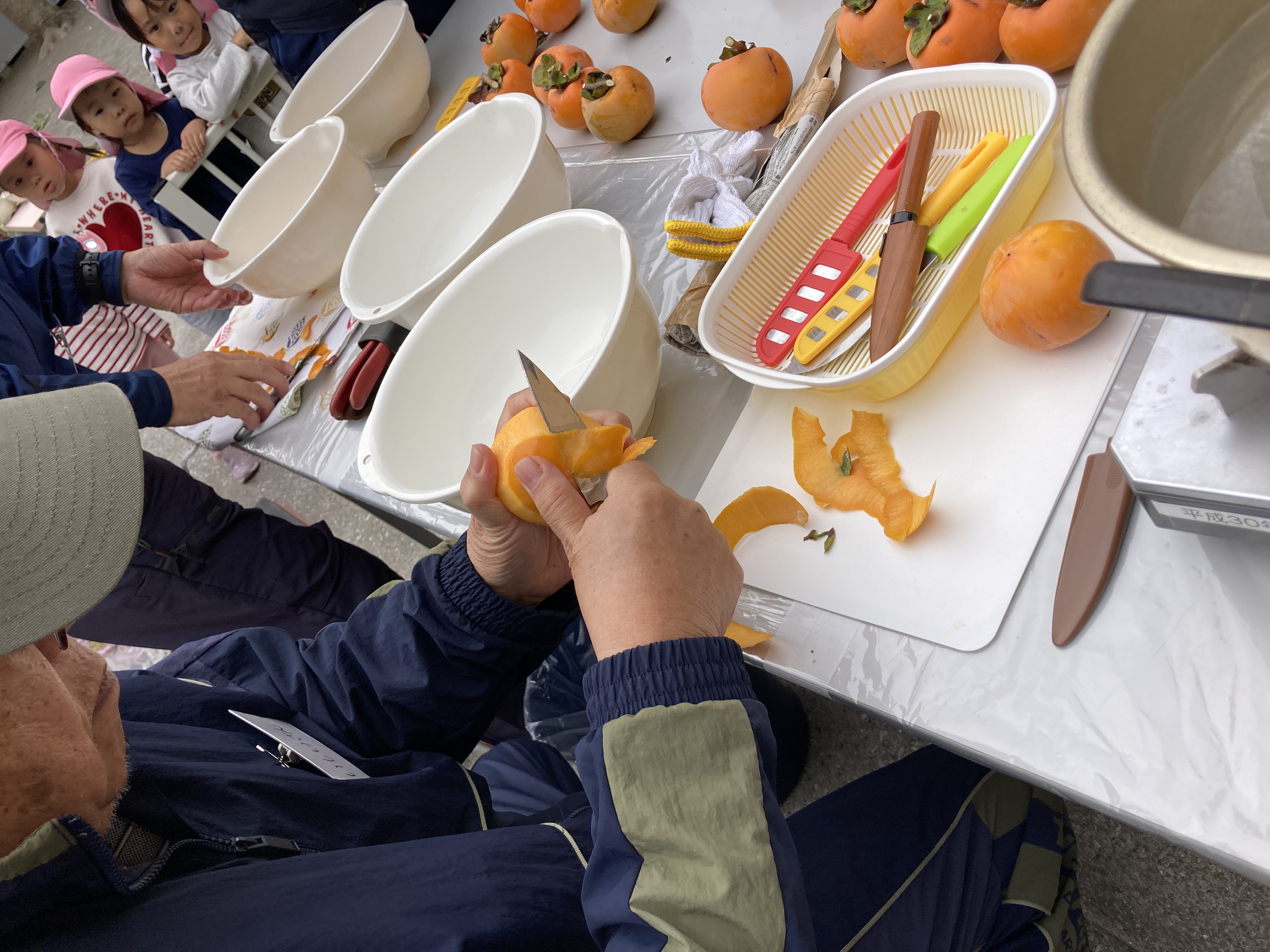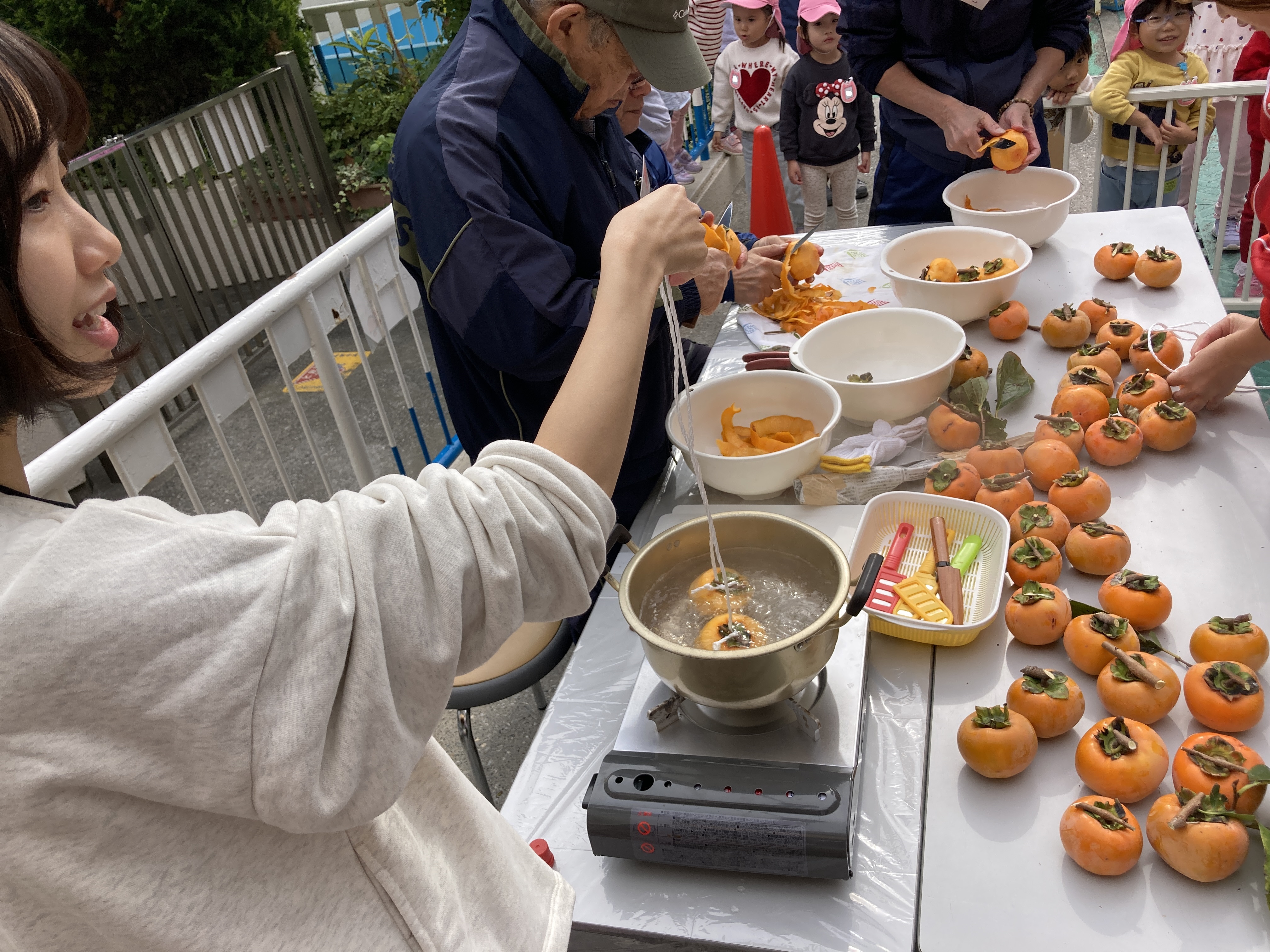 第三者委員の方と地域の方達に手伝っていただき、園庭にある柿を使用して、干し柿作りをしました。