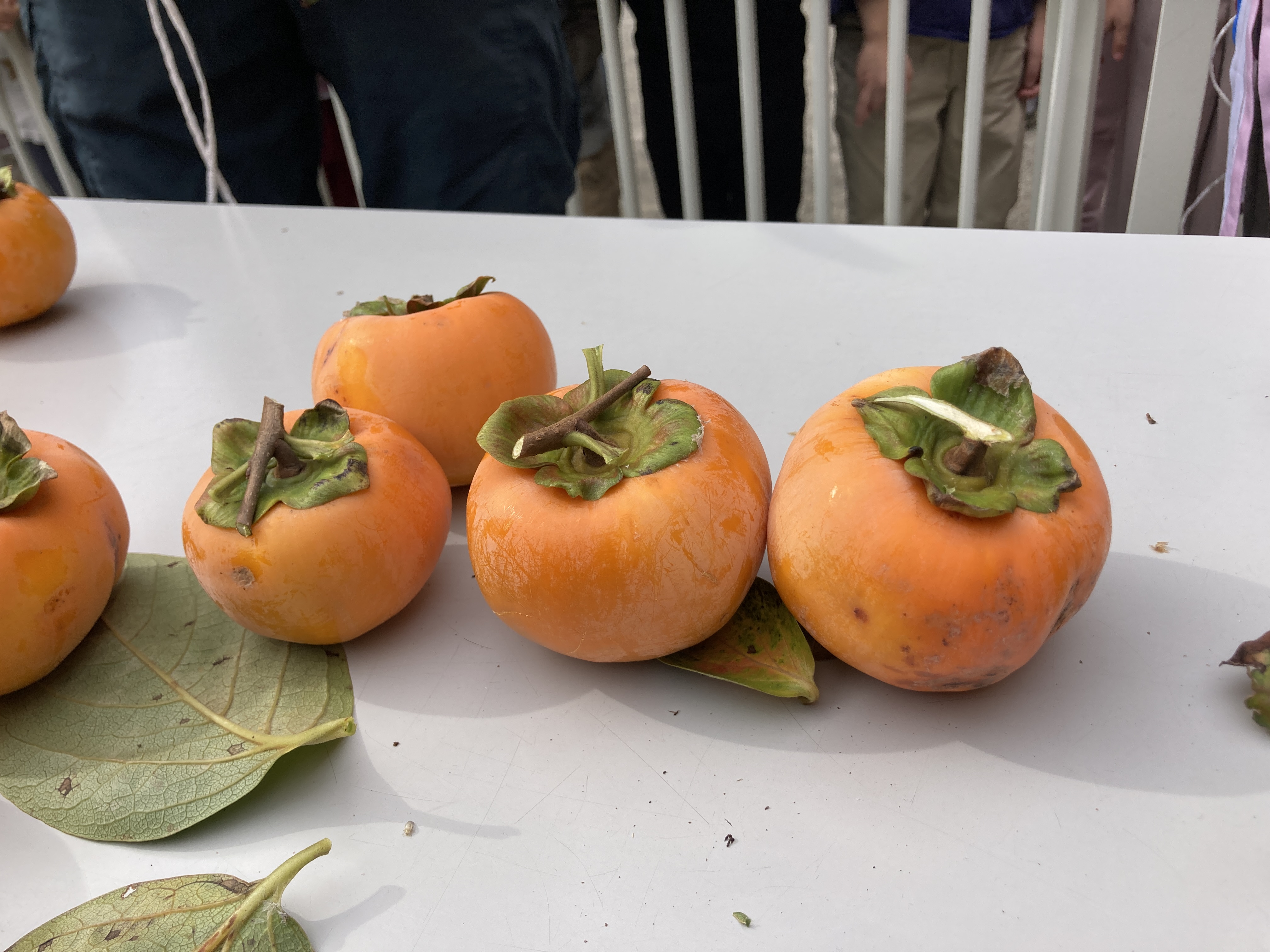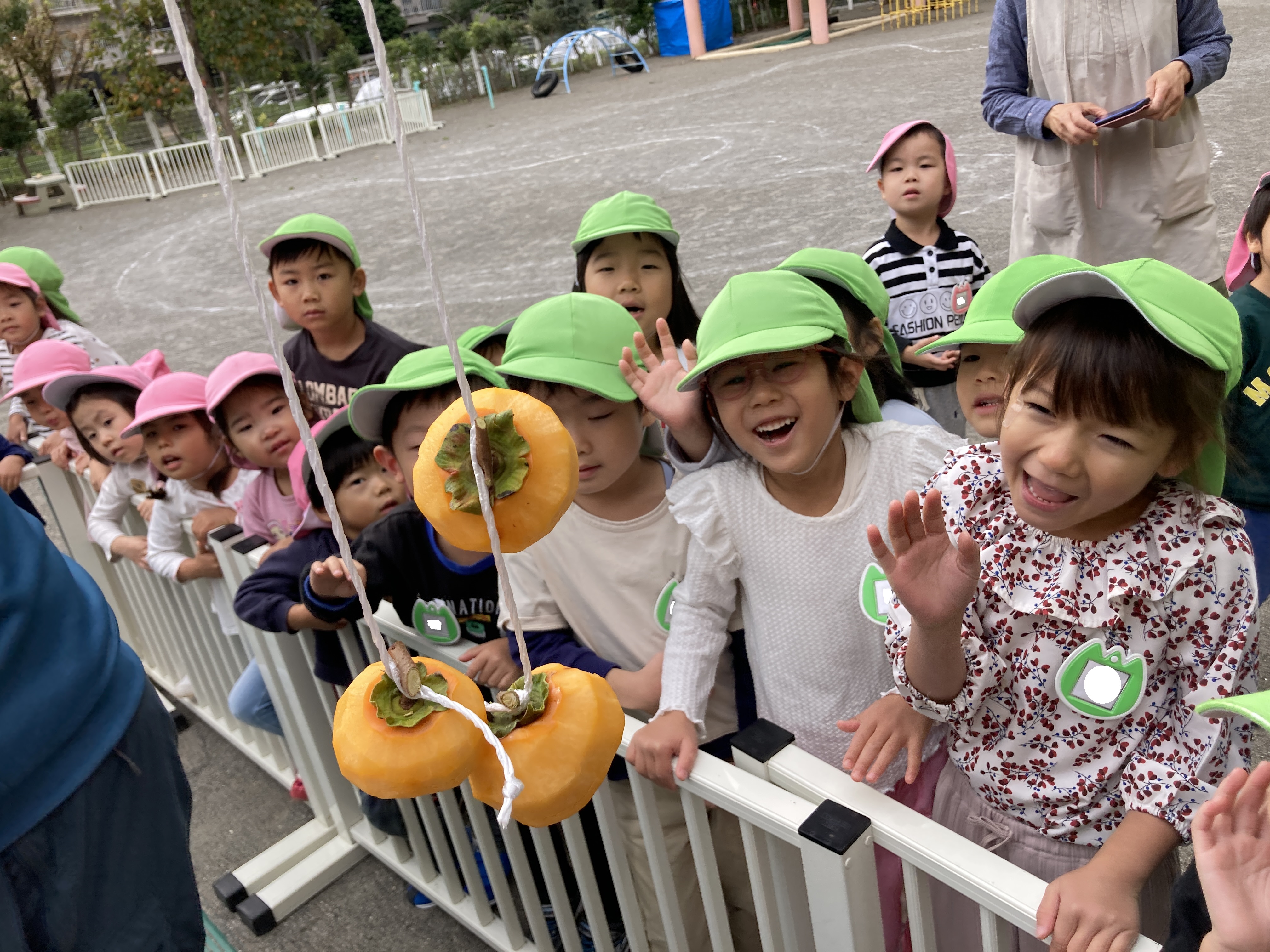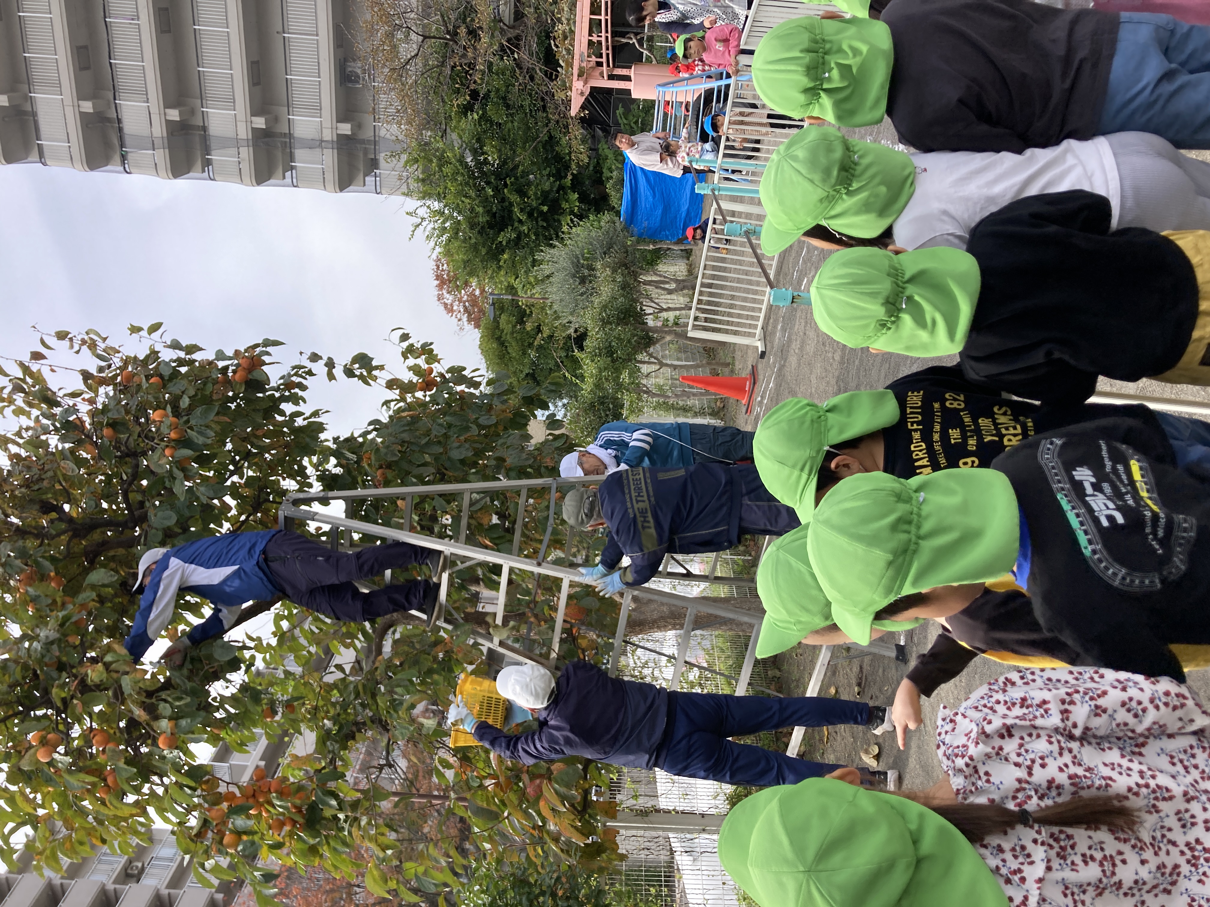 第三者委員の方と地域の方達に手伝っていただき、園庭にある柿を使用して、干し柿作りをしました。