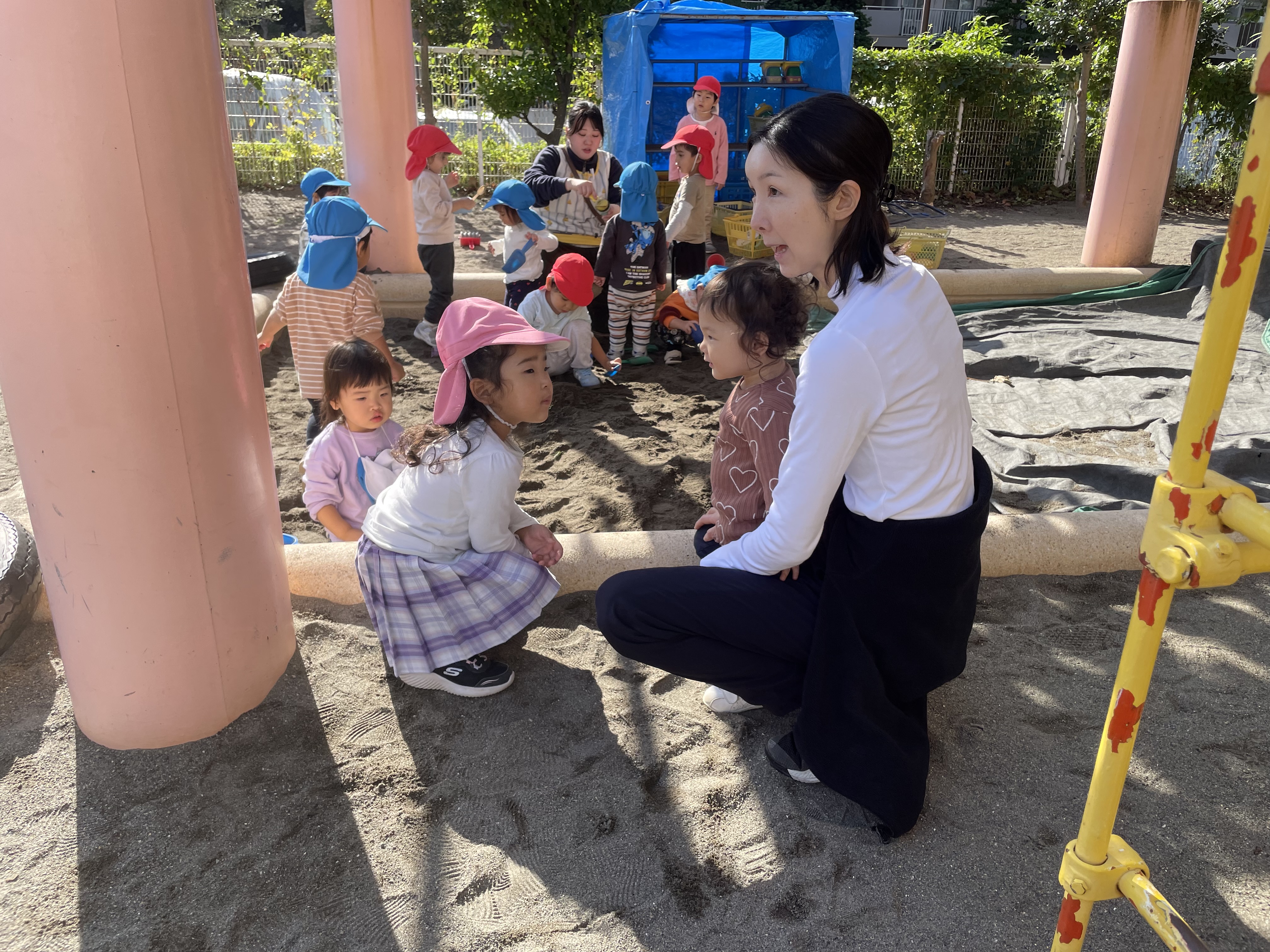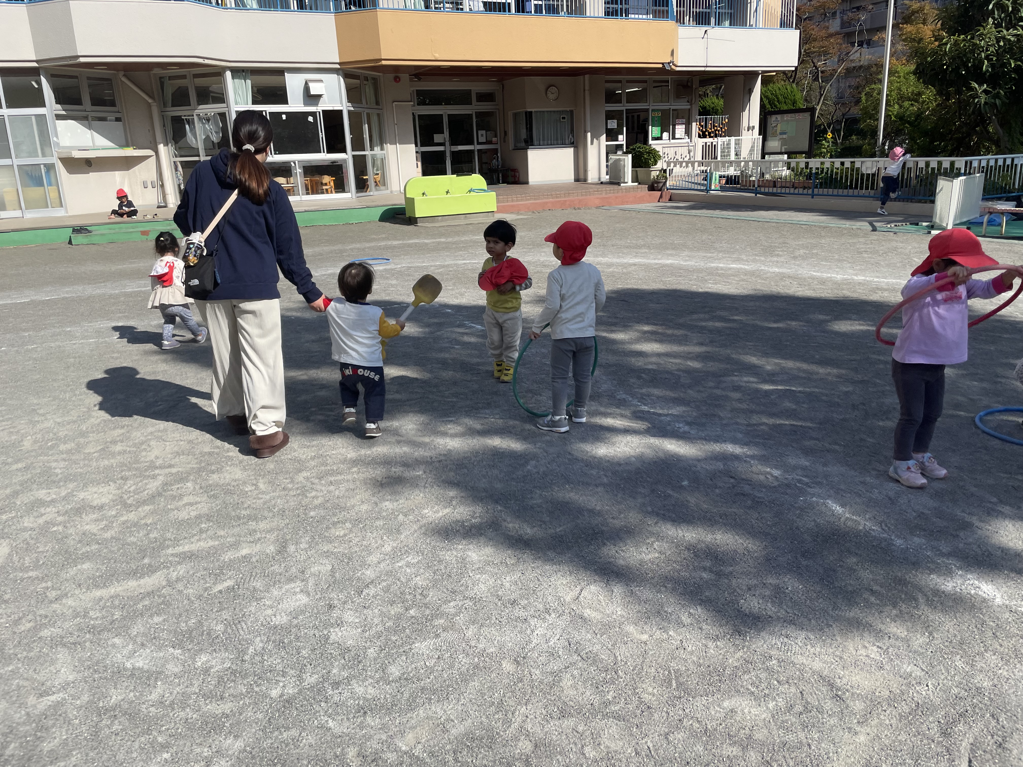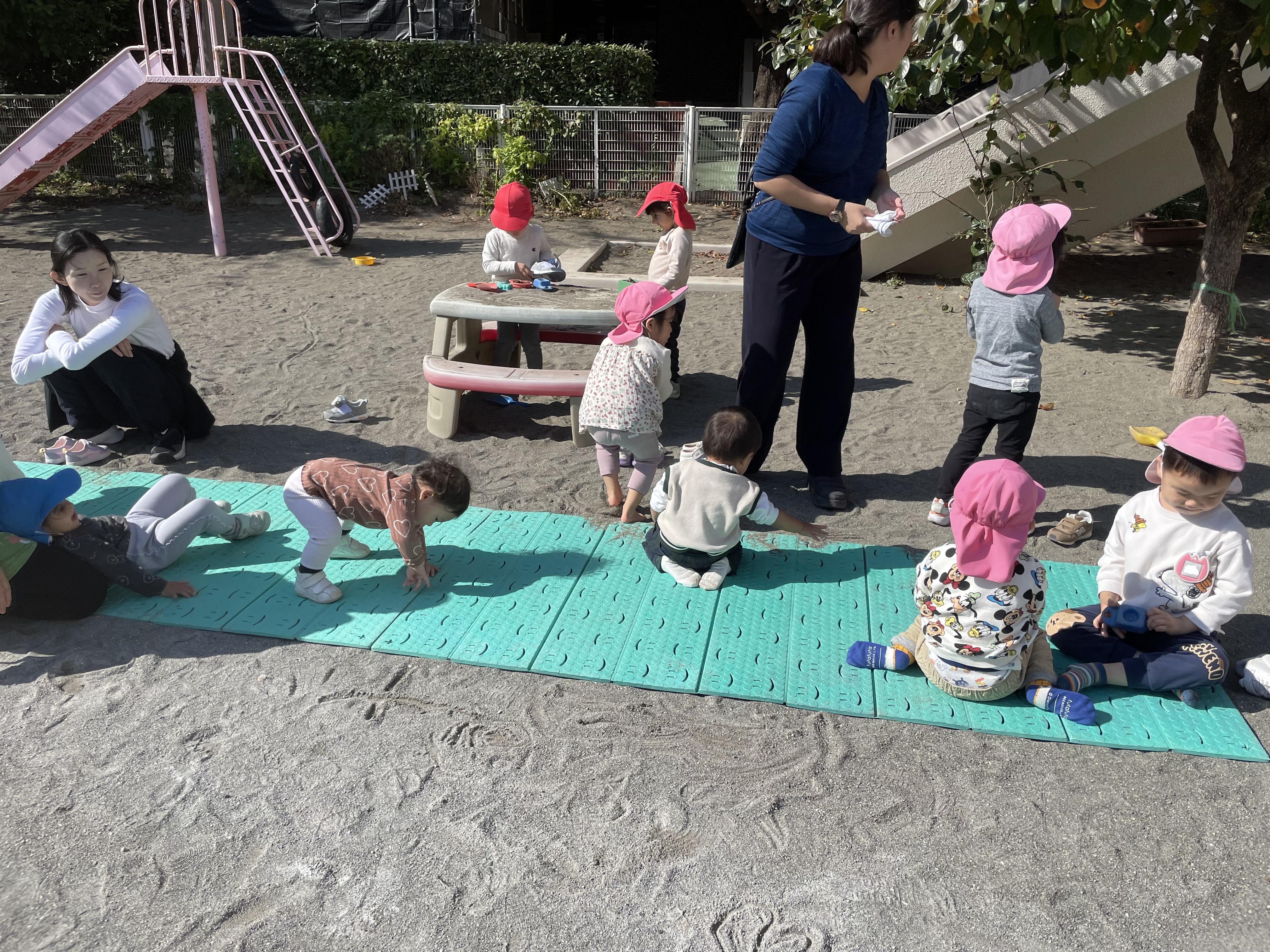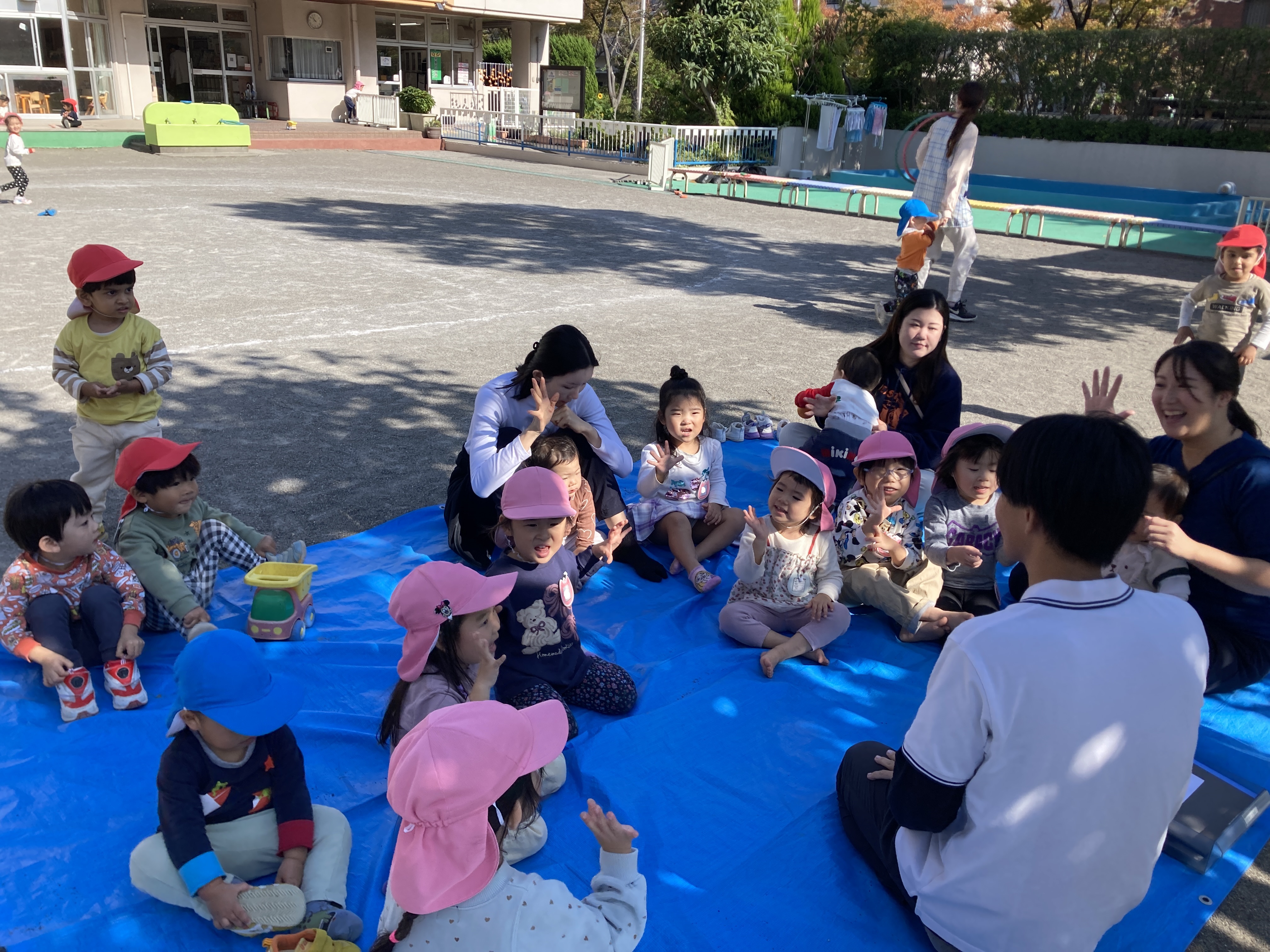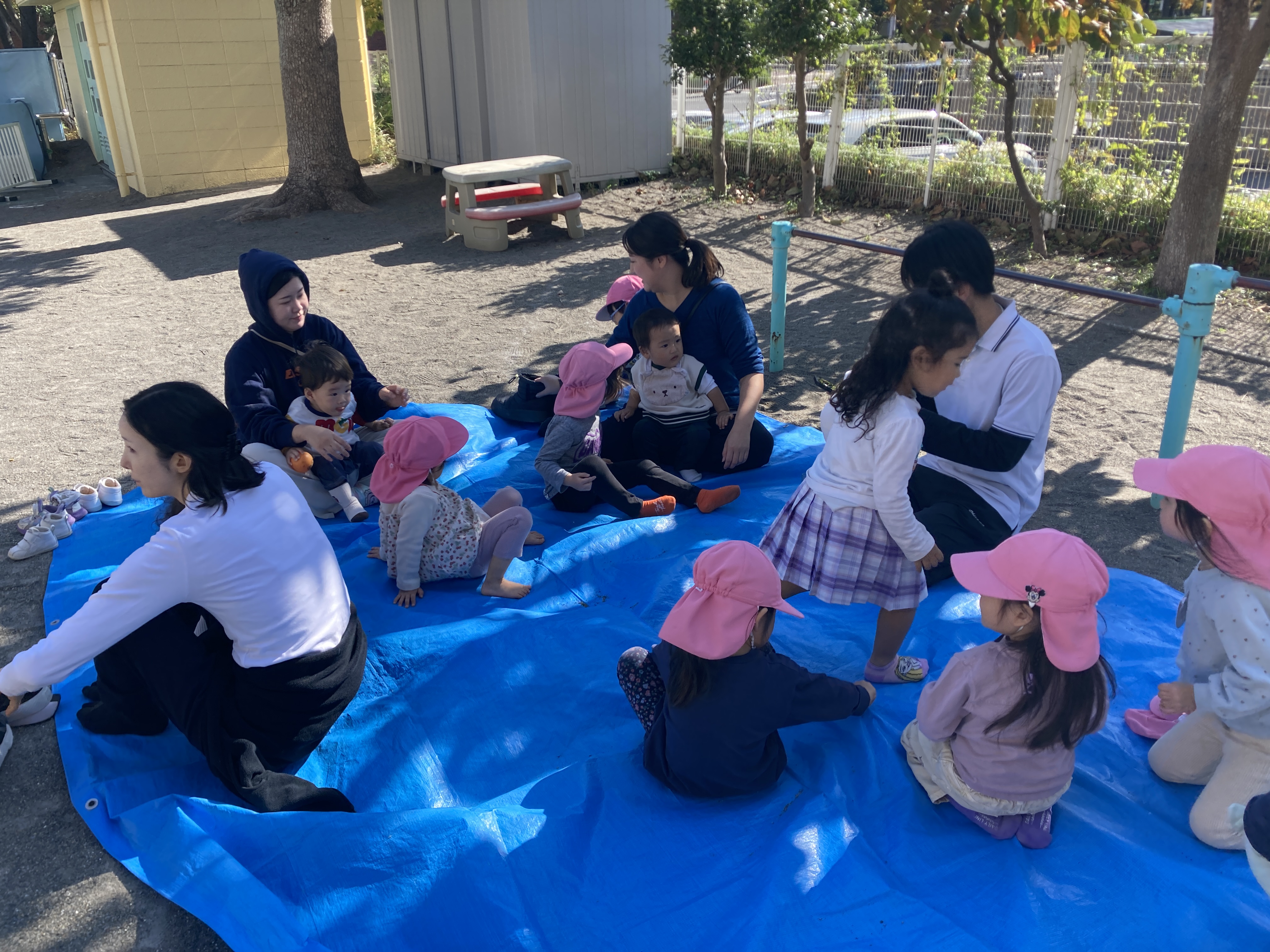 園庭遊びの後は、ブルーシートを敷いて、ピクニック気分を味わいながら手遊びをしたり、触れ合いあそびとして“バスにのって”をして楽しみました!
