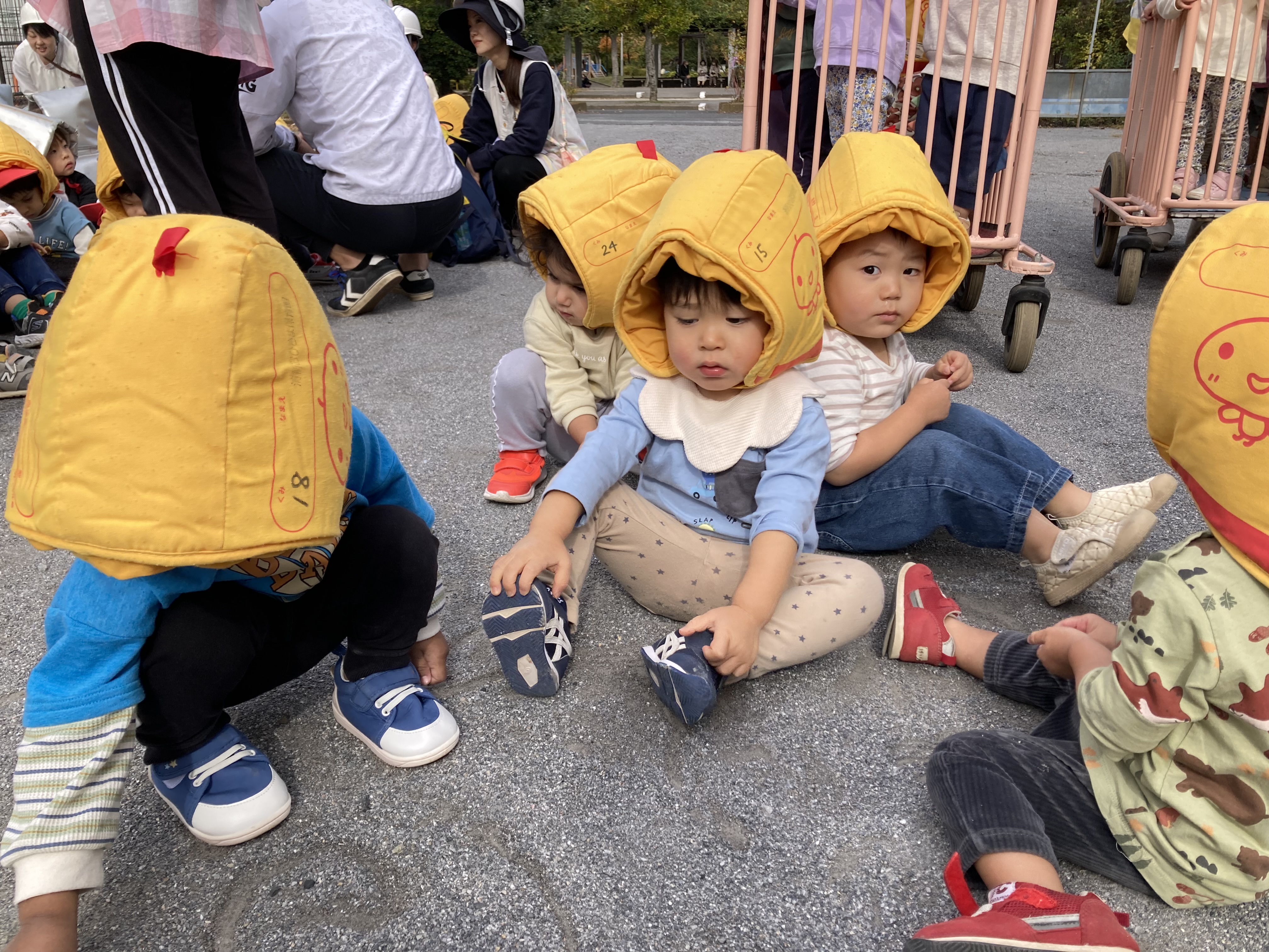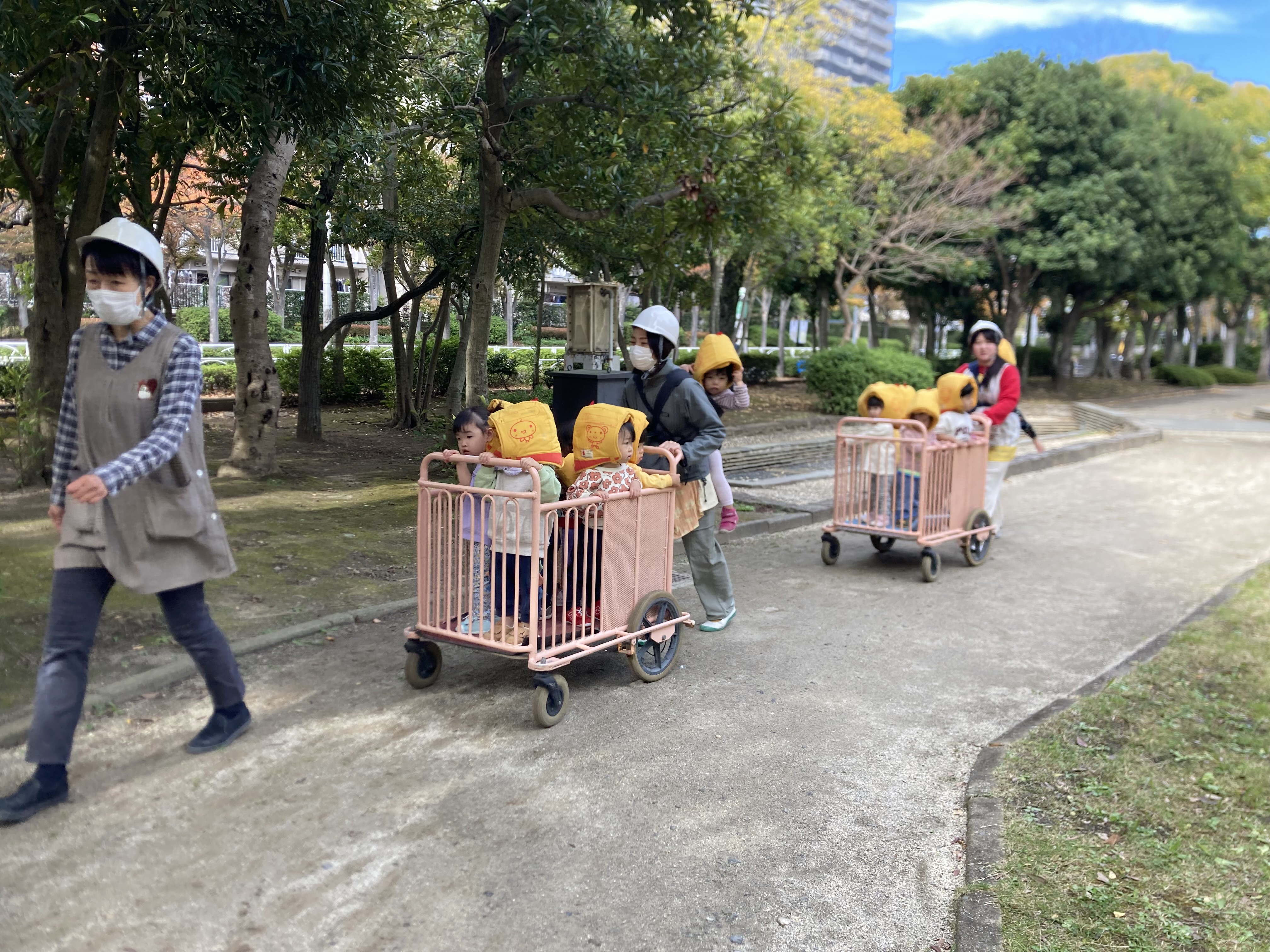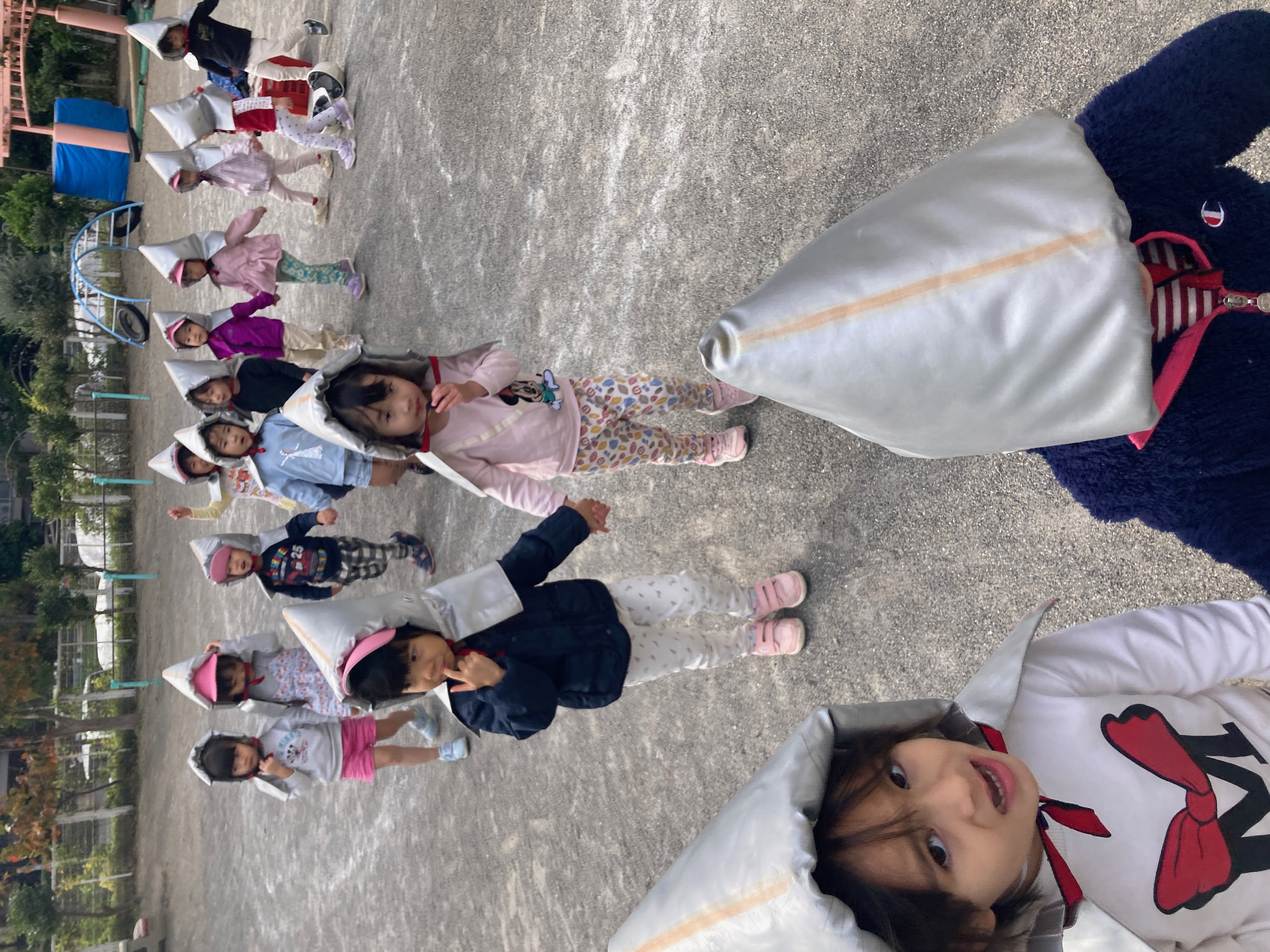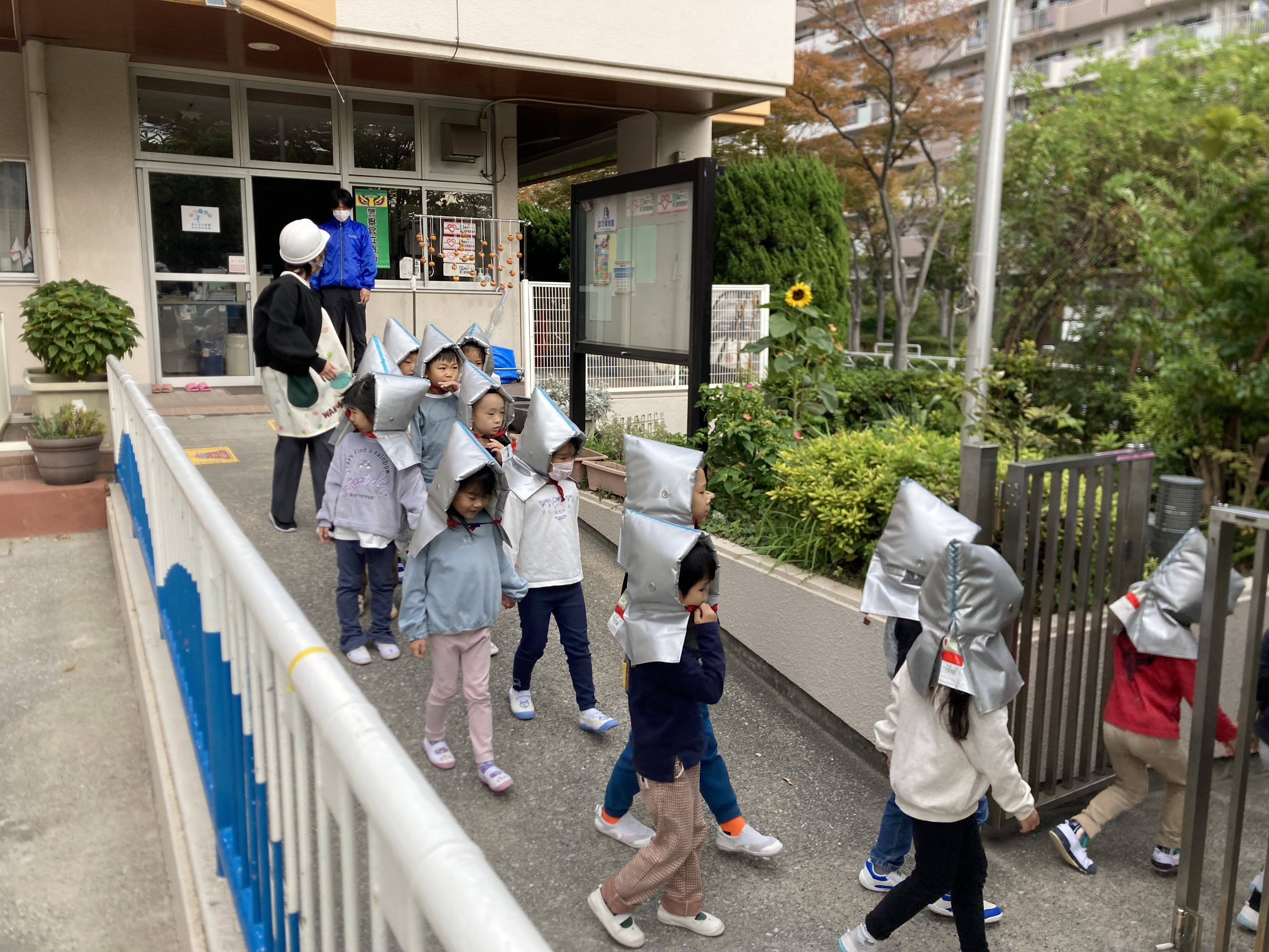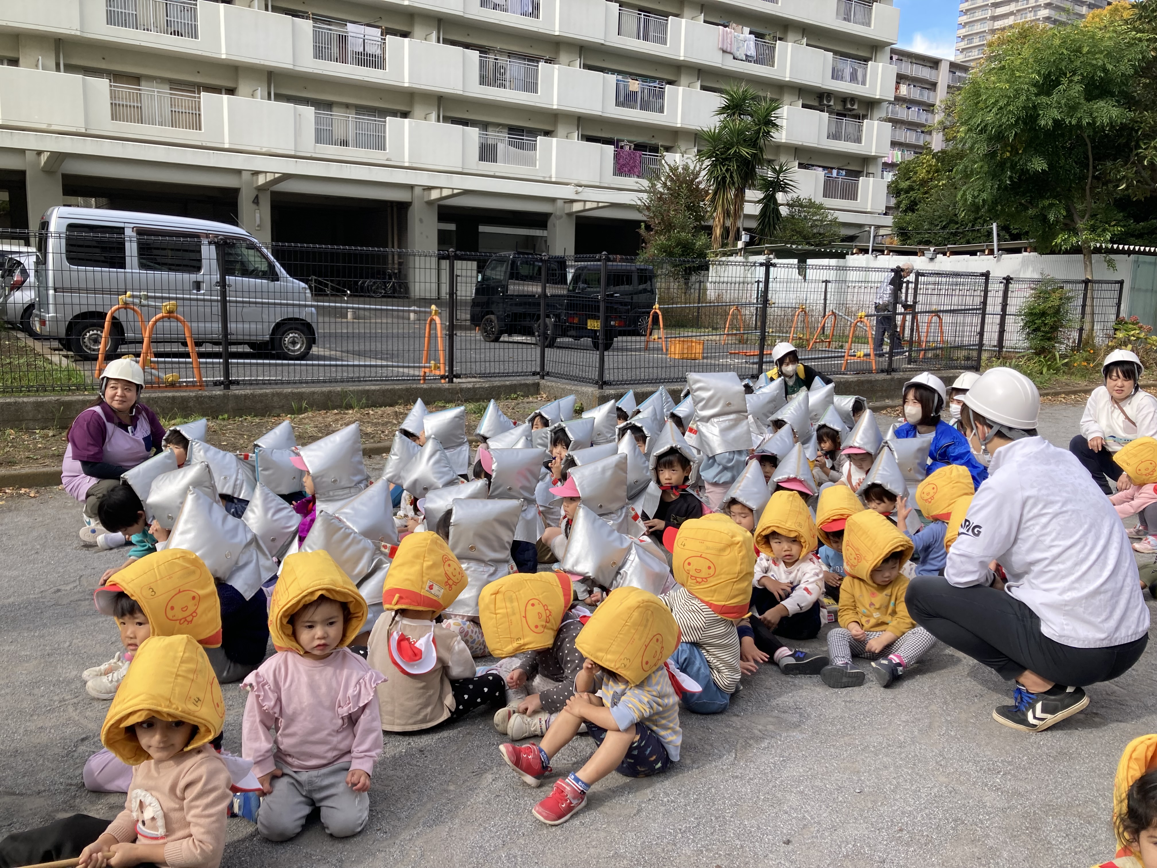 いつもの訓練とは違い、園庭に避難してから建物倒壊の恐れがある想定で、清新第三広場まで避難しました。