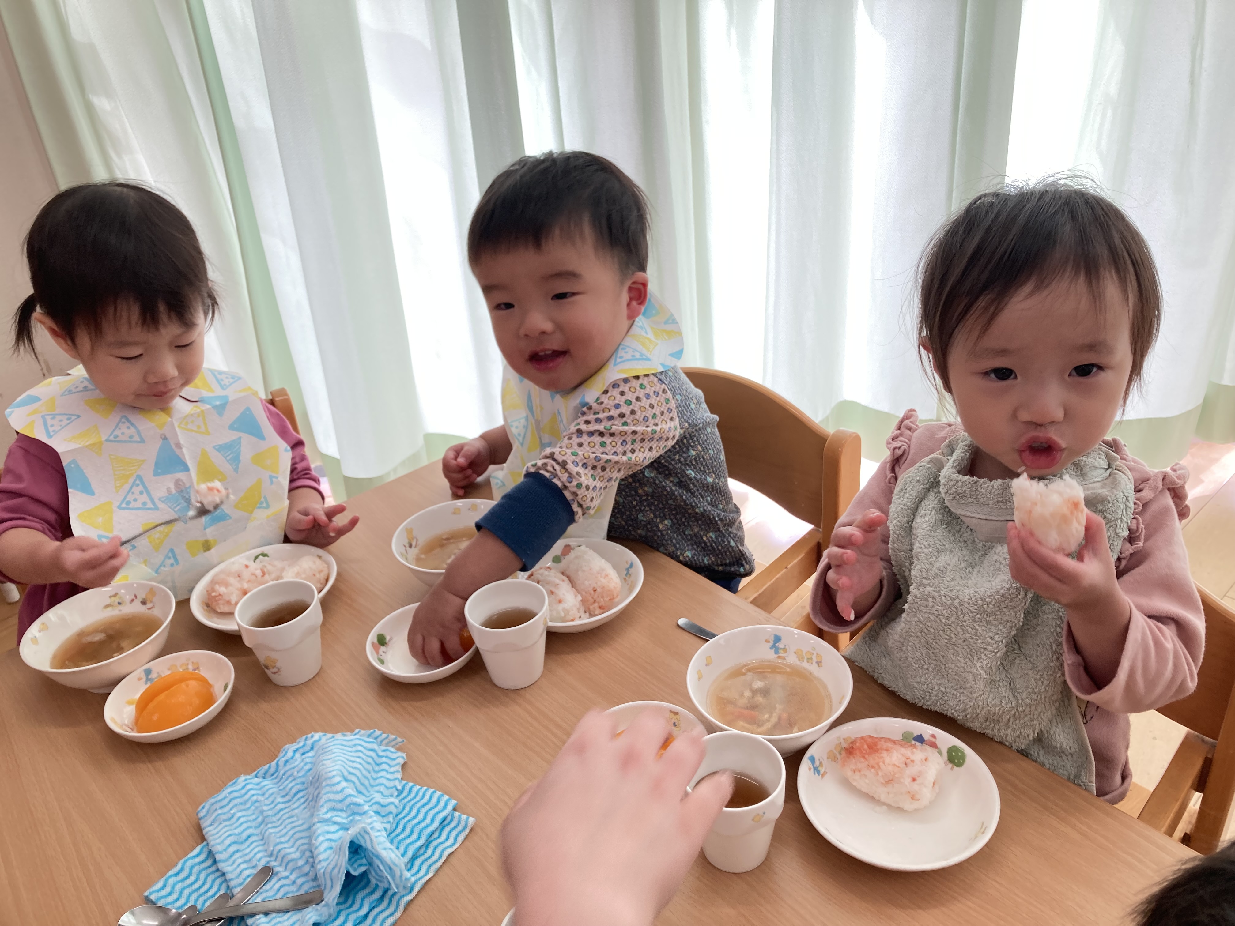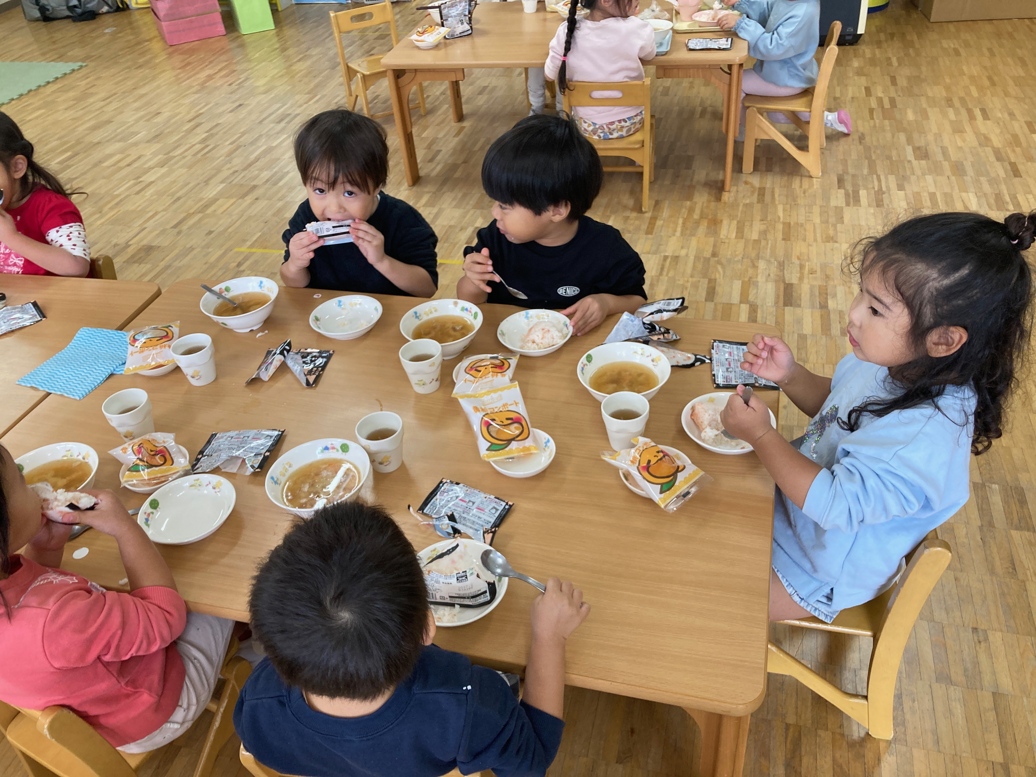 お湯を入れて戻した鮭おにぎりは特別感があったようで、みんなモリモリ食べていましたよ!