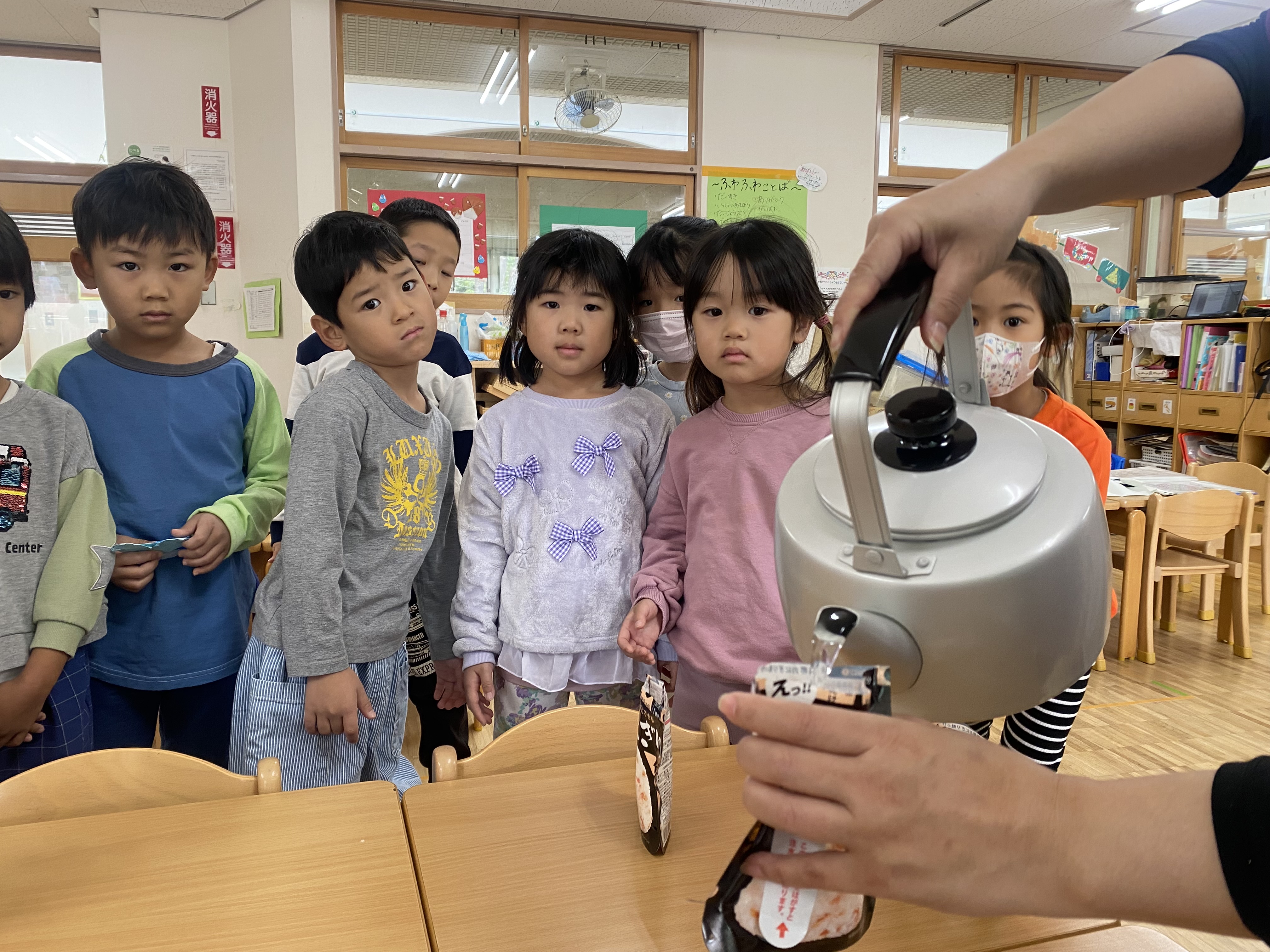 パウチの中にお湯を入れてから15分・・・待っている間は「ねぇまだ?」「もう食べて良い?」と待ち遠しい様子の子どもたちでした。