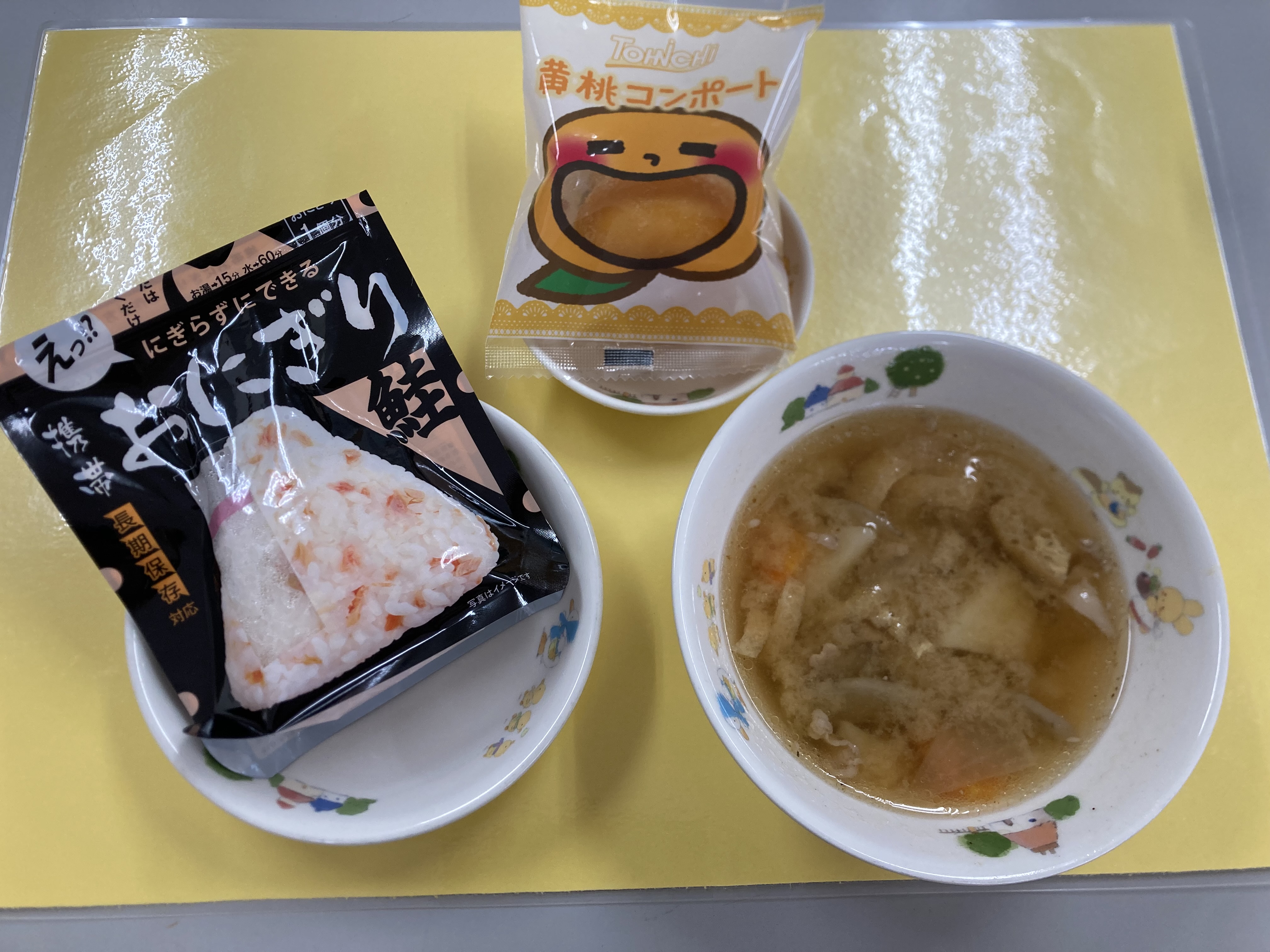 お給食では、非常食の試食を兼ねてお湯を入れて作る鮭おにぎりを食べました。