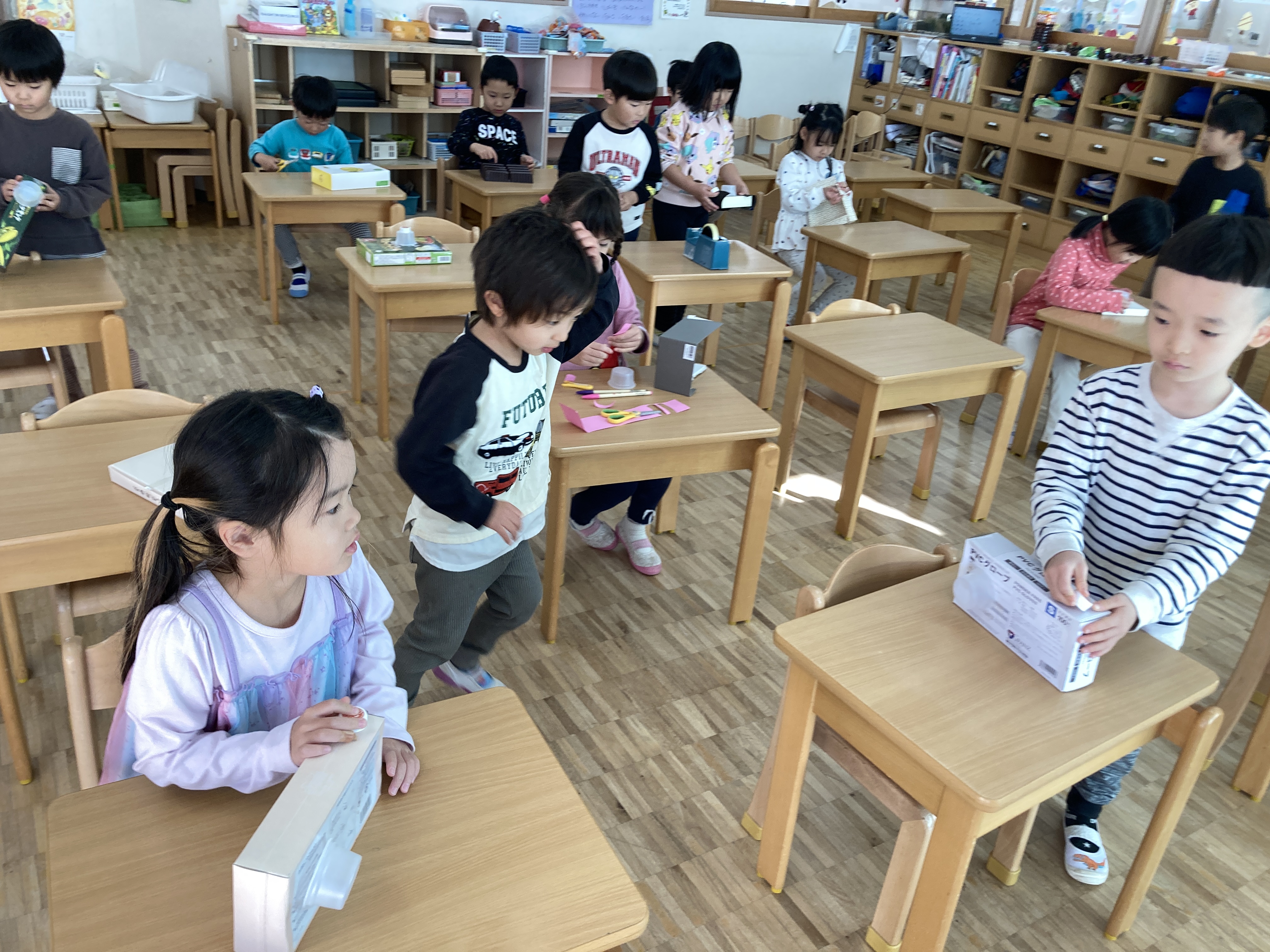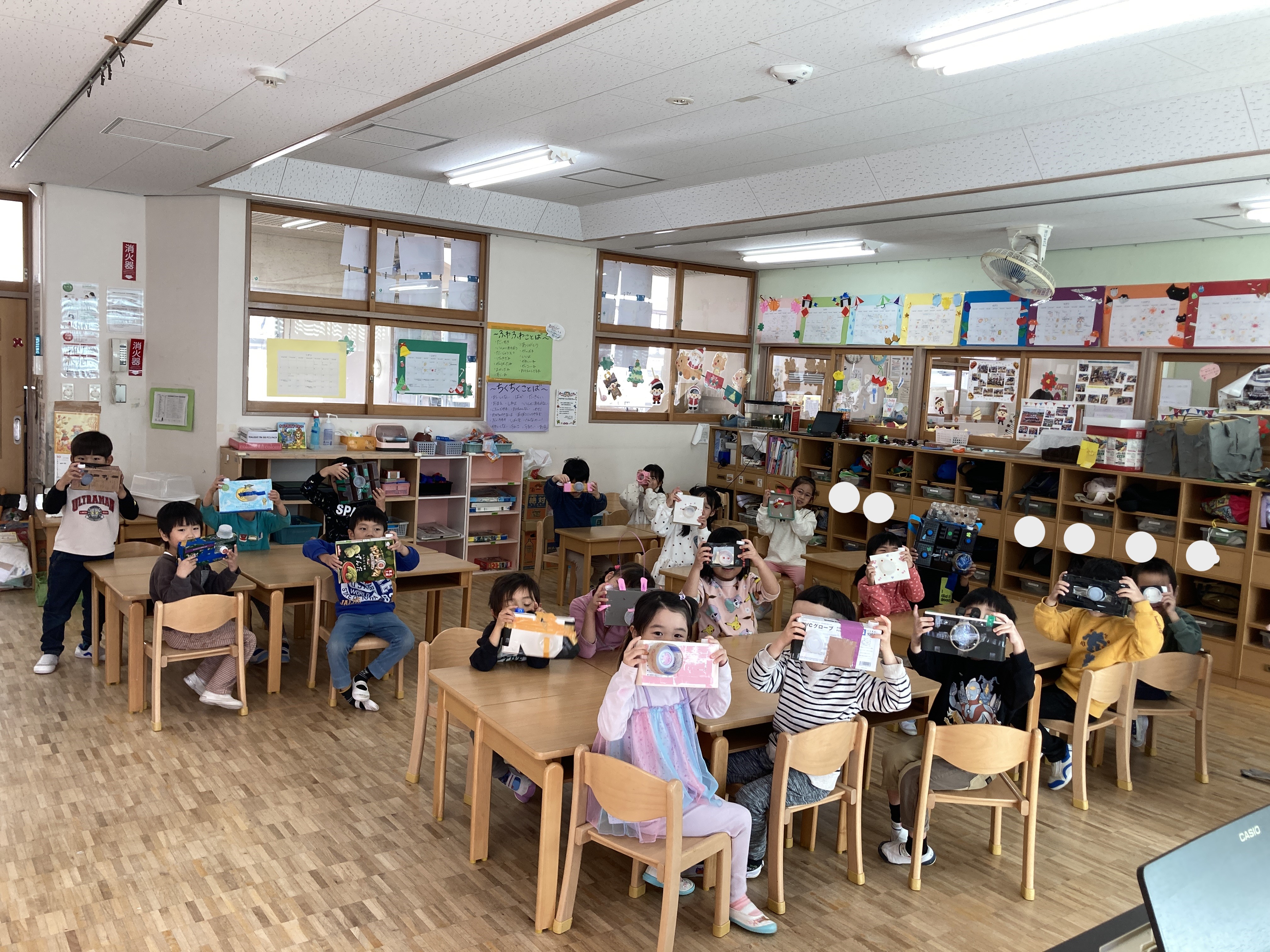 廃材を使ってカメラを作ってみました。一人ひとりが考えながら「こうしようかな?」「こっちもいいな」と廃材選びからスタートしていましたよ。