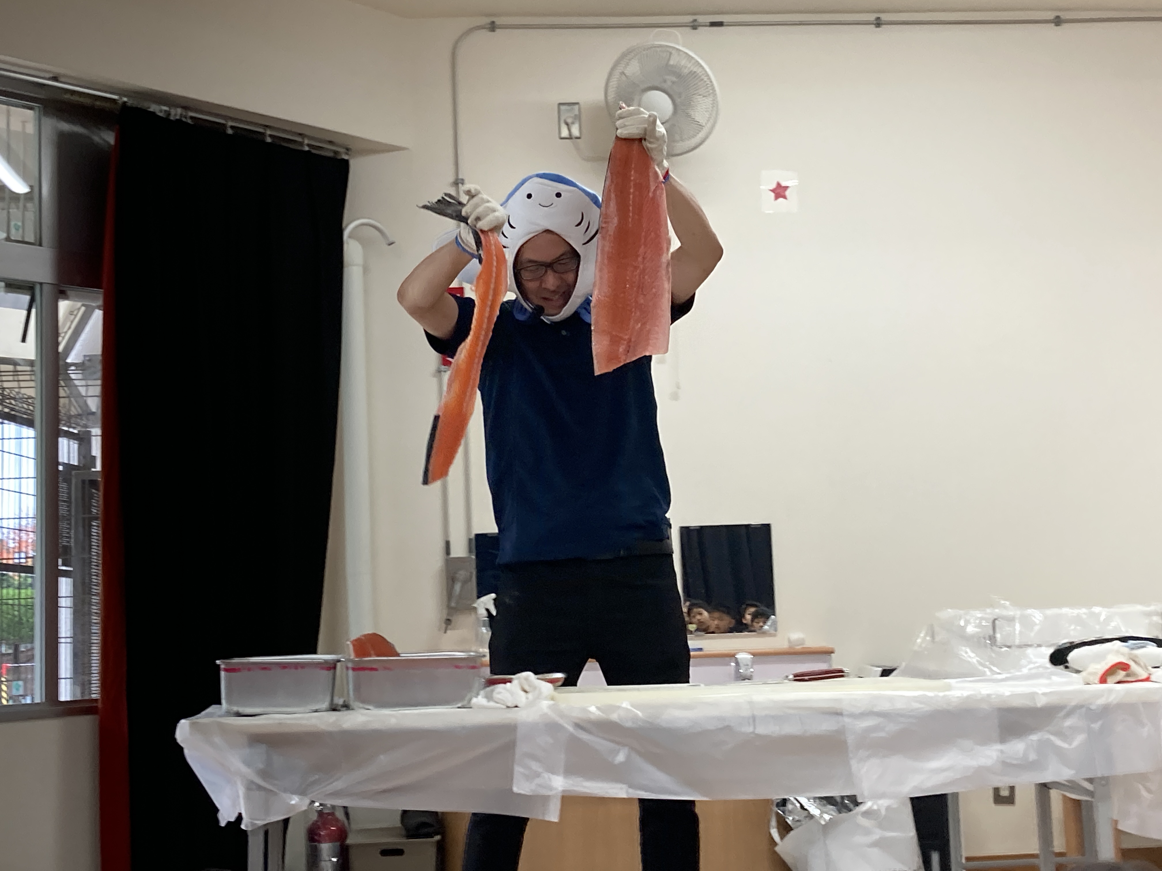 今日はホールで魚の解体を見ました