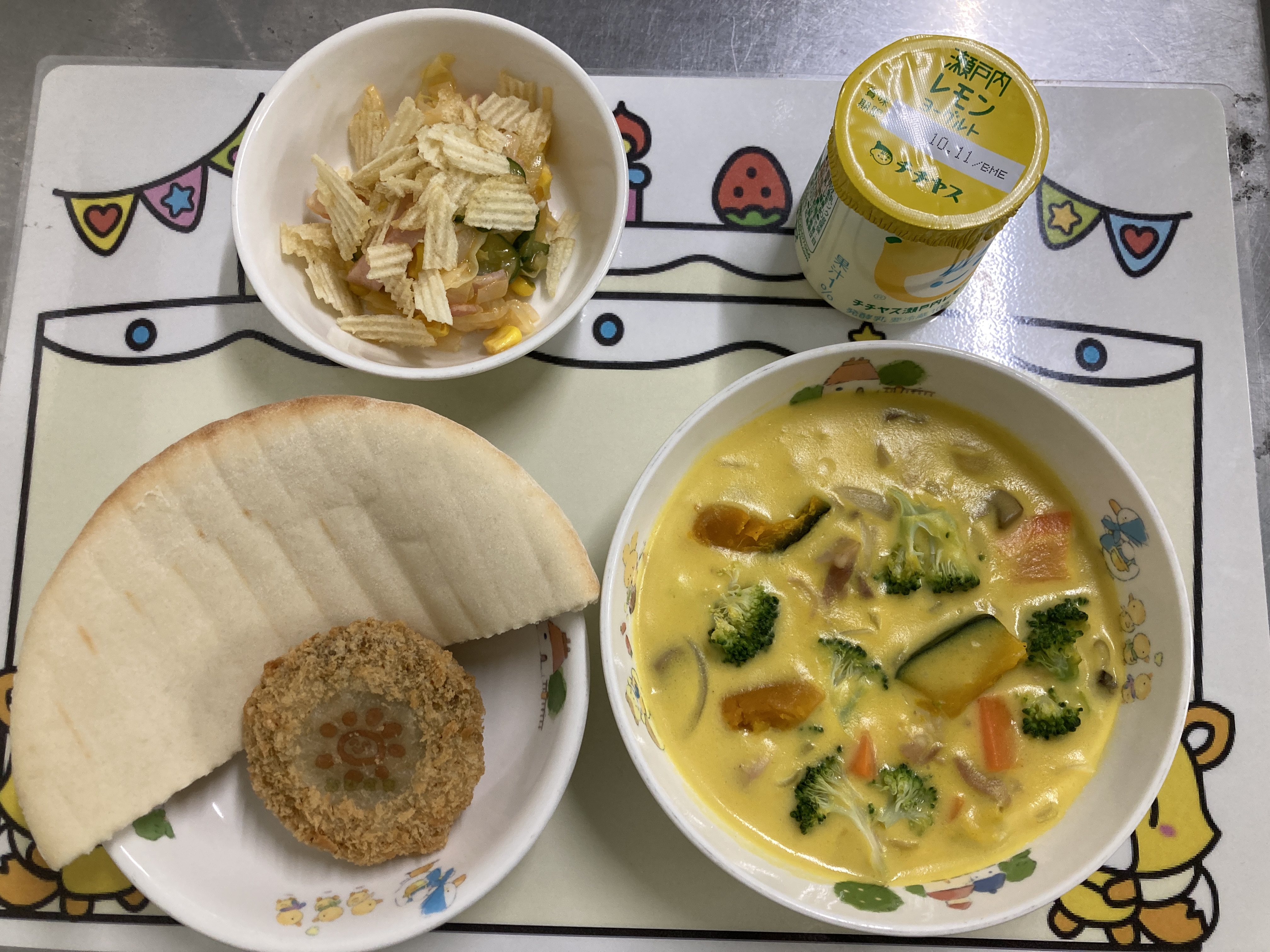 ポケットの様なピタパンにコロッケやサラダを入れたり色々な食べ方を楽しみました。シチューにピタパンを浸して食べる子もいました。