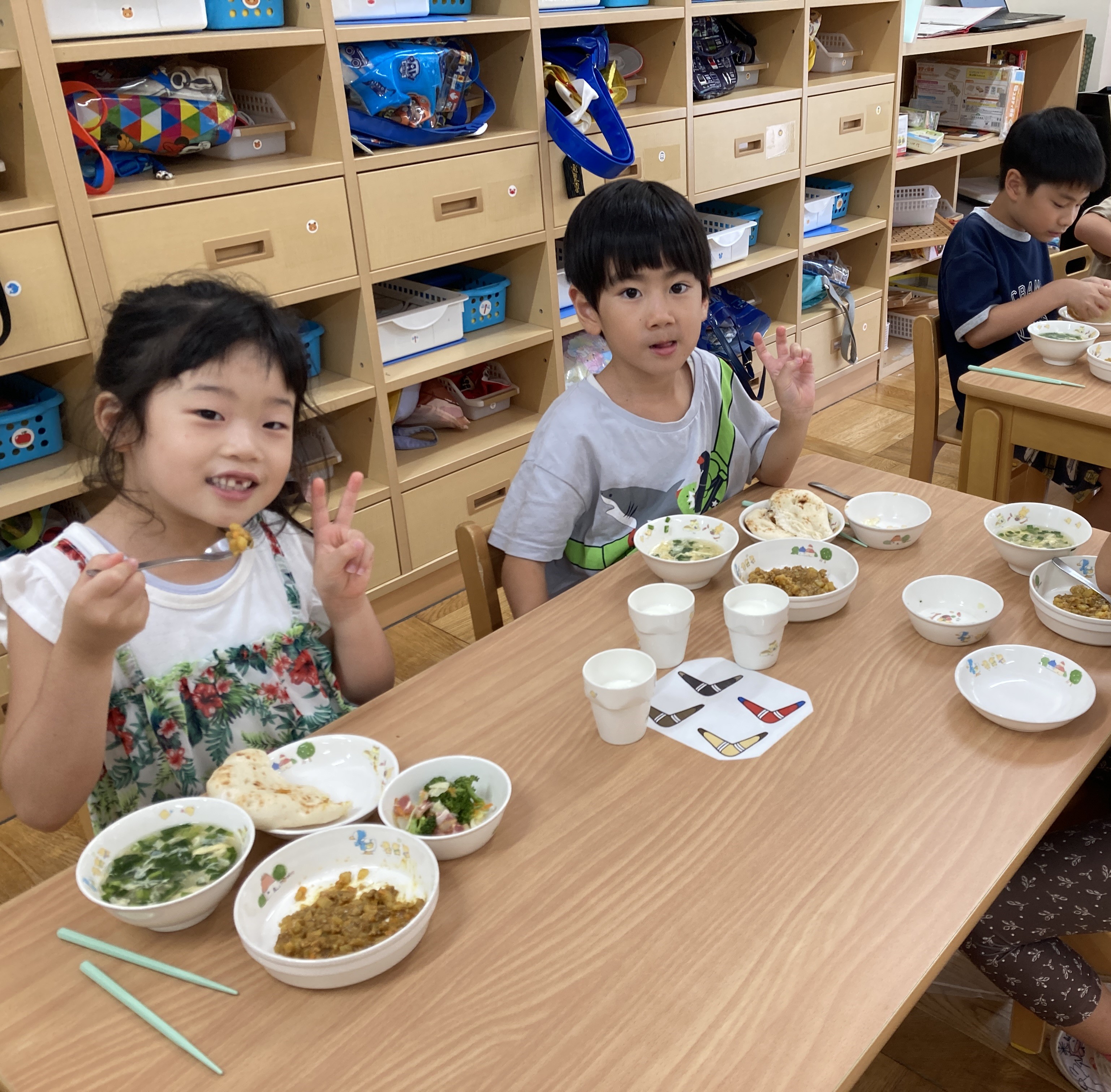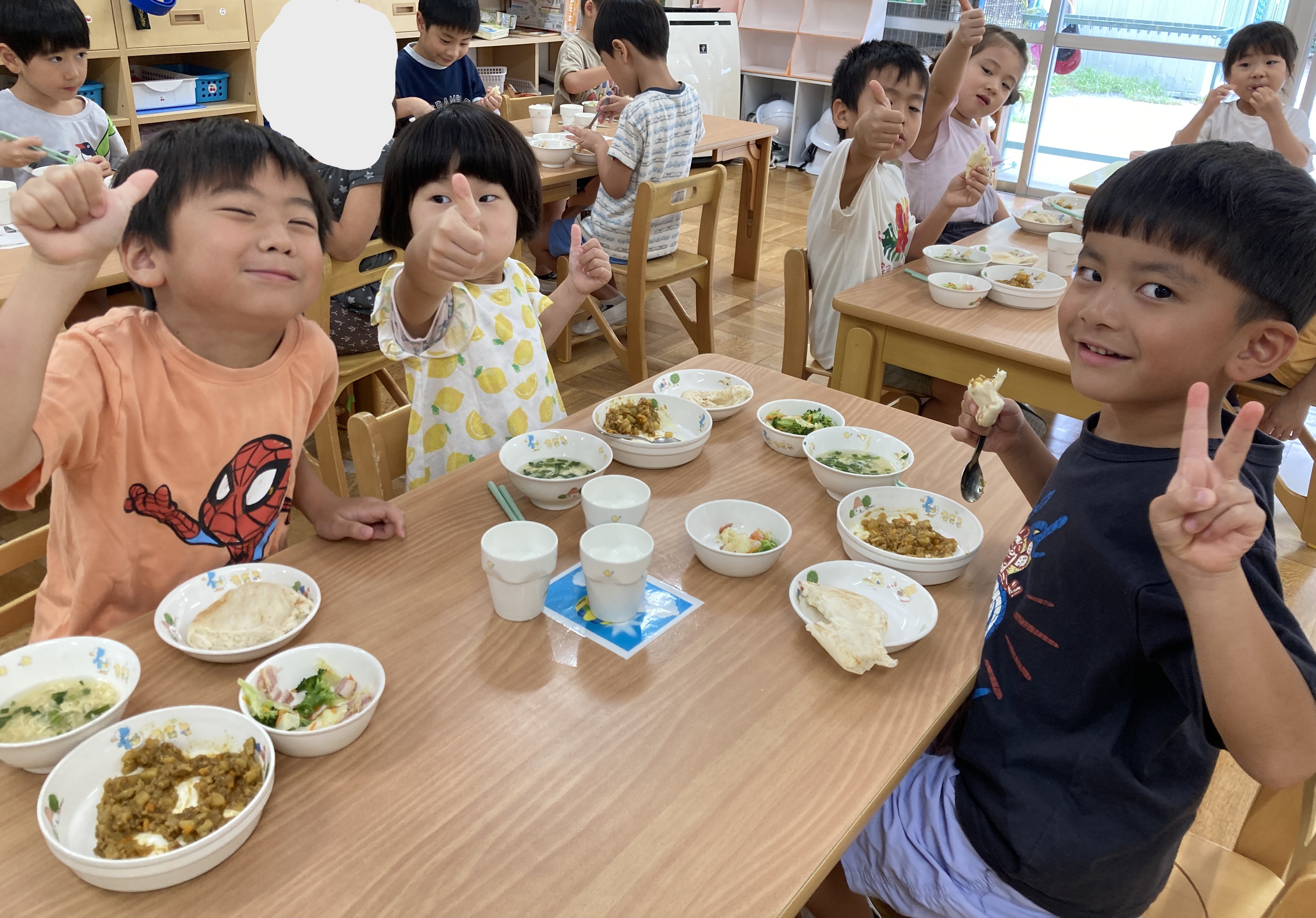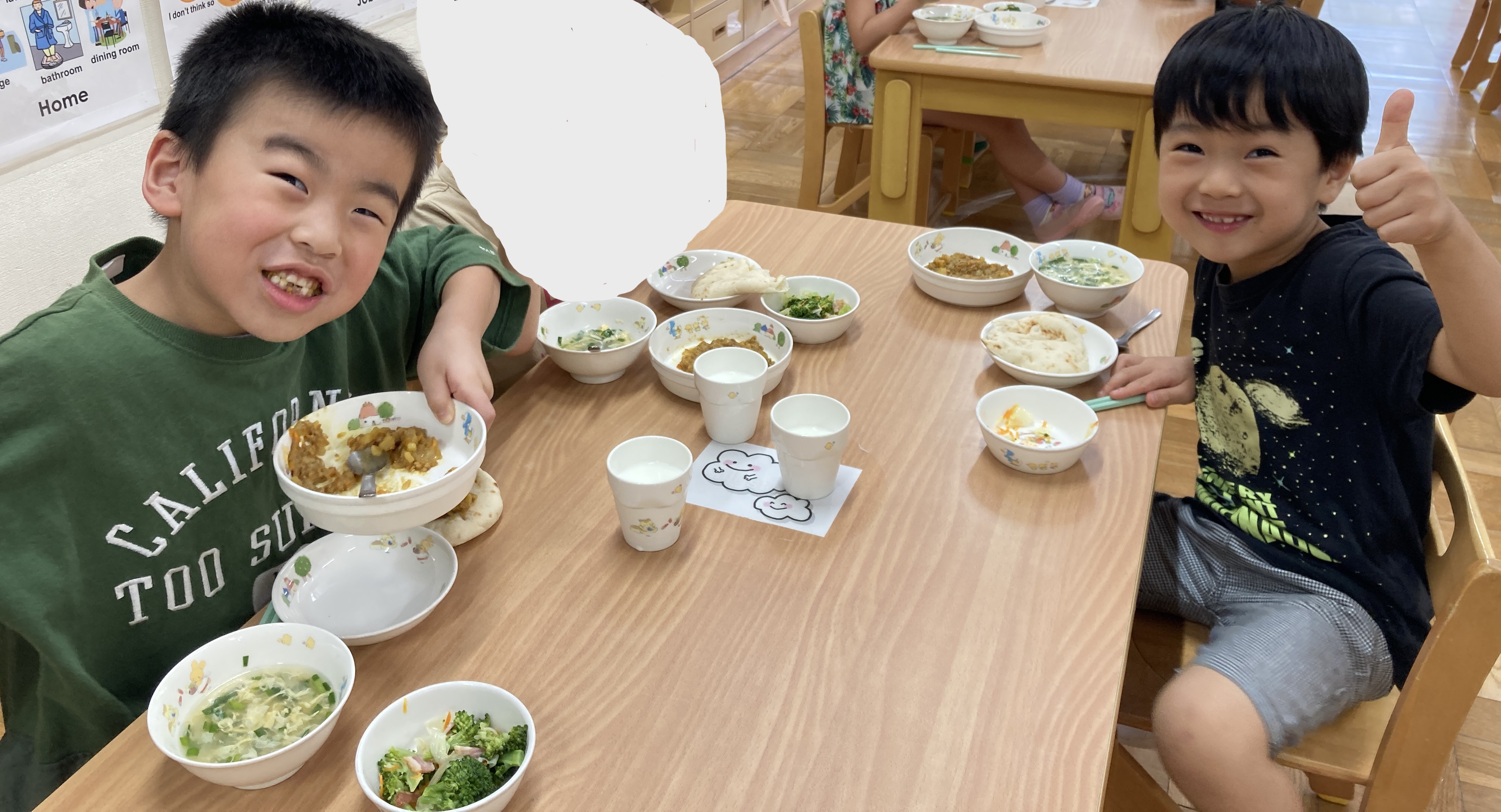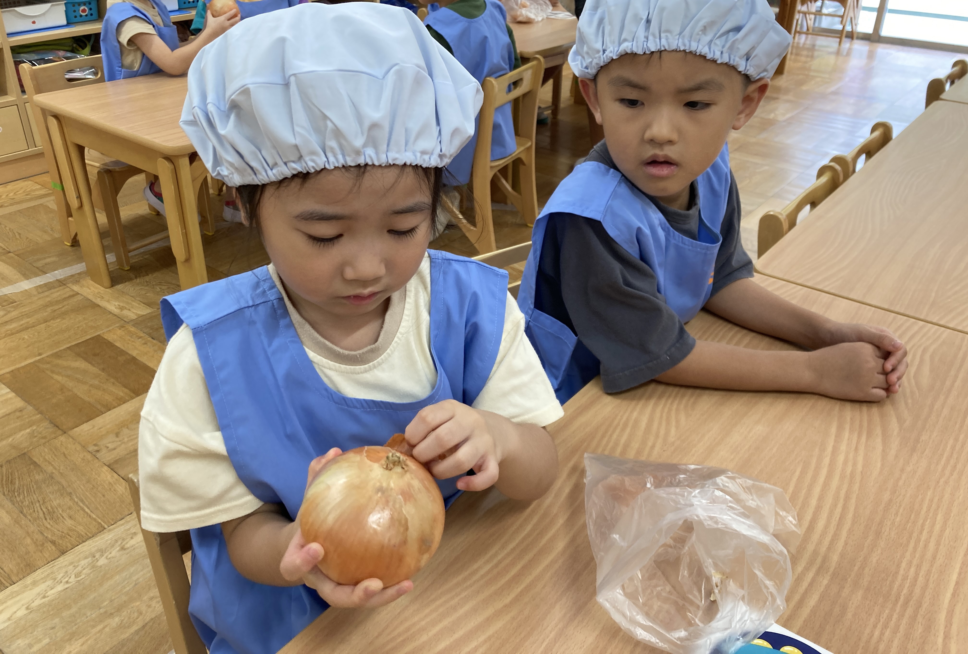 また、9月初めには、食育活動として、キーマカレー作りをしました。どうやって作るの?材料は、何?と興味津々の様子でした。玉ねぎやジャガイモなど手に取り、洗ったり、皮むきをしたりと真剣な表情でクッキングに参加していました。