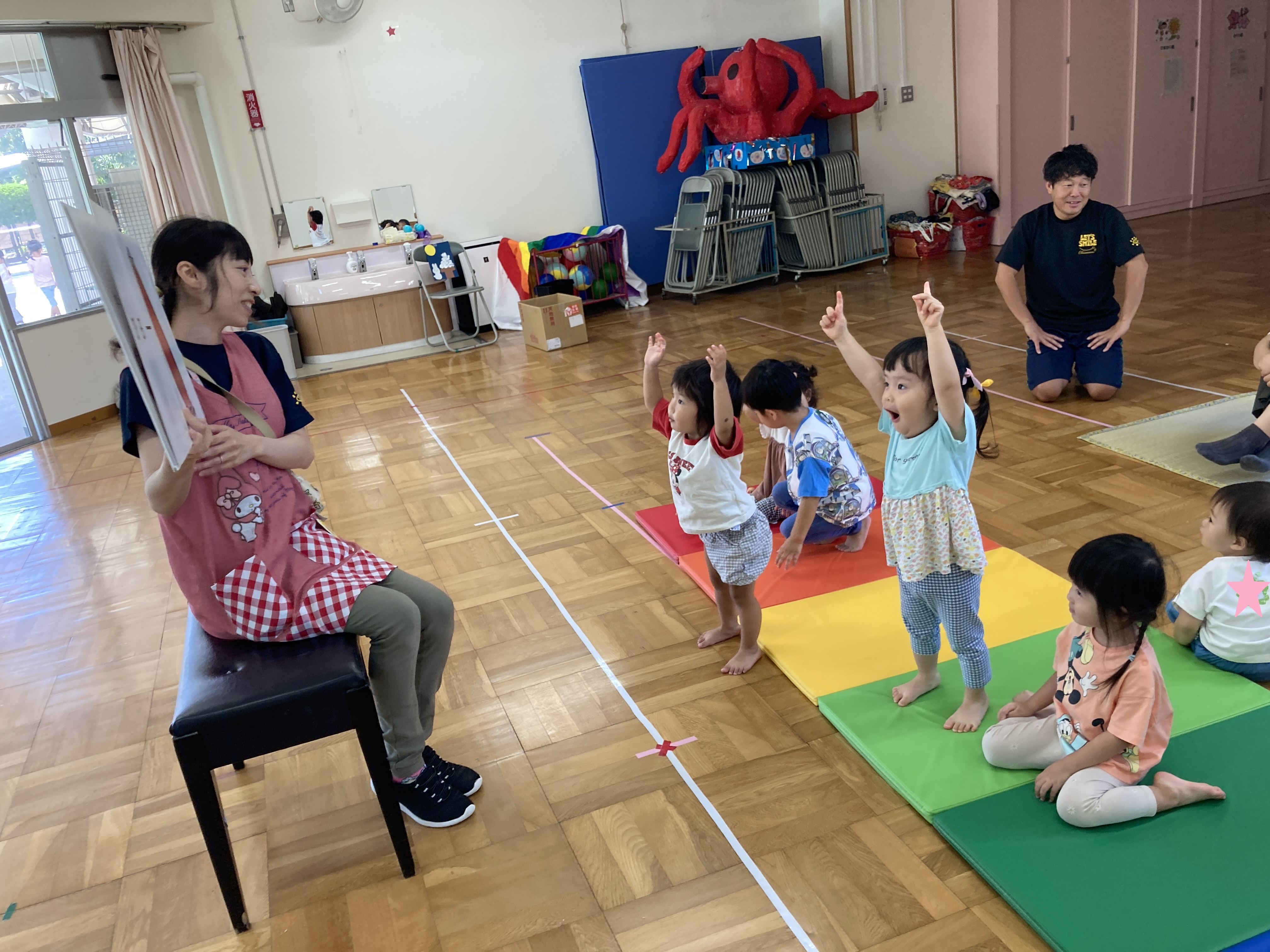 子ども達も知っている絵本なので保育士の読み聞かせに合わせながら身体を動かしたり声を出したりと楽しむ姿が見られました。嬉しそうに手を挙げる姿も見られますね!