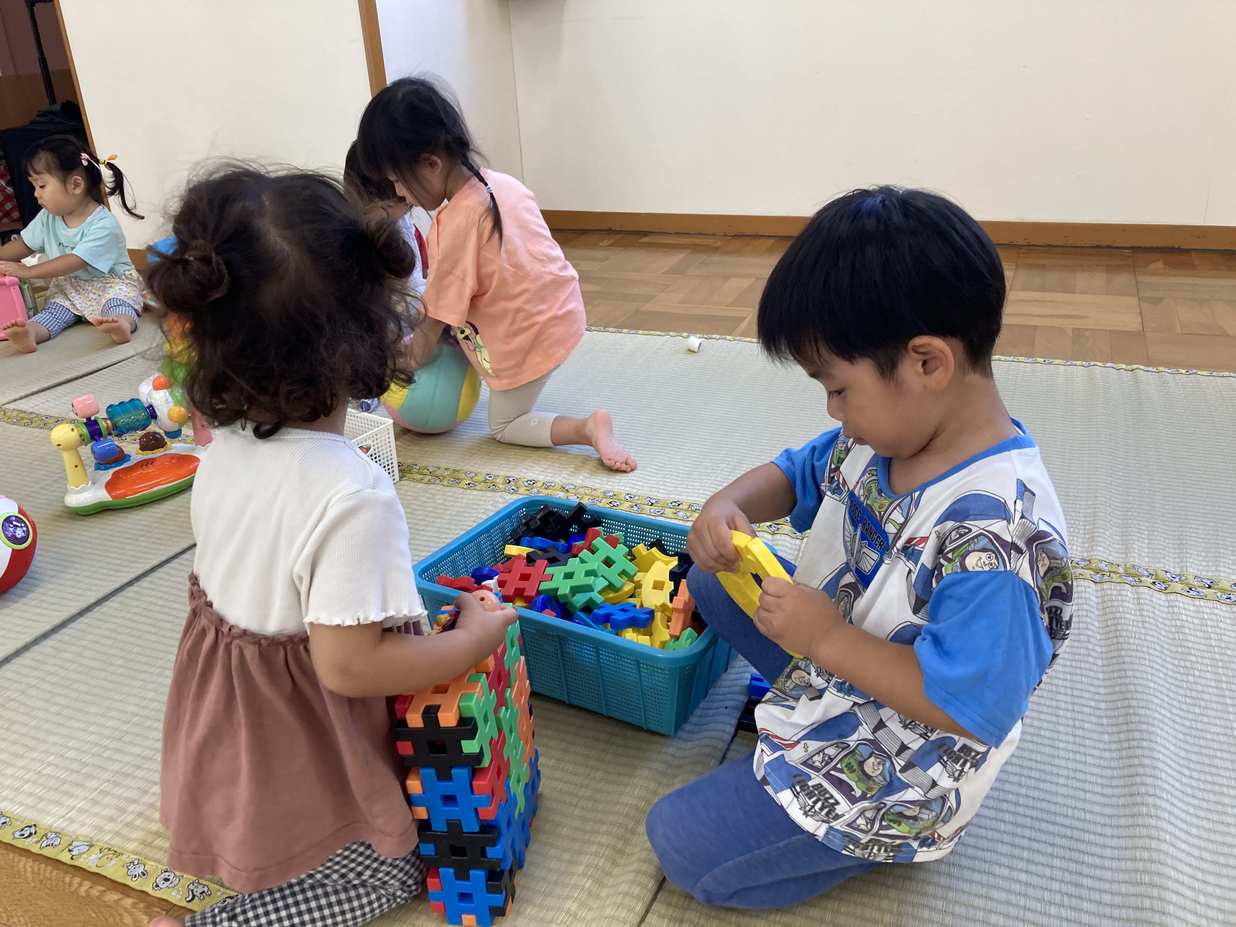 玩具遊びでは、たんぽぽ組のお友達と一緒に井形ブロックで遊び、「お家を作りたいね!」「一緒に遊ぼうよ!」とお互いに言い合う姿も見られその姿がとても微笑ましかったです!