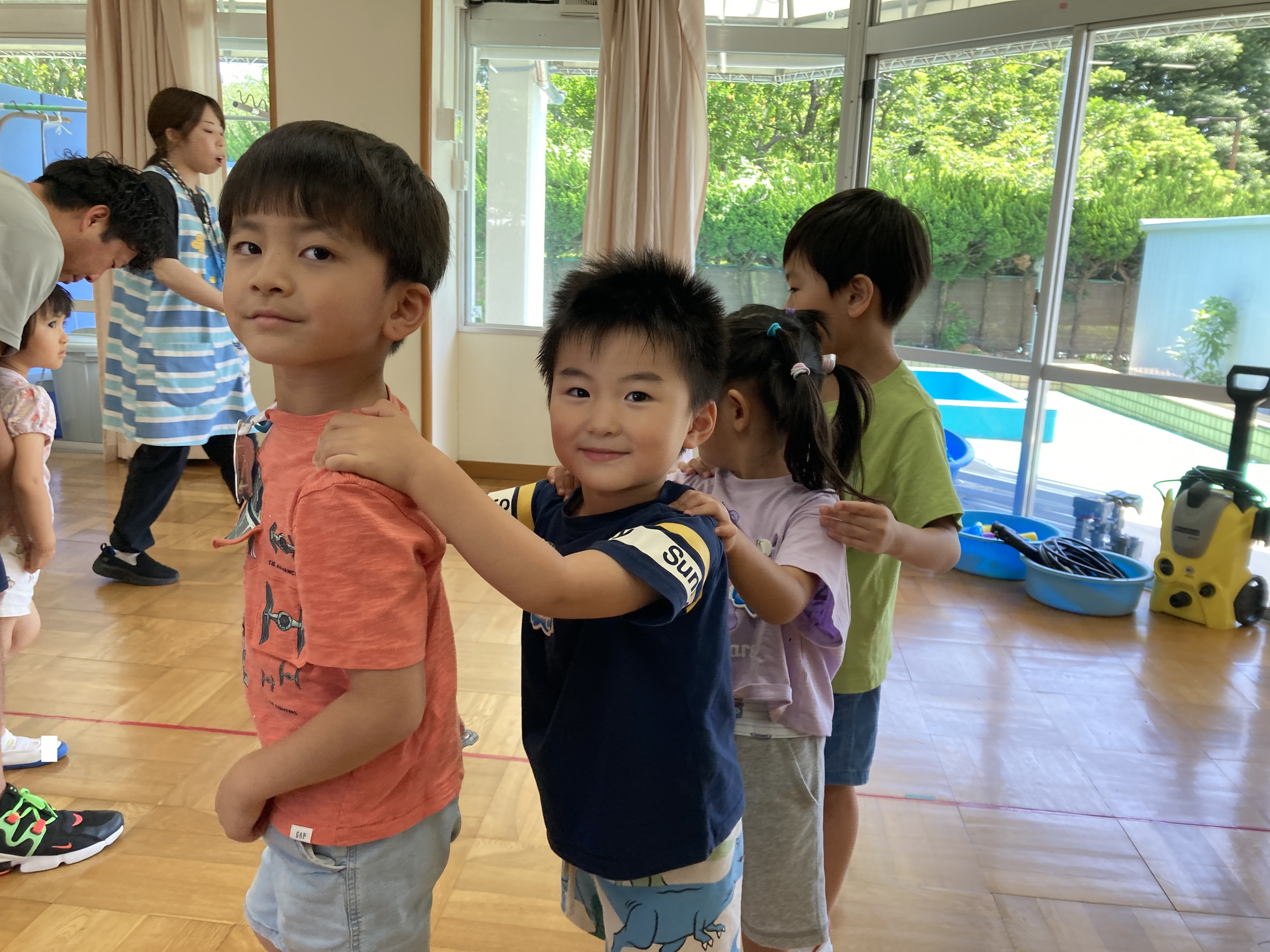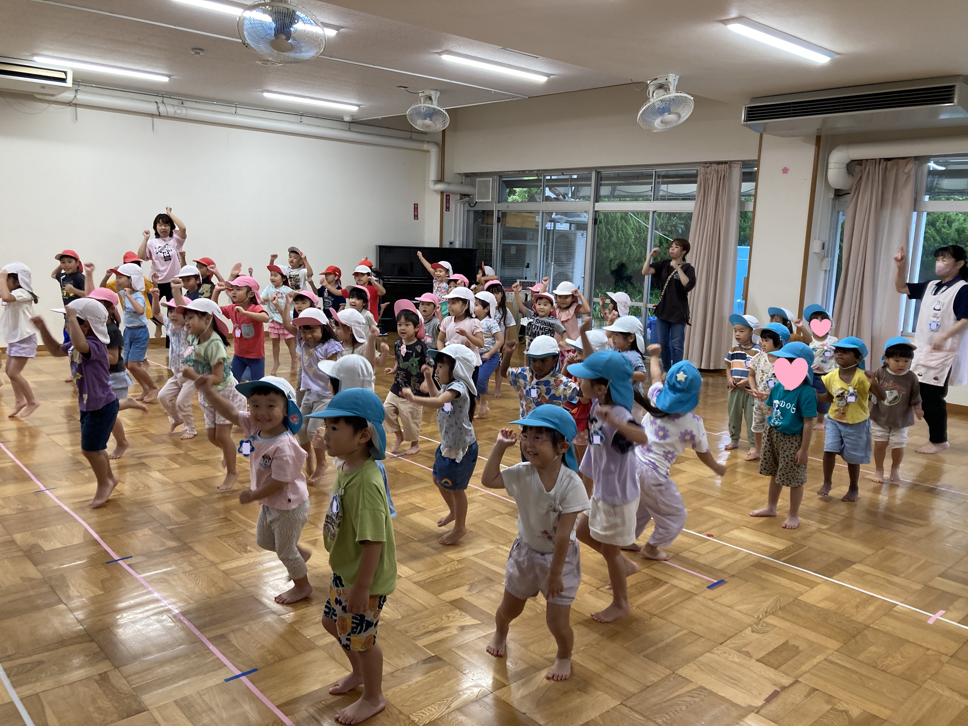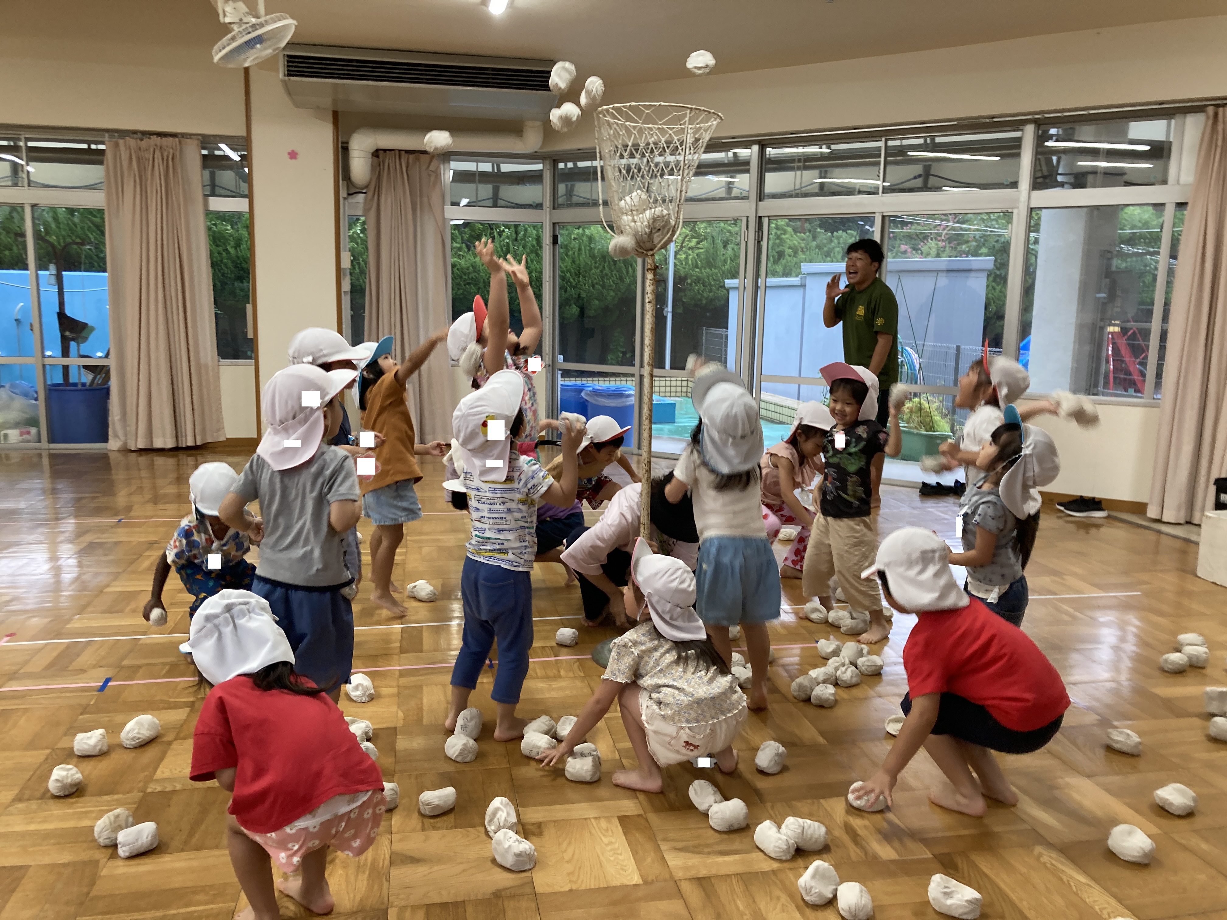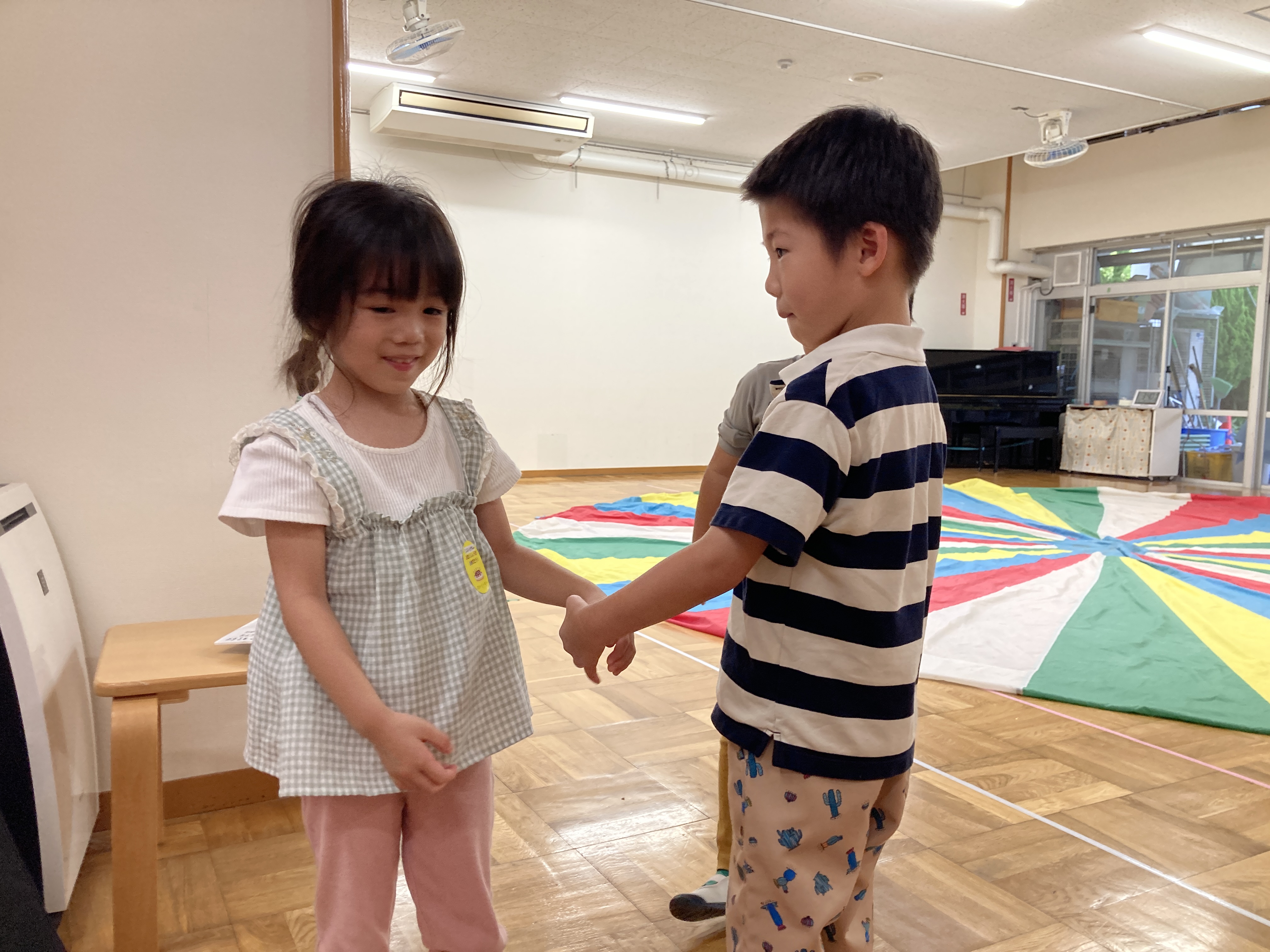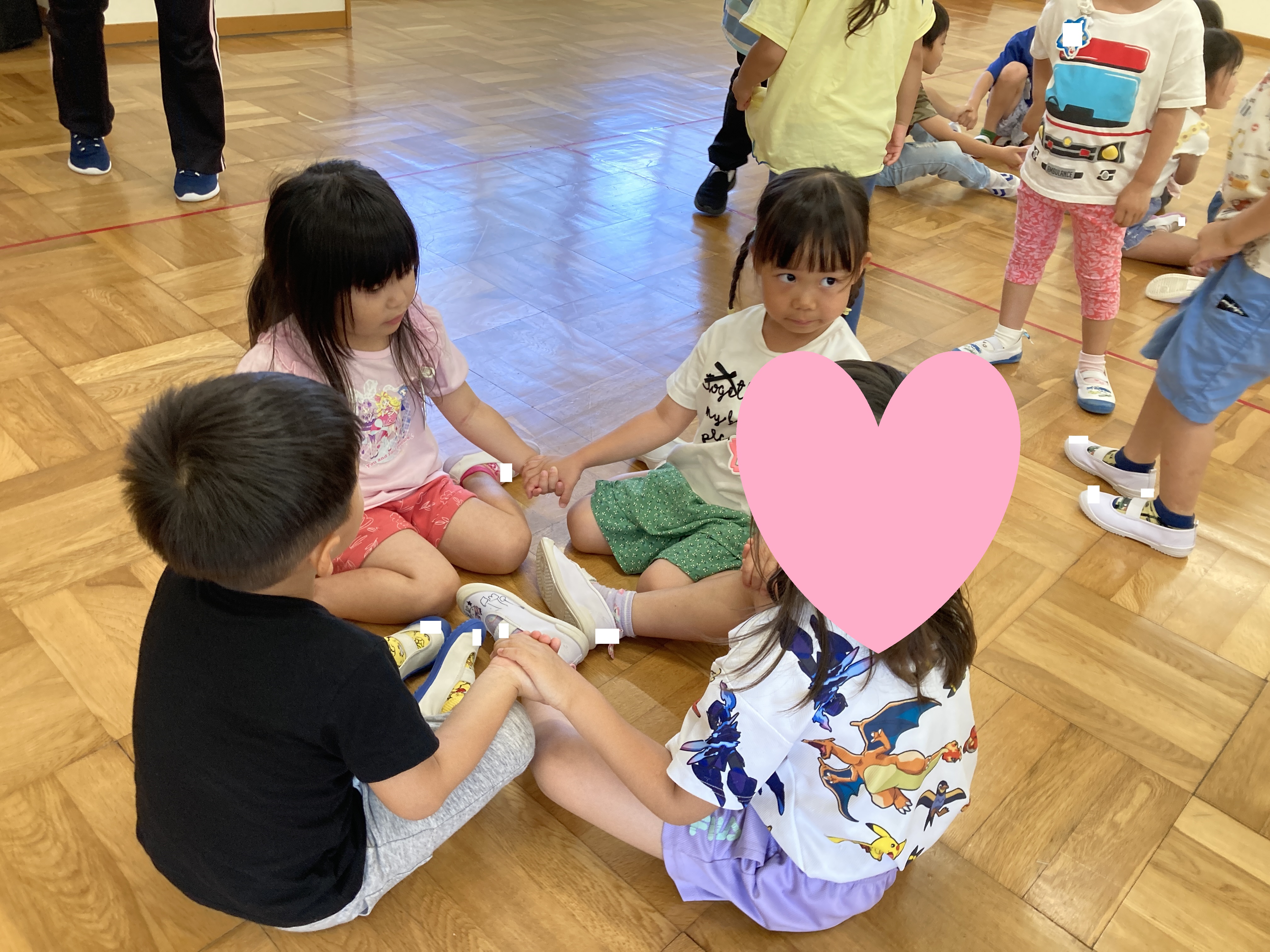 最初は、自己紹介をしたり普段はあまり一緒に遊んだことのないお友達と関わり、小さい子に優しくしようとしたり、上のクラスのお兄さん・お姉さんに優しくしてもらってお互いに楽しく過ごす事が出来ました。