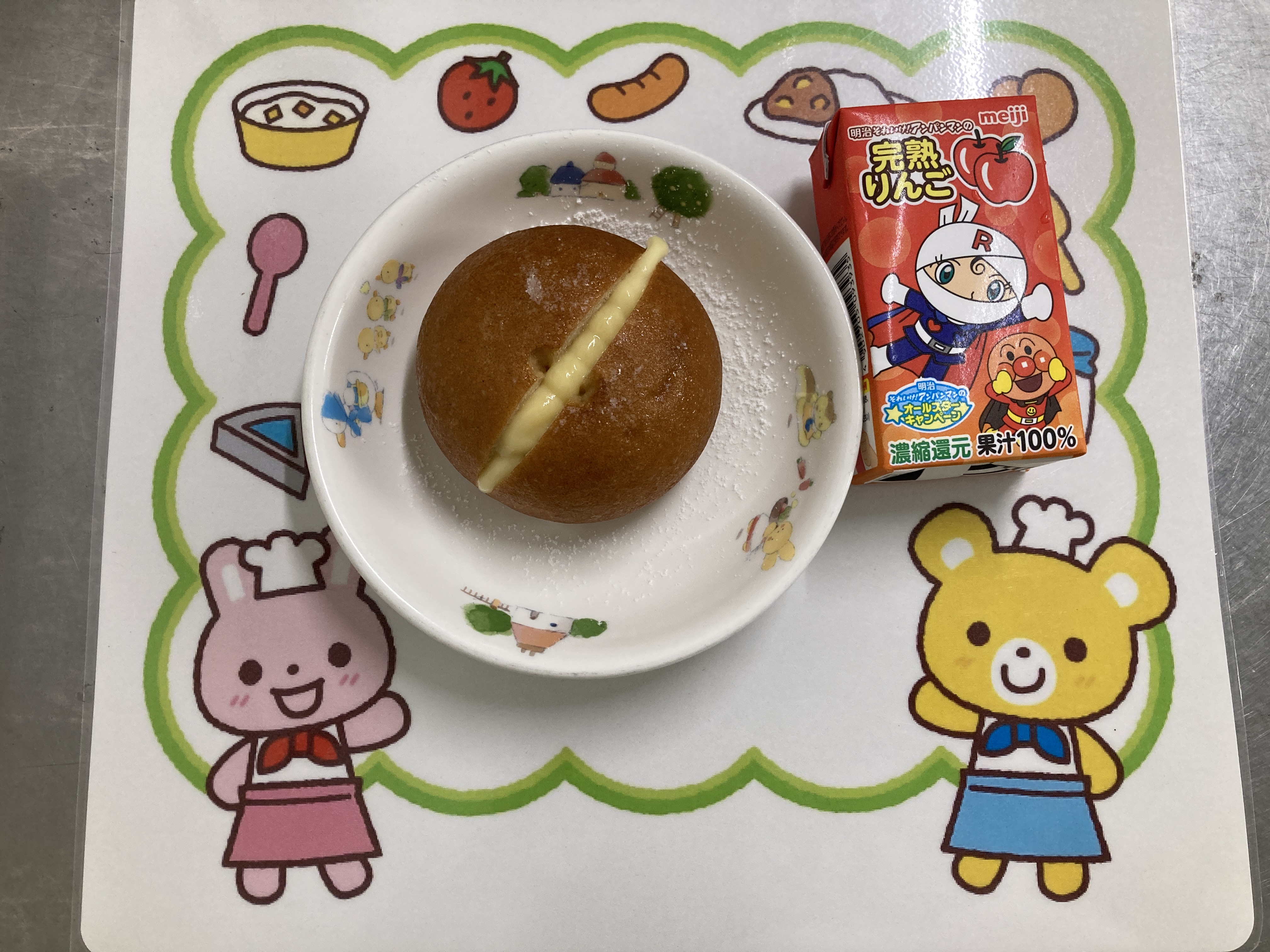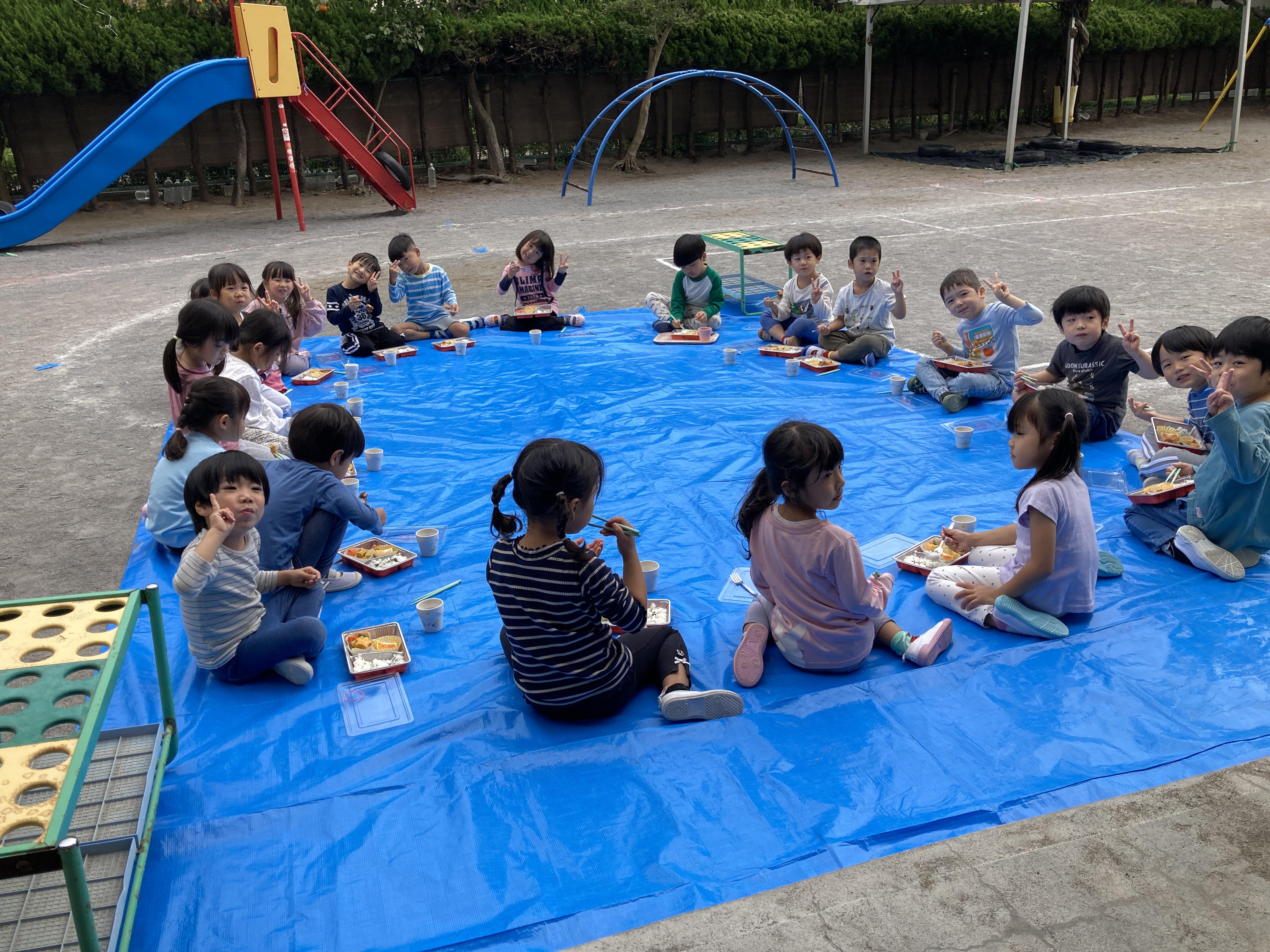 4歳児クラスのひまわり組は今日は園庭で食べました。「ごま塩の塩味が美味しい!」「唐揚げすごく美味しかった!」と好評でした。また来月のわくわく献立が楽しみですね。