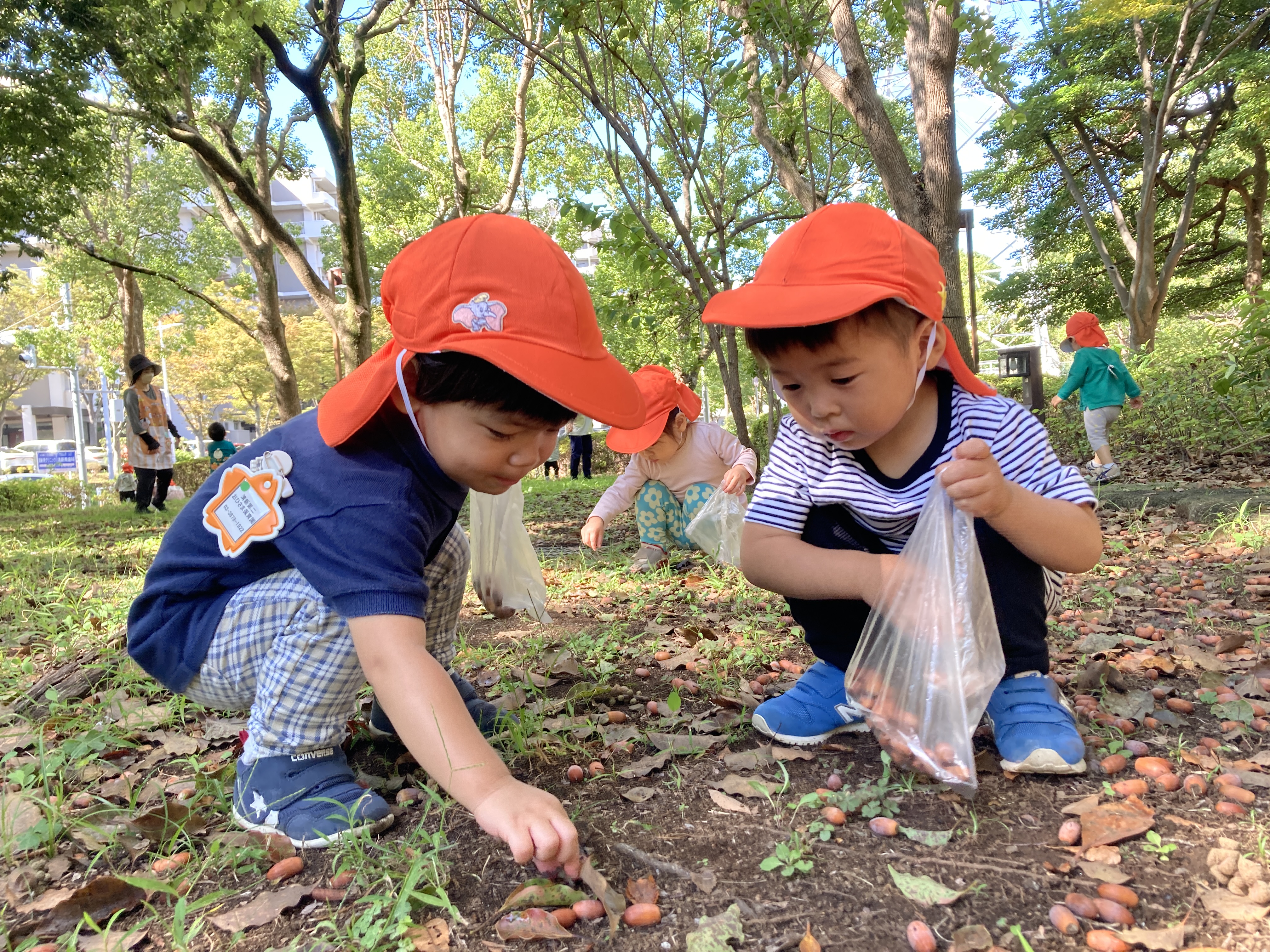 バスや飛行機が通りかかると、とっても嬉しそうな表情で「ばいば~い!」と手を振る可愛らしい姿も見られます!どんぐり拾いにも興味津々なつくし組の子ども達!
