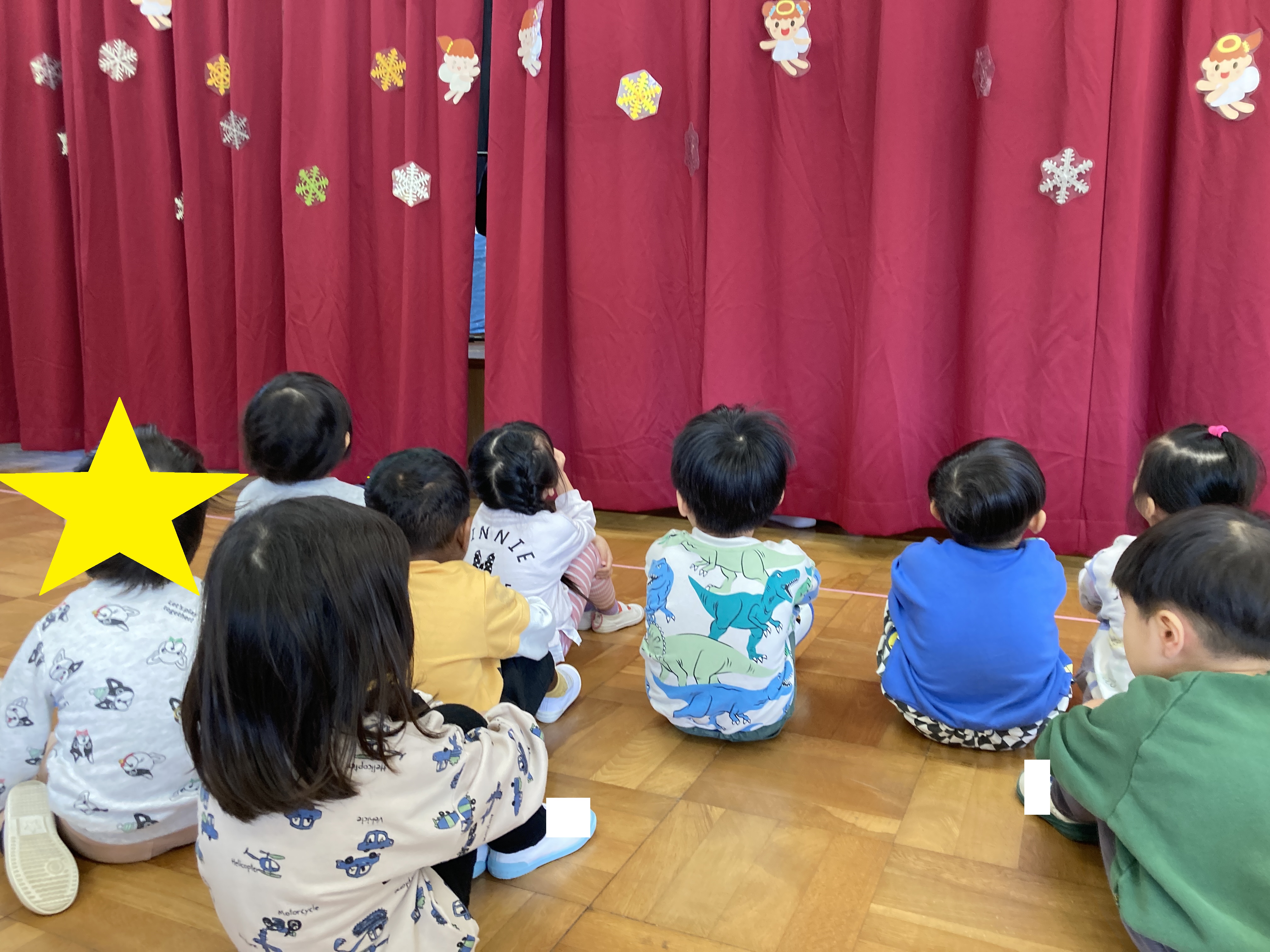 他のクラスの劇遊びの練習にも興味津々で見ています。