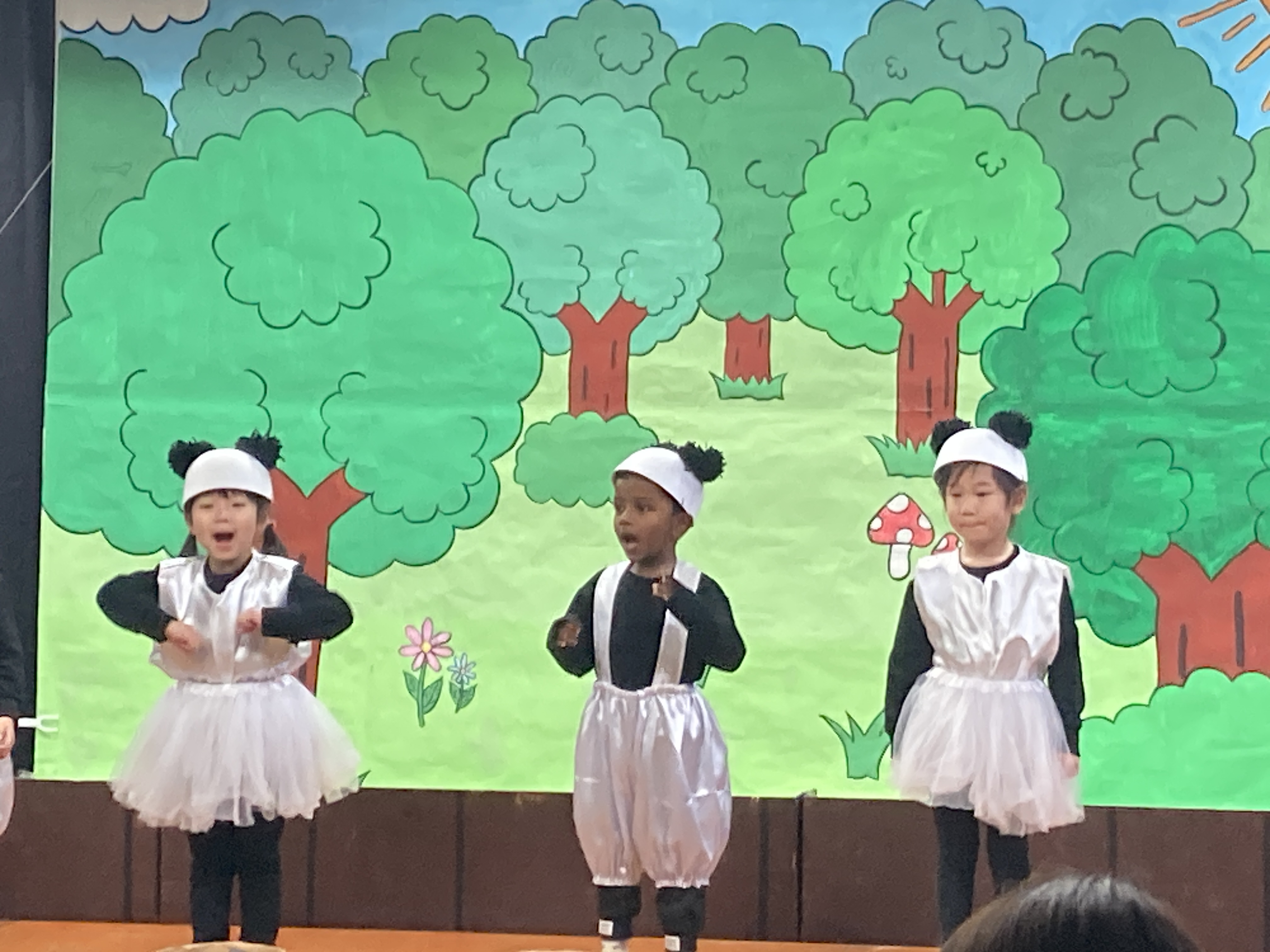 次はちゅうりっぷ組による発表です。劇で「森のおふろ」を行っている様子です。パンダ役になりきって楽しそうに参加していますね!元気よくお歌を歌いながら演じています。