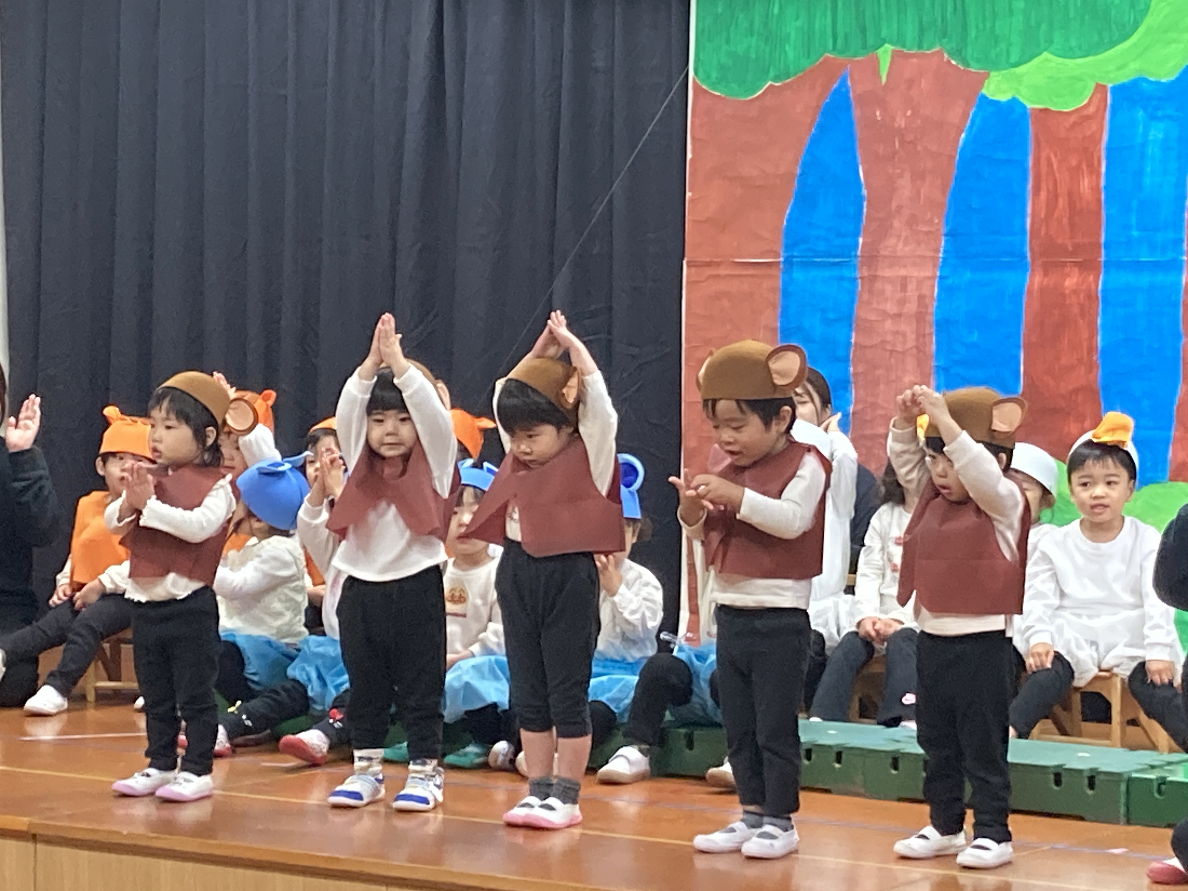 次はたんぽぽ組による発表です。絵本の「素敵な帽子屋さん」による劇ごっこを行っている様子です。様々な動物が登場するのですがおさる役の子ども達が手遊びを行っている姿です。