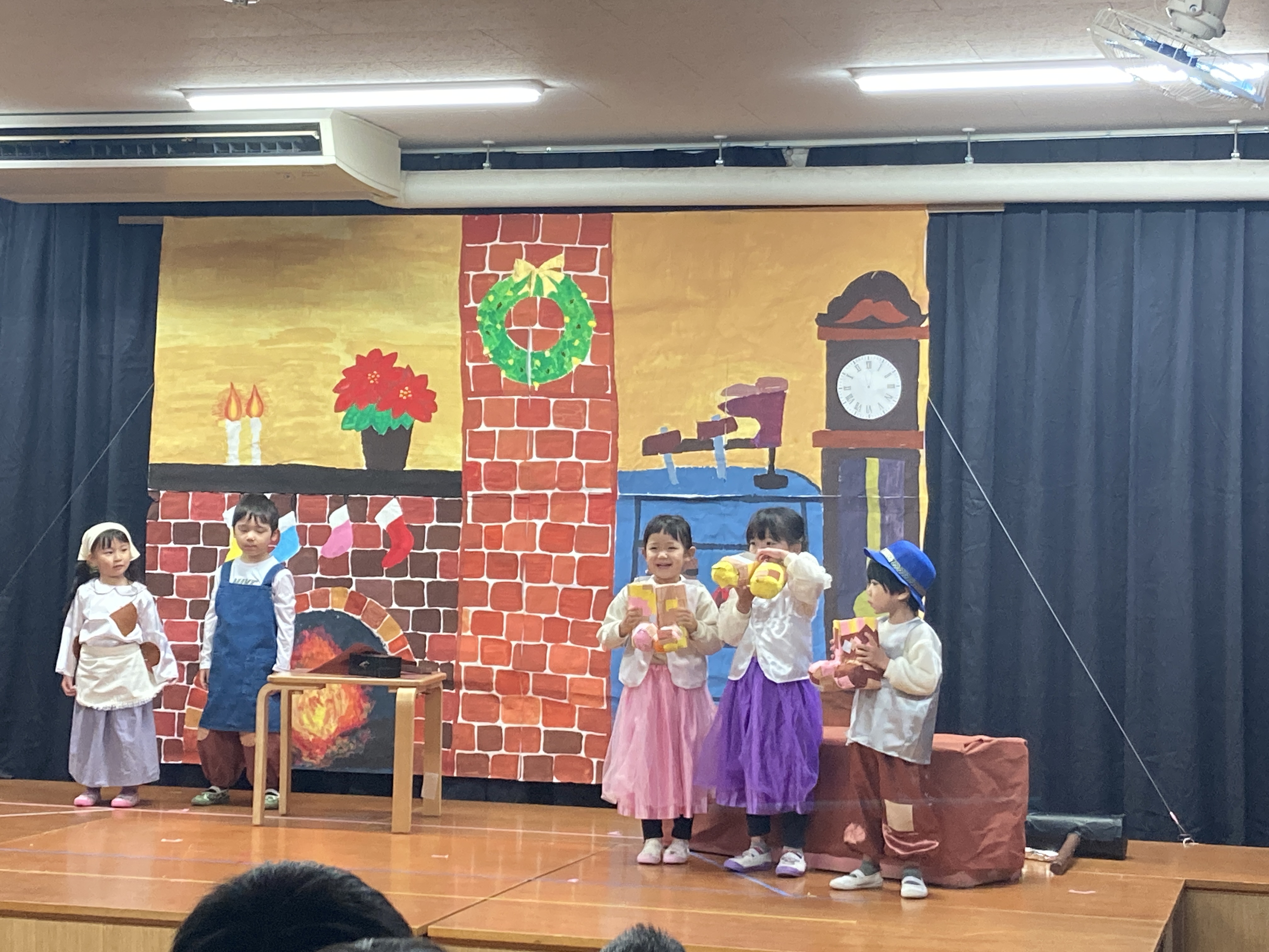 次はひまわり組による発表です。劇で「こびとのくつや」を行っている様子です。一人ひとりの台詞があり役になりきりながら参加しています。自信を持って台詞を言う姿が見られ昨年度よりも成長している姿が見られますね!子ども達の表情が可愛らしいですね!