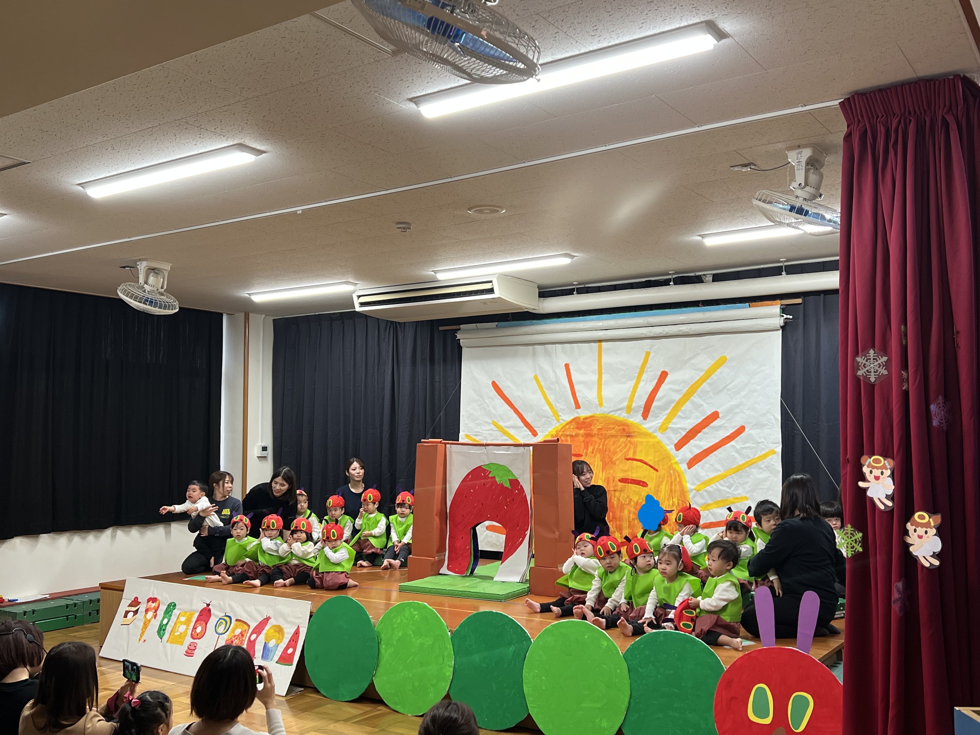 つくし組による発表です。絵本の「はらぺこあおむし」の絵本の劇ごっこを行っている姿です。皆、あおむしになっていてとても可愛いですね!