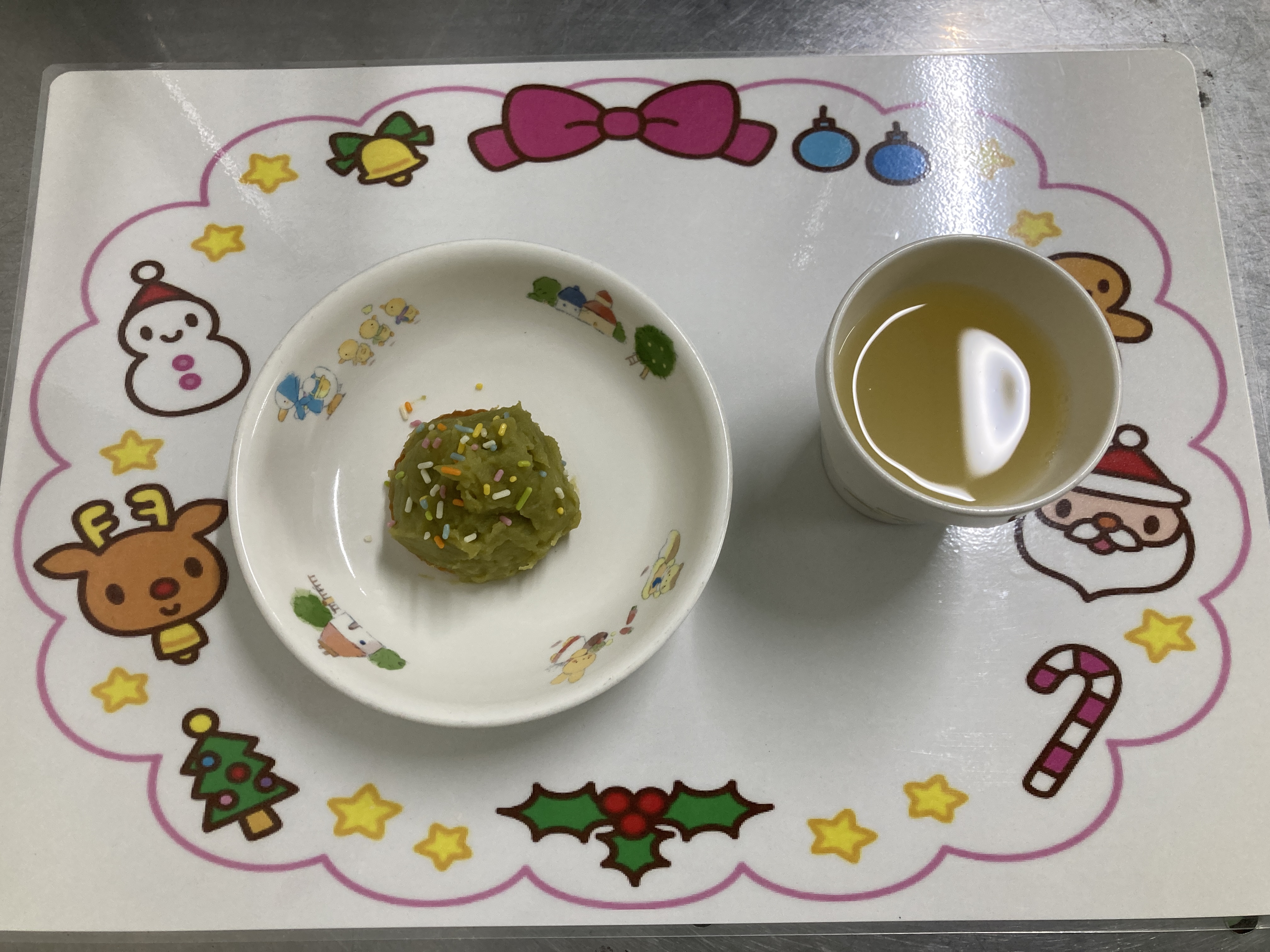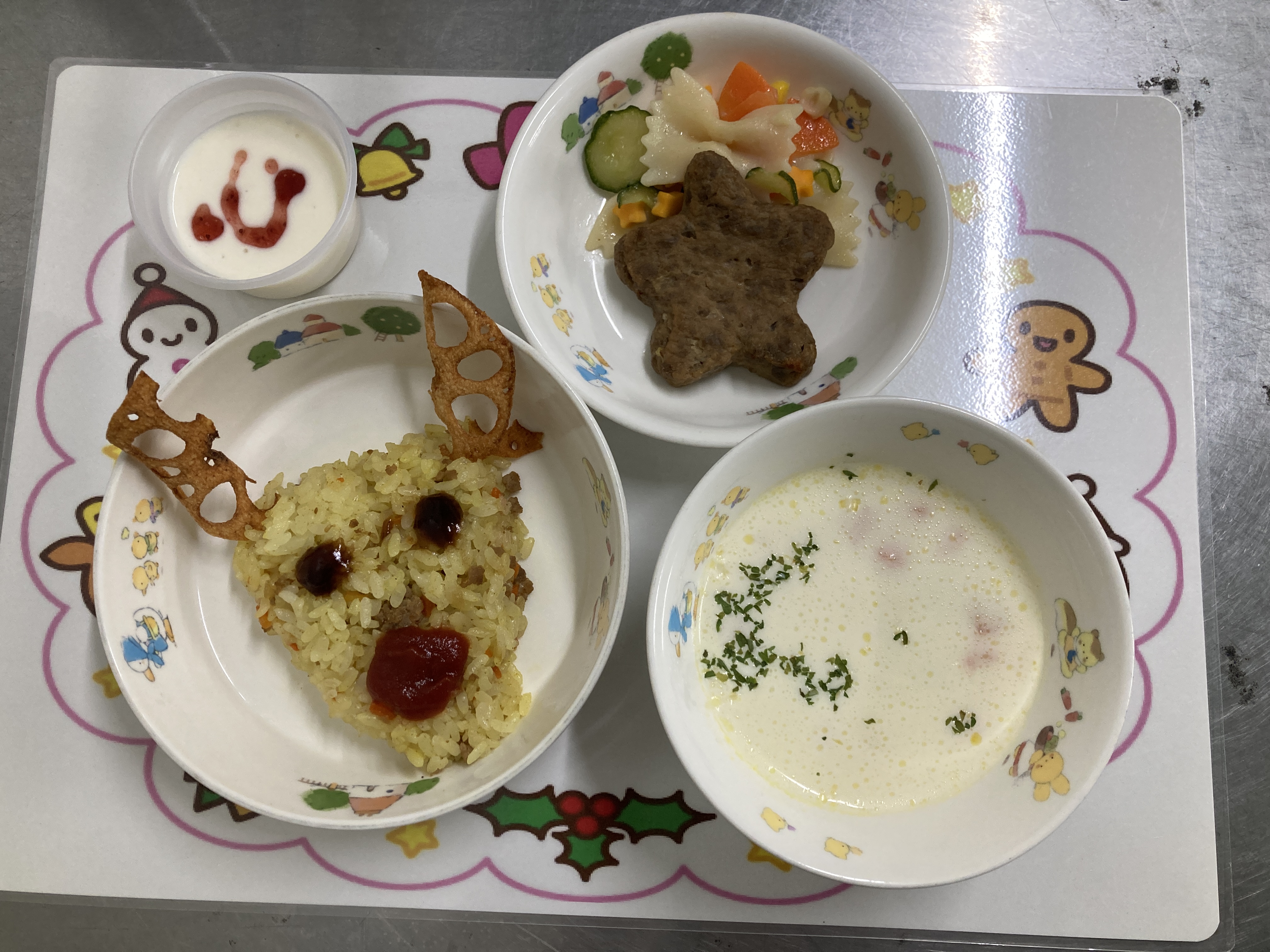12月なのでクリスマス風の献立に「トナカイのピラフ美味しかったよ」「今日の献立は全部食べられた!」と喜ぶ声が聞こえてきました。