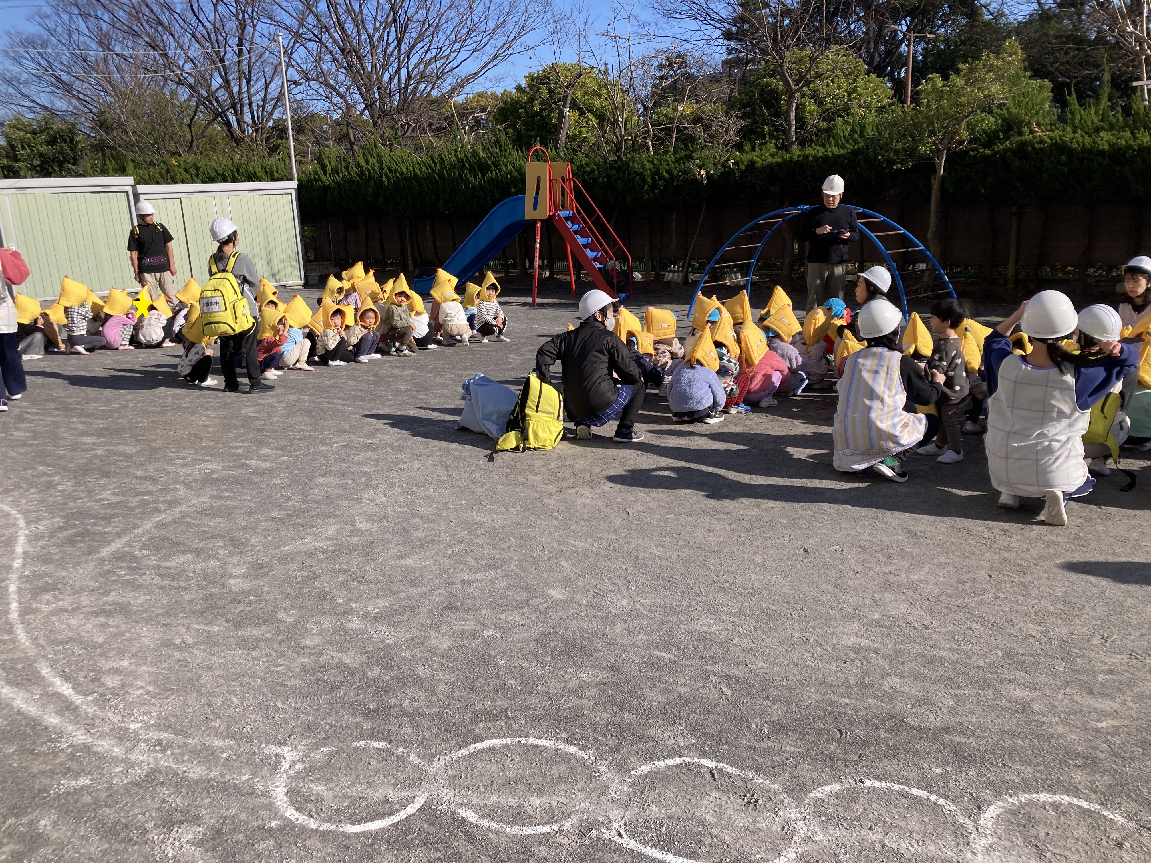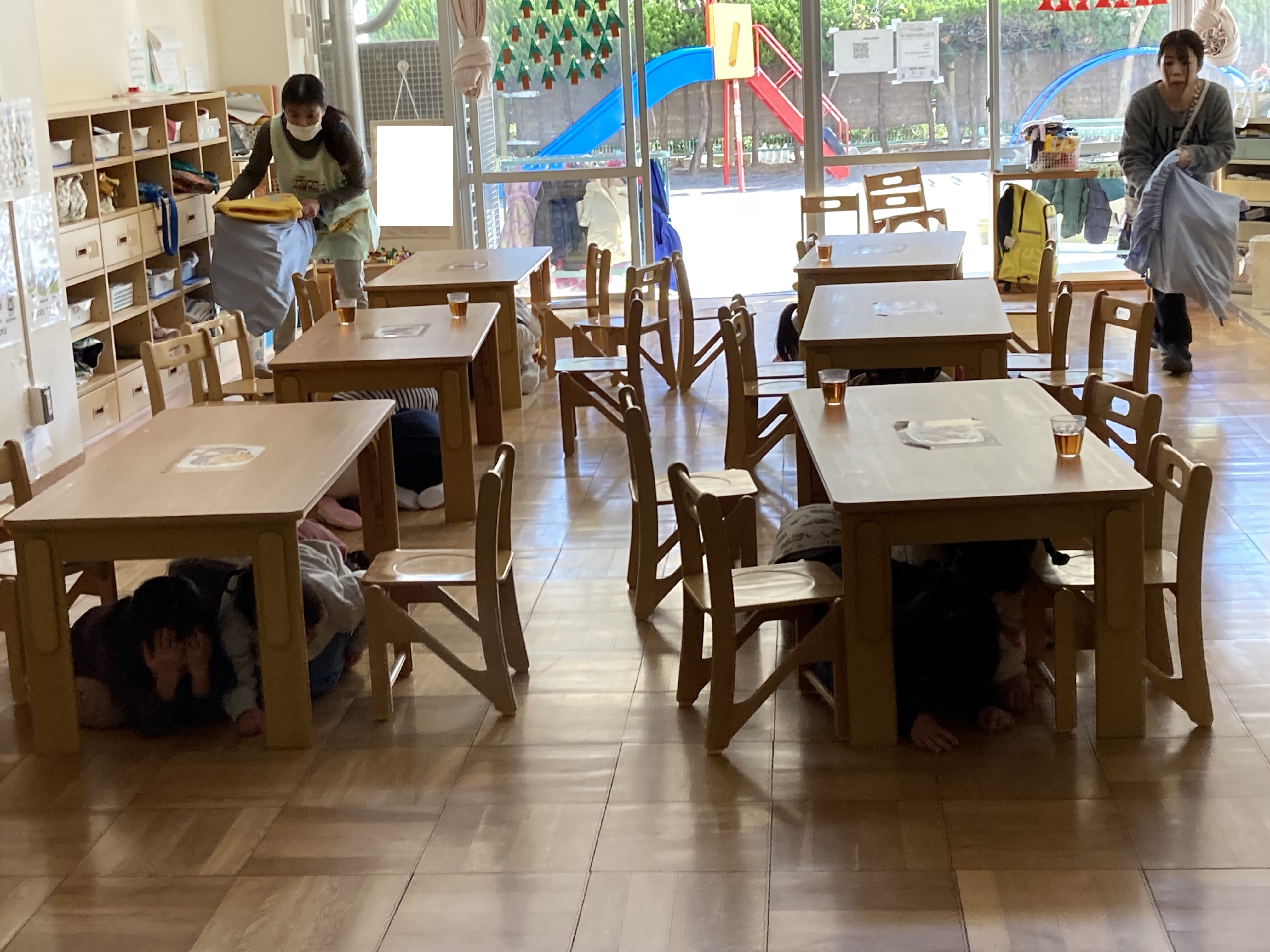 震度5の地震の放送が流れると、どのクラスも園庭の中央や机の下と直ぐに避難を、身の安全の確保をしていました。