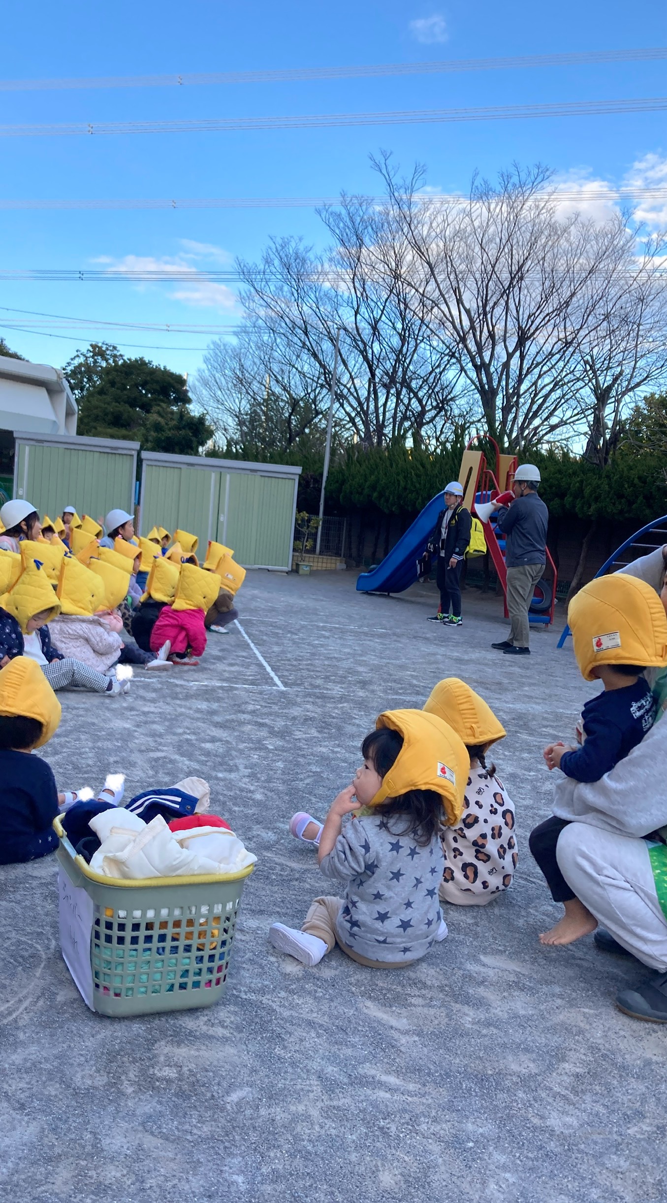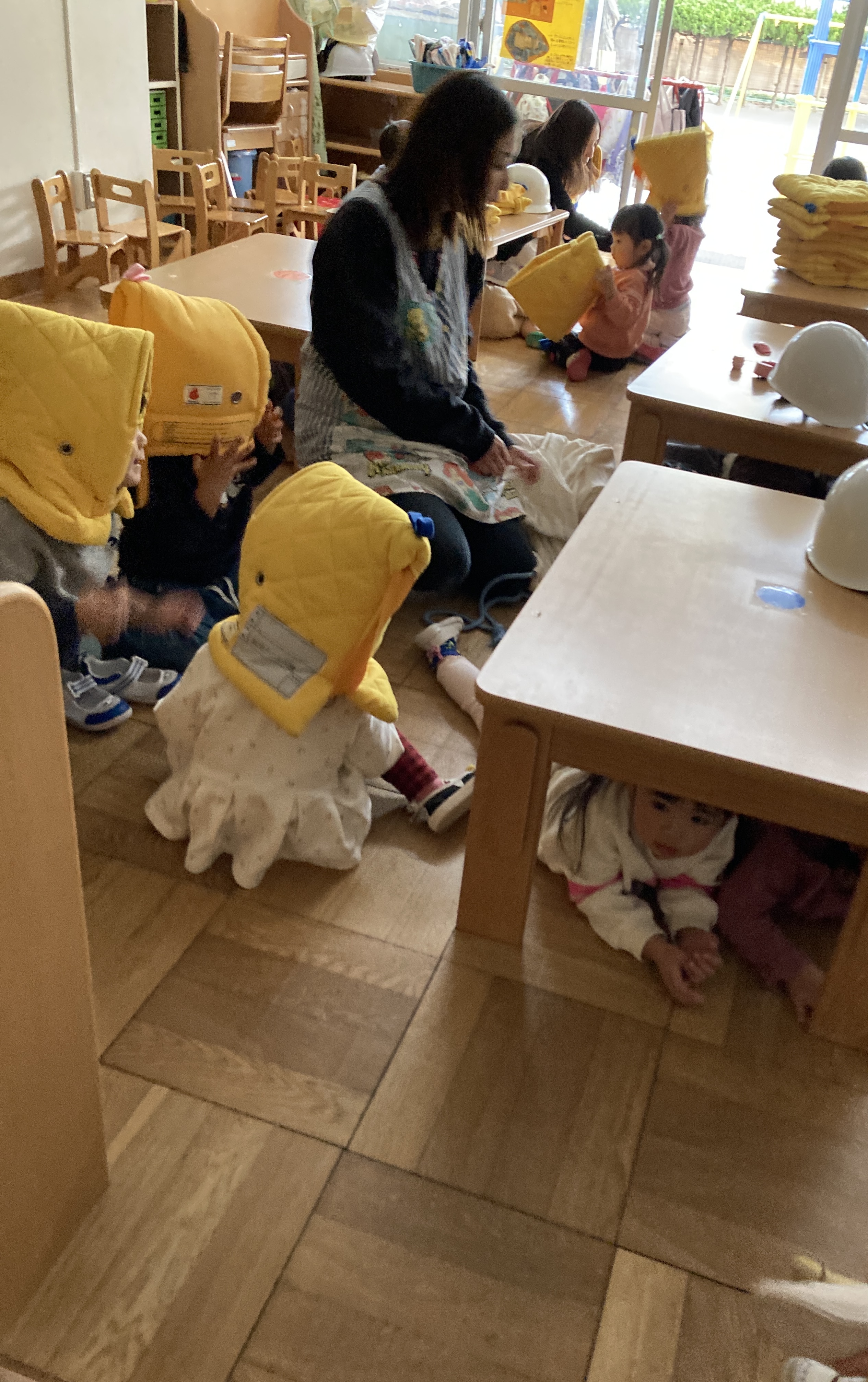 放送を聞いて机の下に隠れたり、防災頭巾を被って園庭へ避難しましたよ。