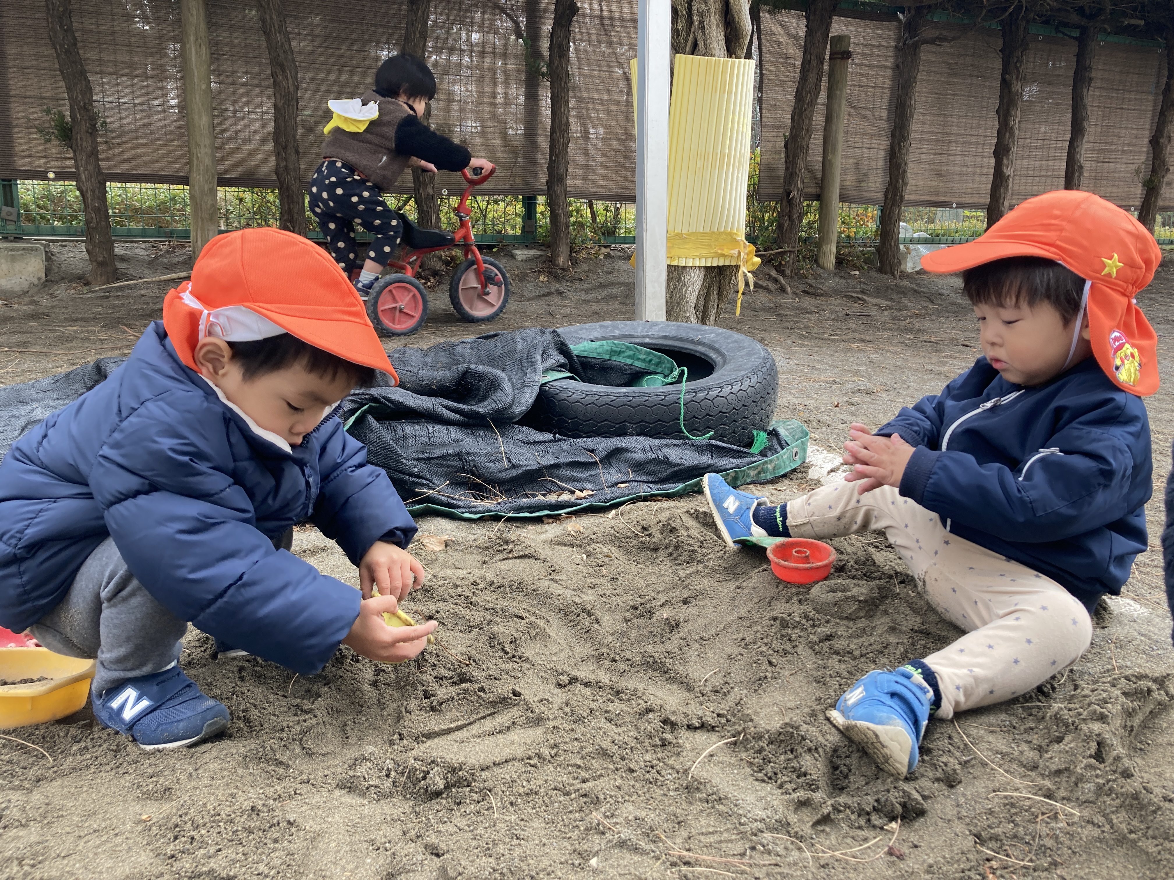 また、砂場遊びでは自分でスコップで砂を入れてひっくり返し、型抜きが出来るようになりました。ぎゅうぎゅうと砂を押し込まないと、思った通りの形にならないことに気づき、スコップや手で押し固める友だちが多いです。出来上がると「ケーキできた!」「ドーナツ!チョコ!」と言って大事にしたり、食べる模倣をしたりして遊んでいます。