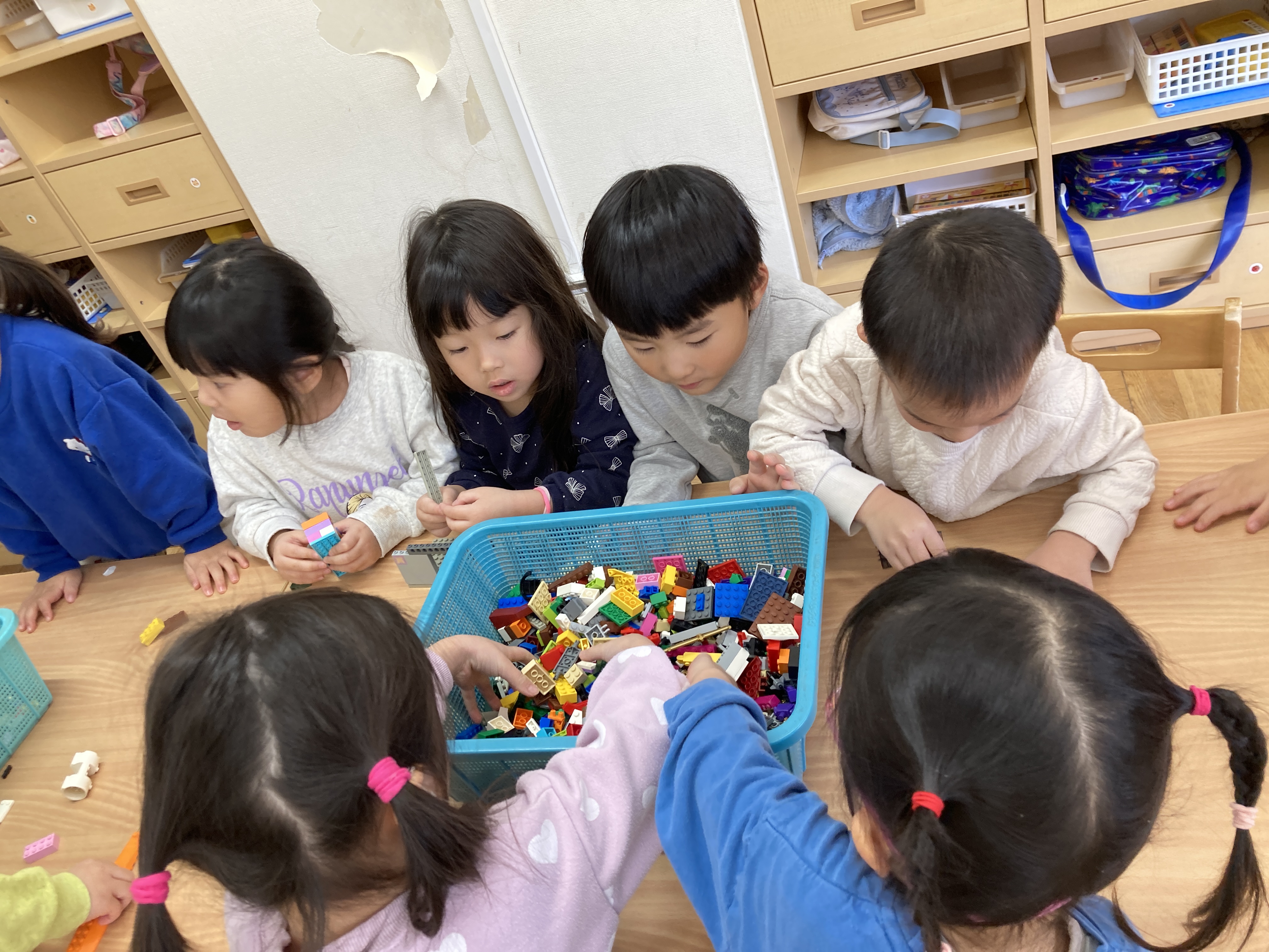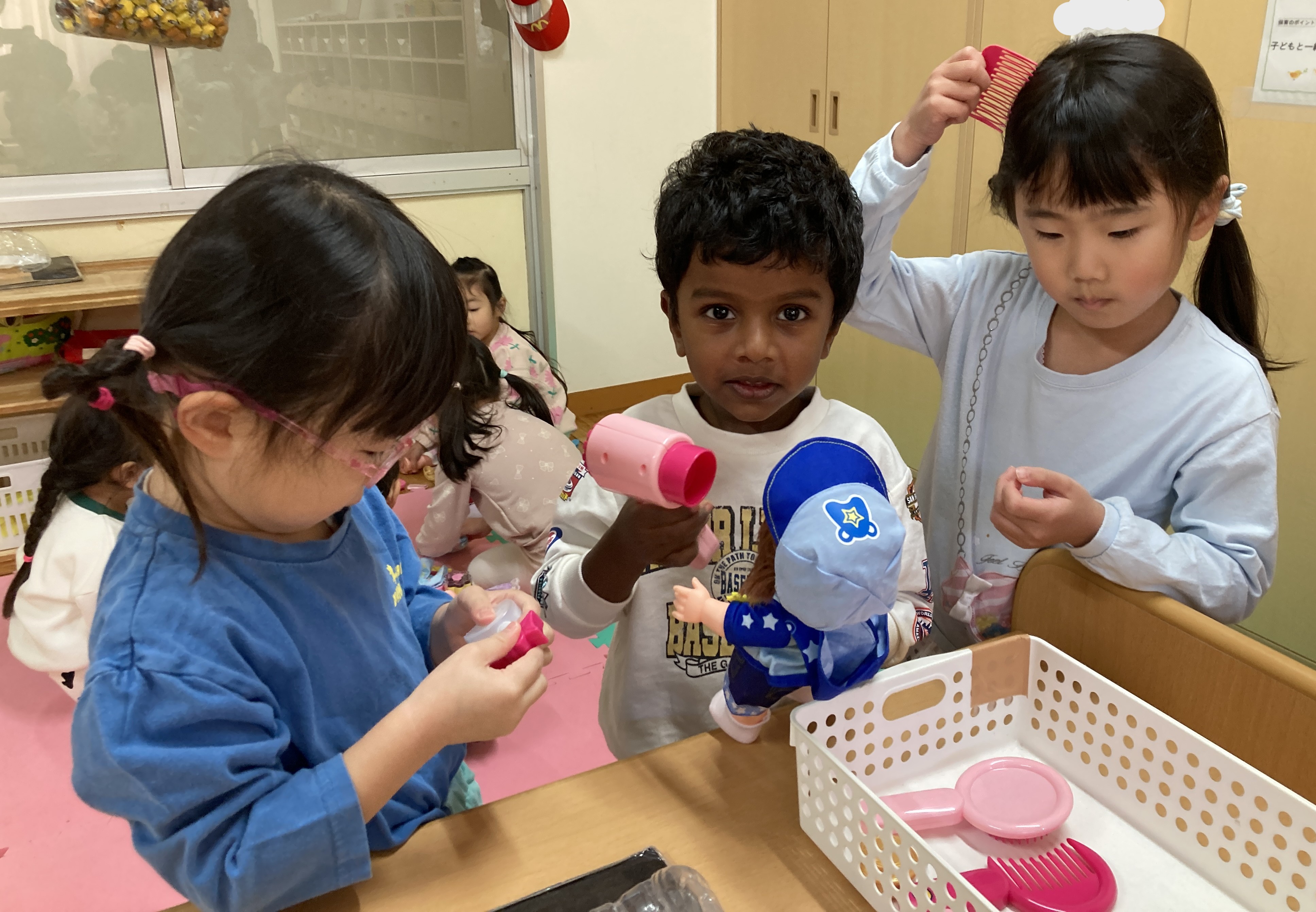 室内遊びの様子も紹介します。1月になり、レゴブロックでも遊ぶようになりました。どんなものを作ろうかな?と考えながら、様々なパーツを組み合わせ車や船などを作っています。またメルちゃん人形も増え、ドライヤーで髪の毛を乾かしたり、くしで髪の毛をとかしてあげたりお世話をすることを楽しんでいます。