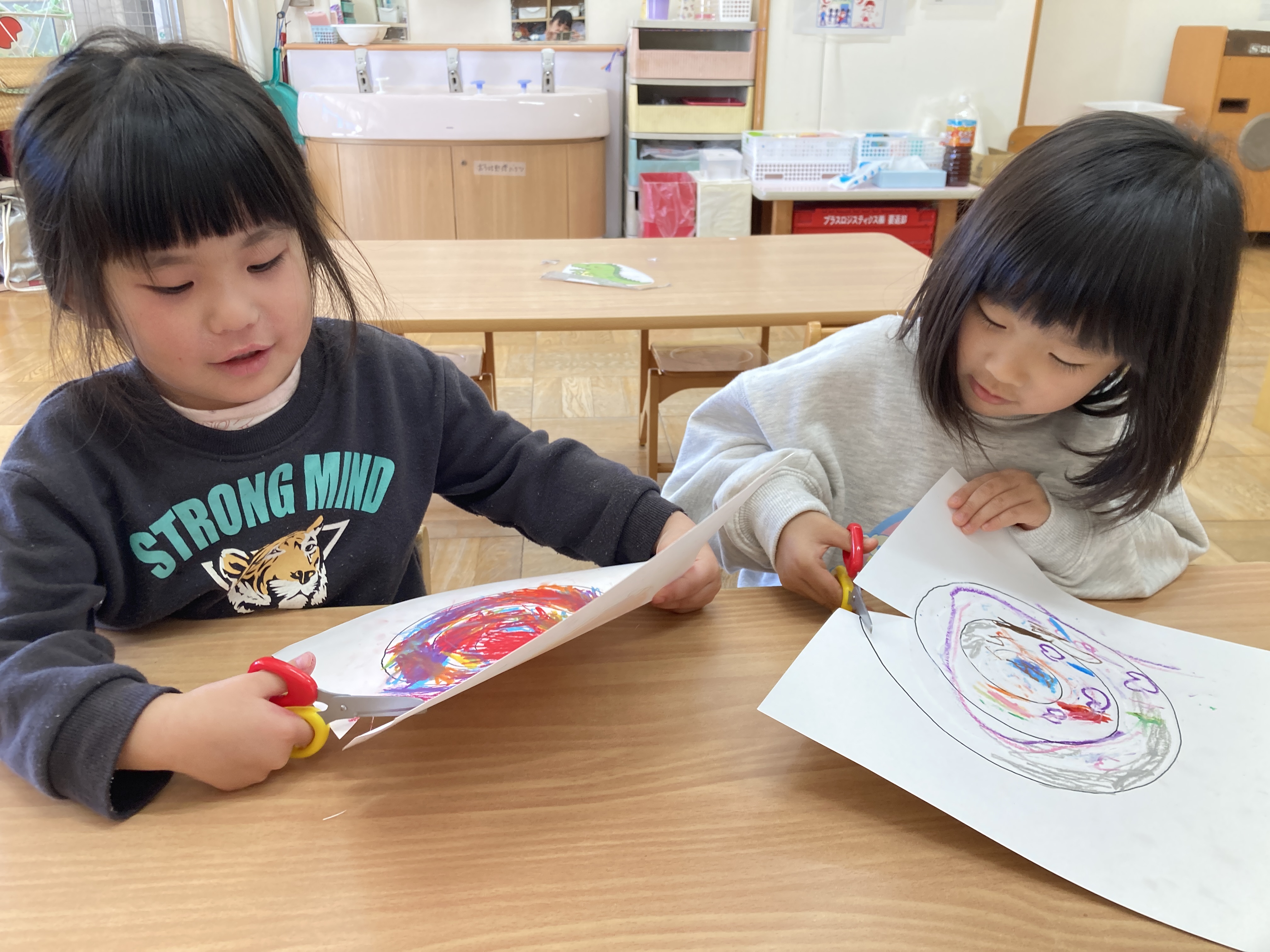 くるくる凧を作りました!クレヨンで好きな模様を描き、線の上をはさみで切りました。