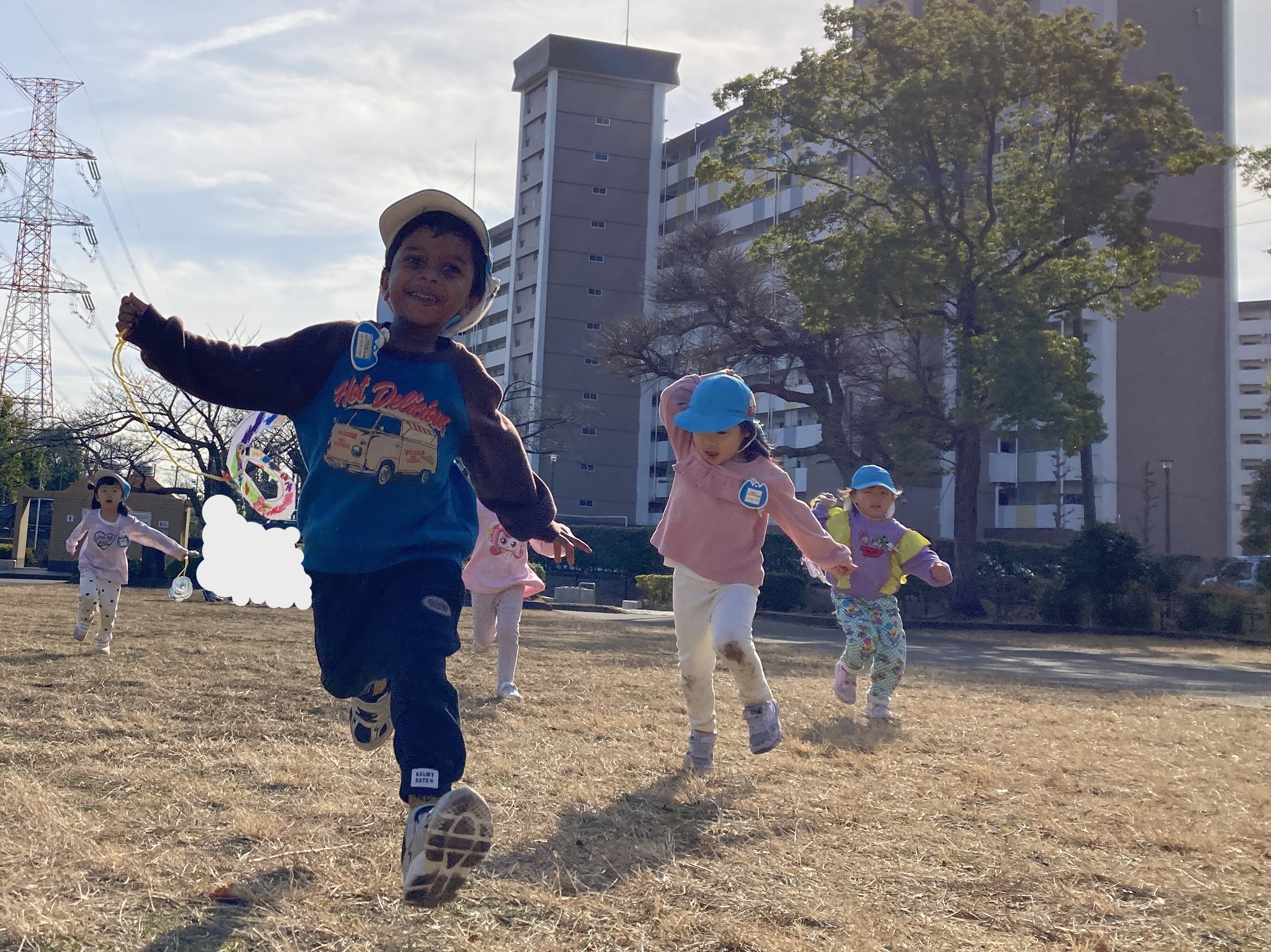 出来上がった凧を持って、公園にお散歩に行き、凧あげを楽しみました。