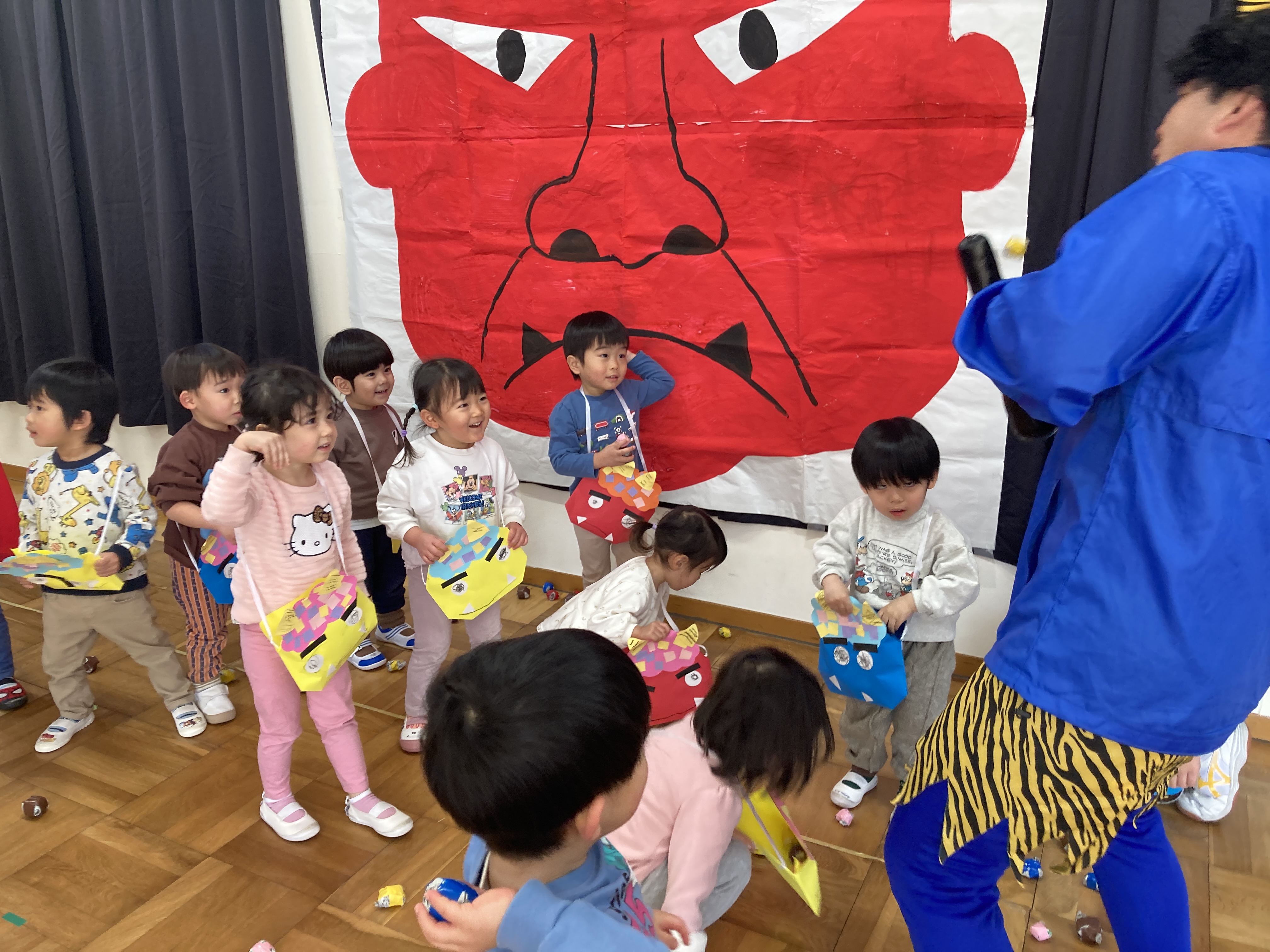 1・2歳児は保育士の顔が見えていたのですが、笑顔で鬼に向かって豆を当てていました。「せんせいがおにだー!」となんだか嬉しそうでした。