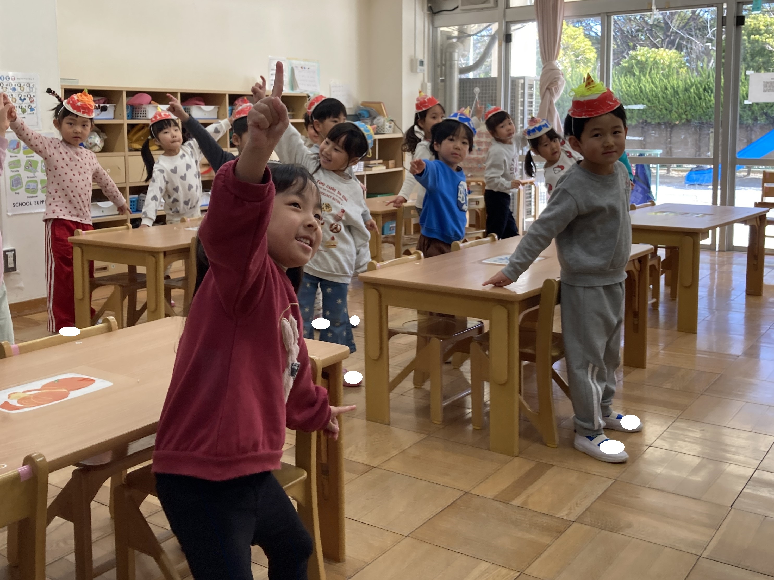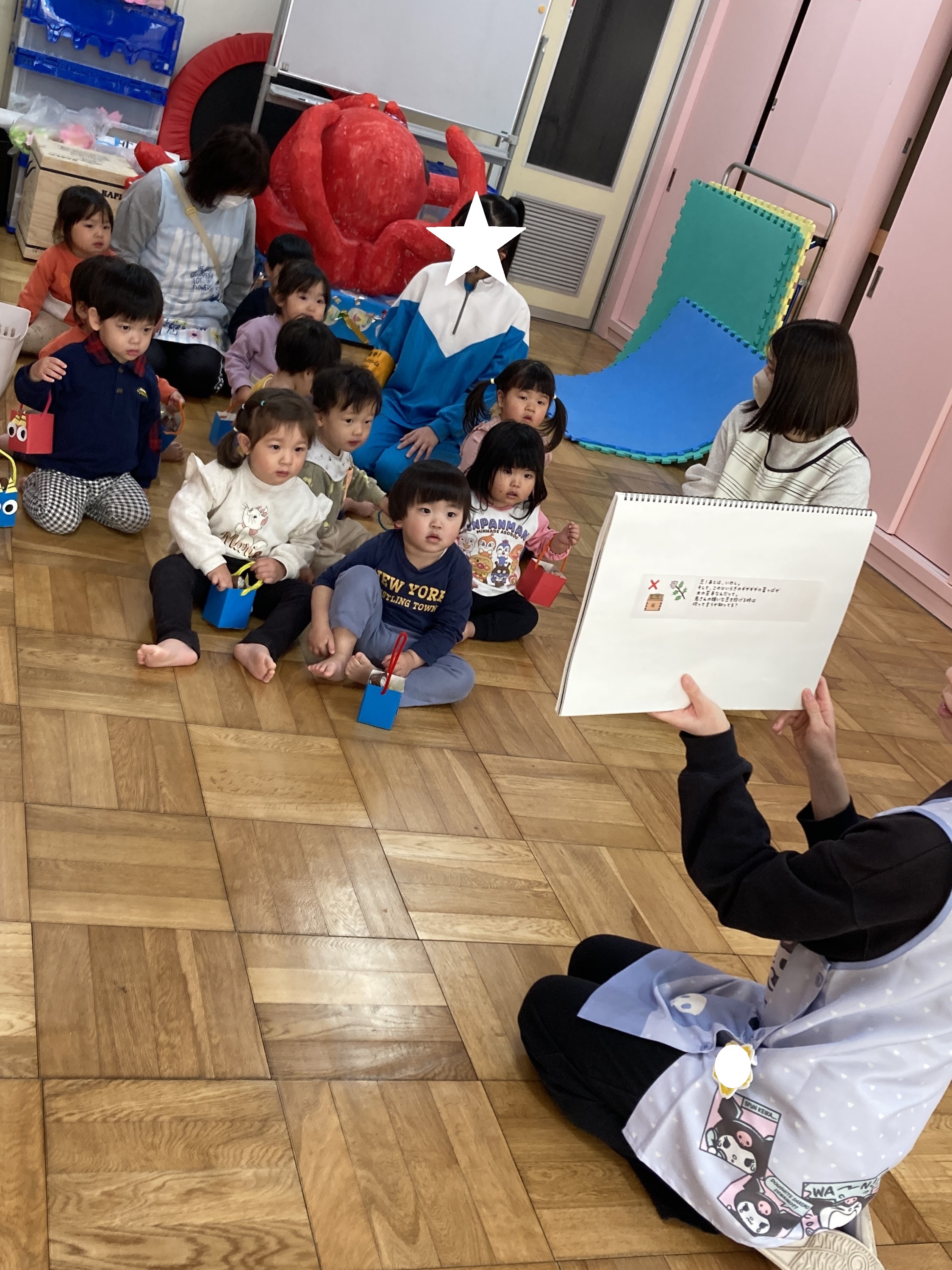 各クラスでホールに集まり、スケッチブックシアターで節分の由来や恵方巻、柊鰯について保育士から聞きました。1歳児クラスの友だちも「おにだ!」と言って絵を見たり、指を差したりしていました。幼児クラスになると、昨年もシアターを見ていることもあり、「えほうまきだよ!」「まめをたべるの!」と言って夢中でした。年の数だけ豆を食べることを知ると、自分の年齢を言う友だちも多かったです。