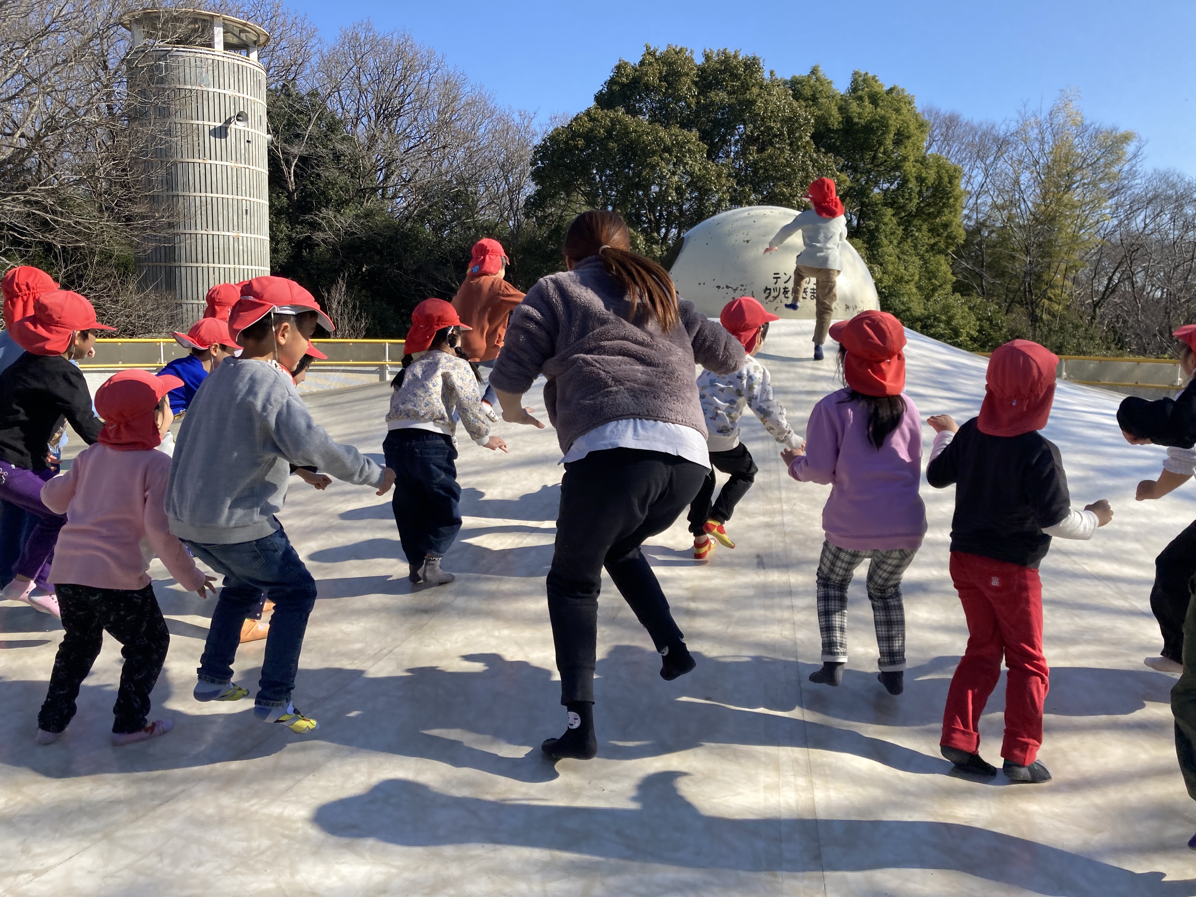 その後は、大型トランポリンを楽しみました。高く飛び跳ねたり、追いかけっこをしたりとパワフルな子どもたち。「もっとあそぶ」「たのしい」と興奮がいつまでも冷めませんでした。
