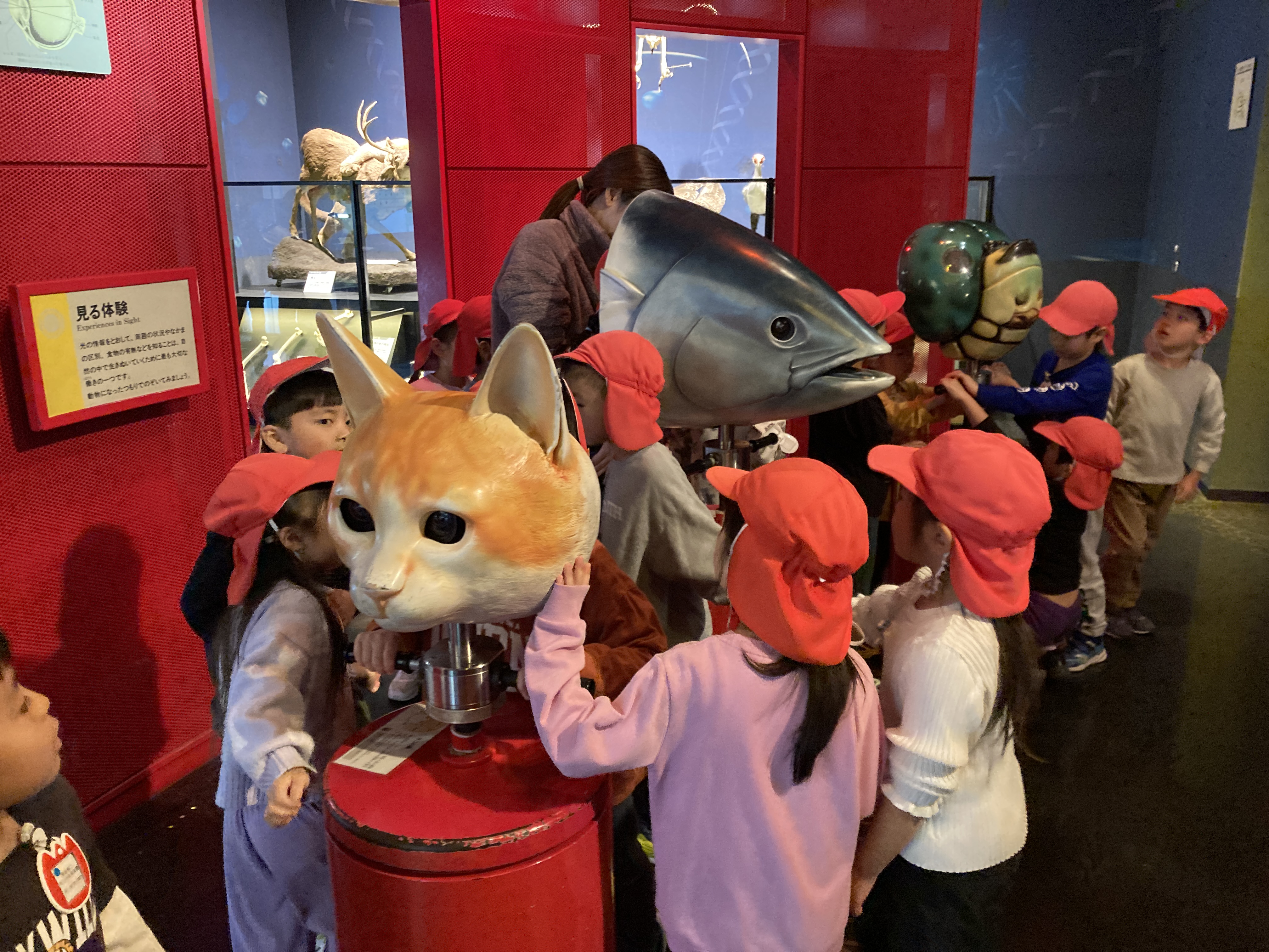今日は、待ちに待った卒園遠足で茨城県自然博物館へ行って来ました。朝からわくわくのさくら組さん。お弁当の入ったリュックを大事に背負い、いざバスへ。バスの中では、テンション高めの様子で話しが盛り上がっていました。一時間弱で到着し、館内を回りました。宇宙、恐竜、化石、どんぐり、魚など様々な展示があり、興味津々で見入っていました。