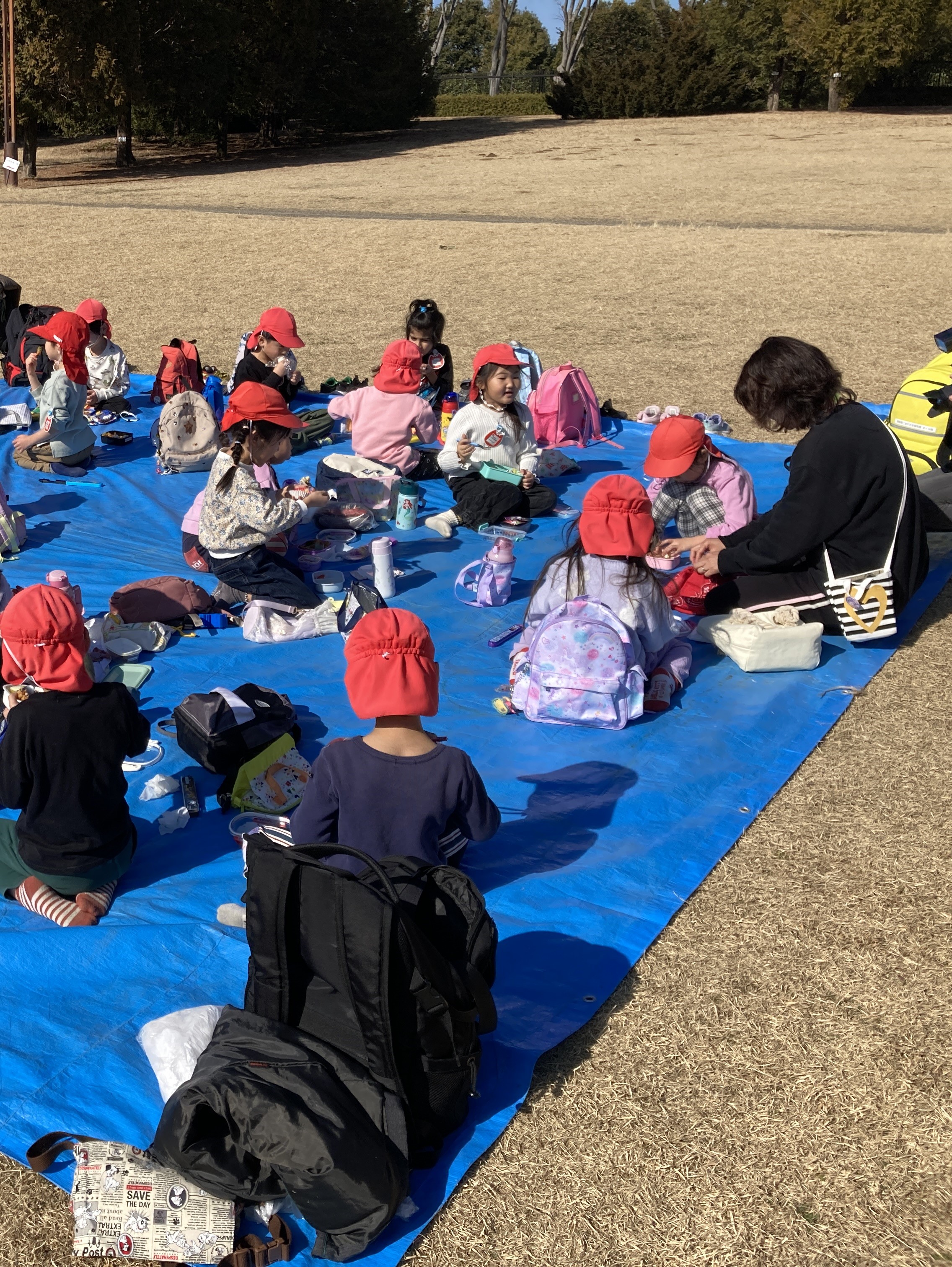 そして、屋外にてお弁当を食べました。天気も良く、気持ちいい中で愛情たっぷりのお弁当を食べ、ニッコリ笑顔の子どもたちでした。