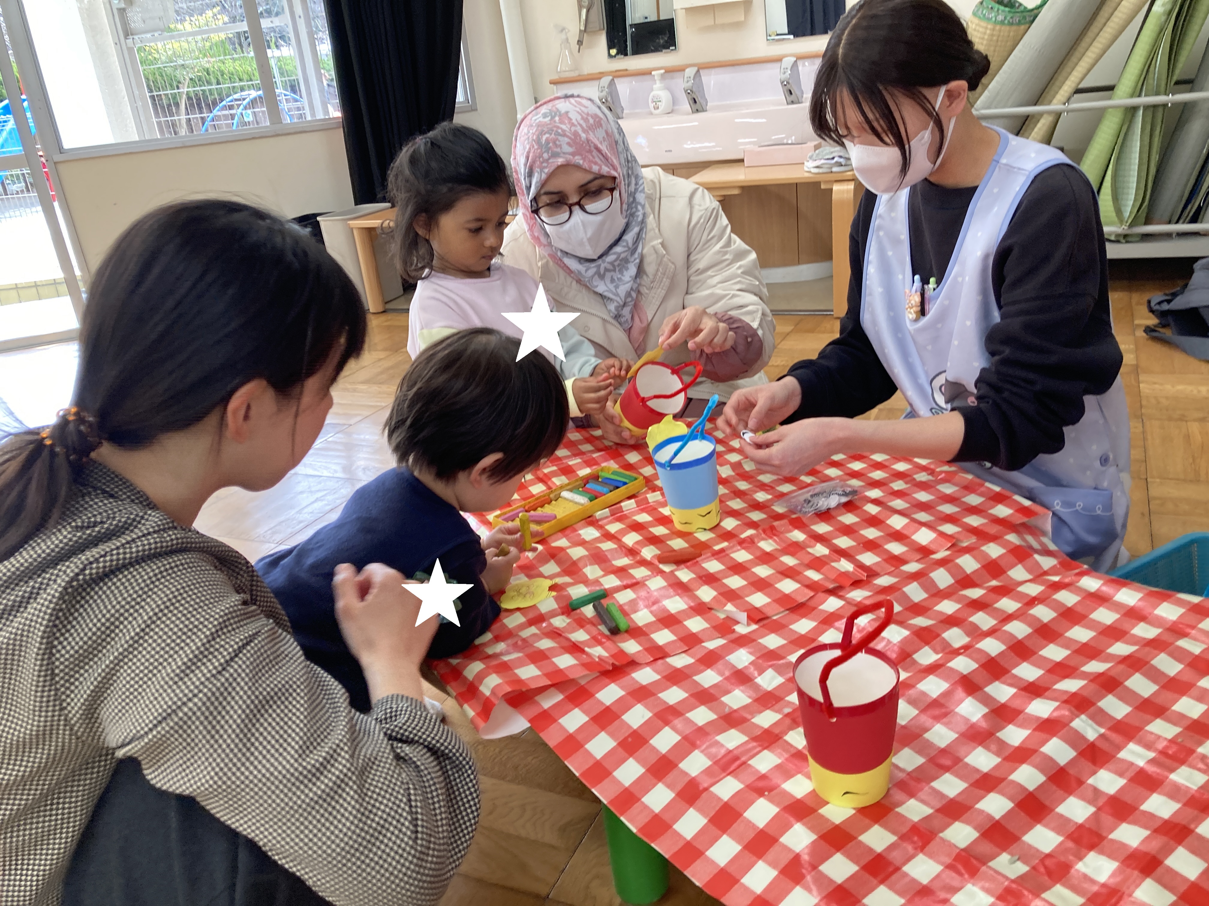 三方づくりでは、初めてクレヨンを持って描いてみたり、糊を塗って鬼の顔のパーツを貼っていくの楽しむ姿がありました!