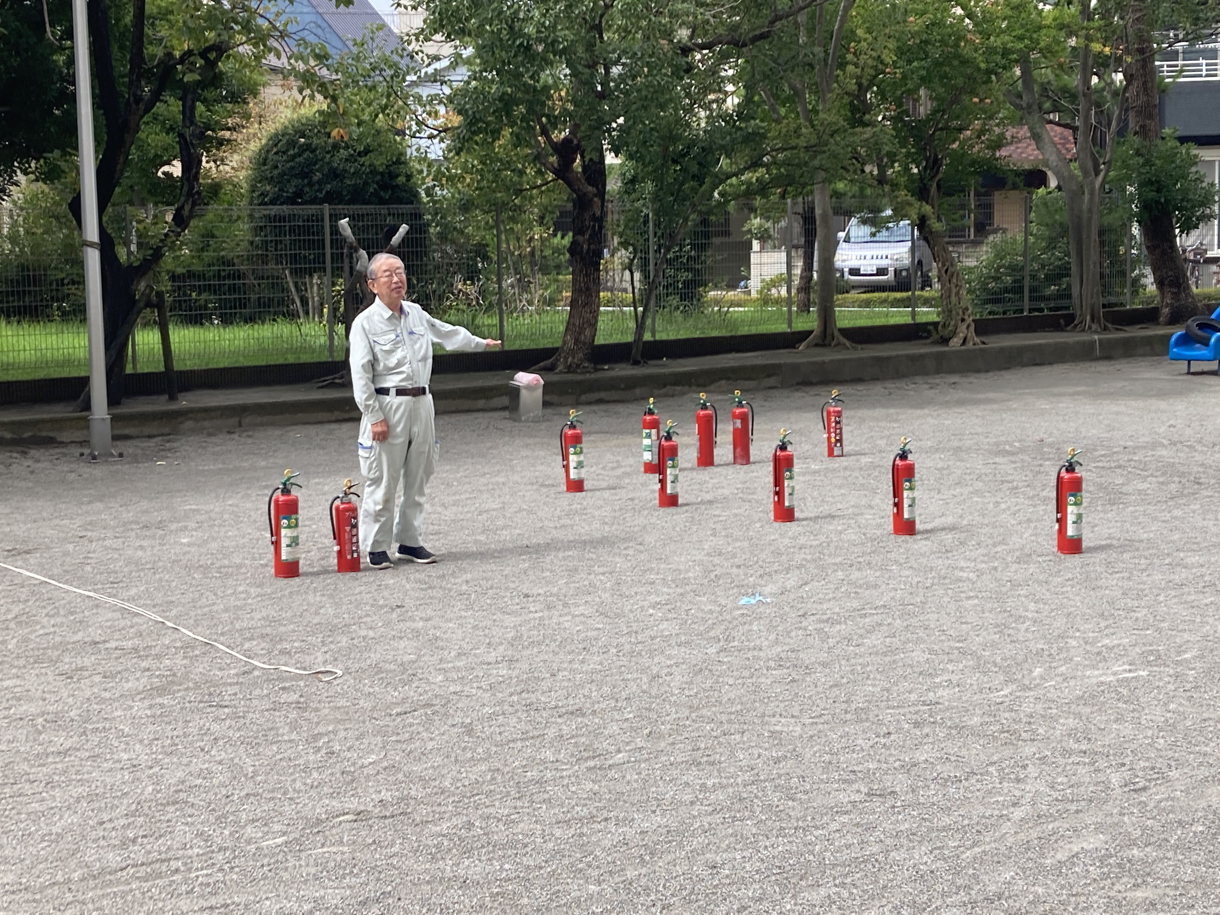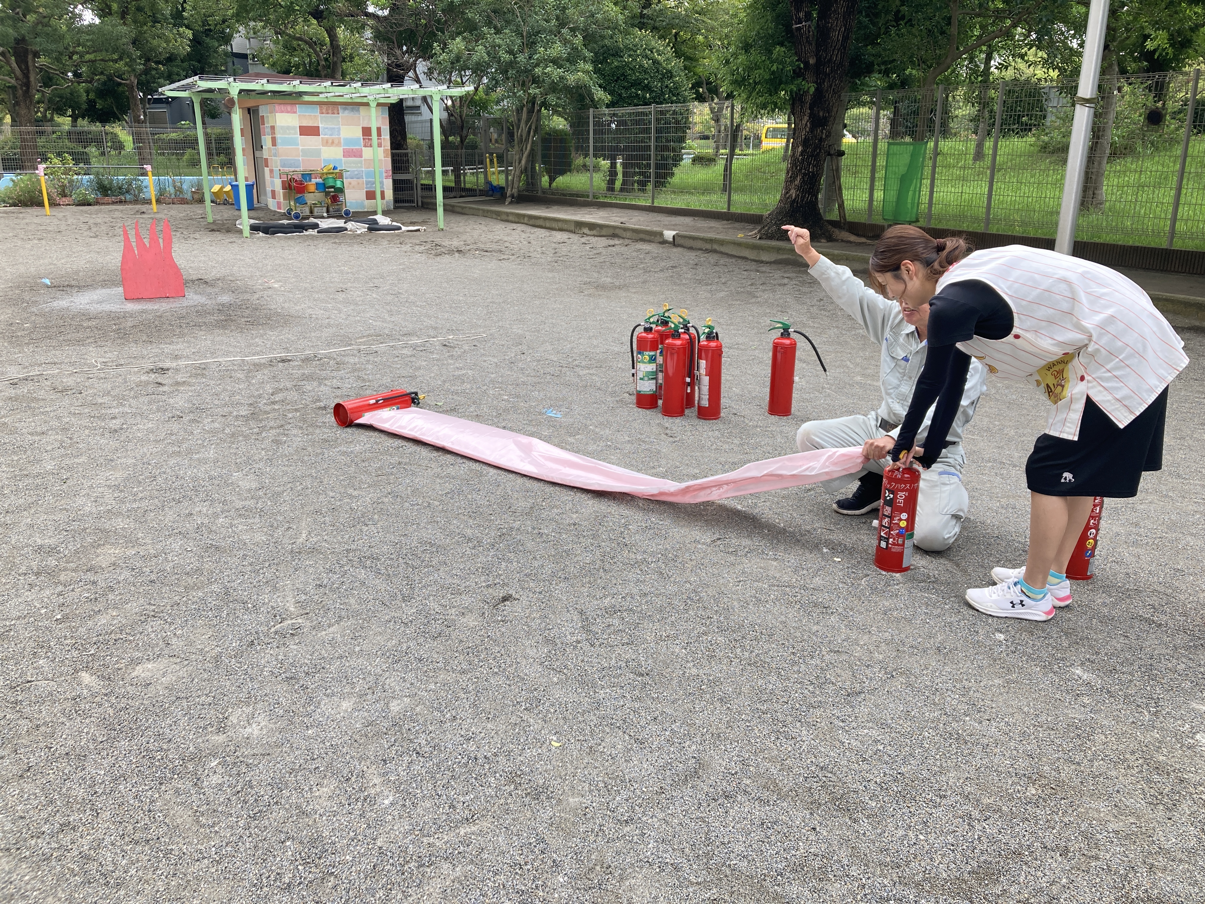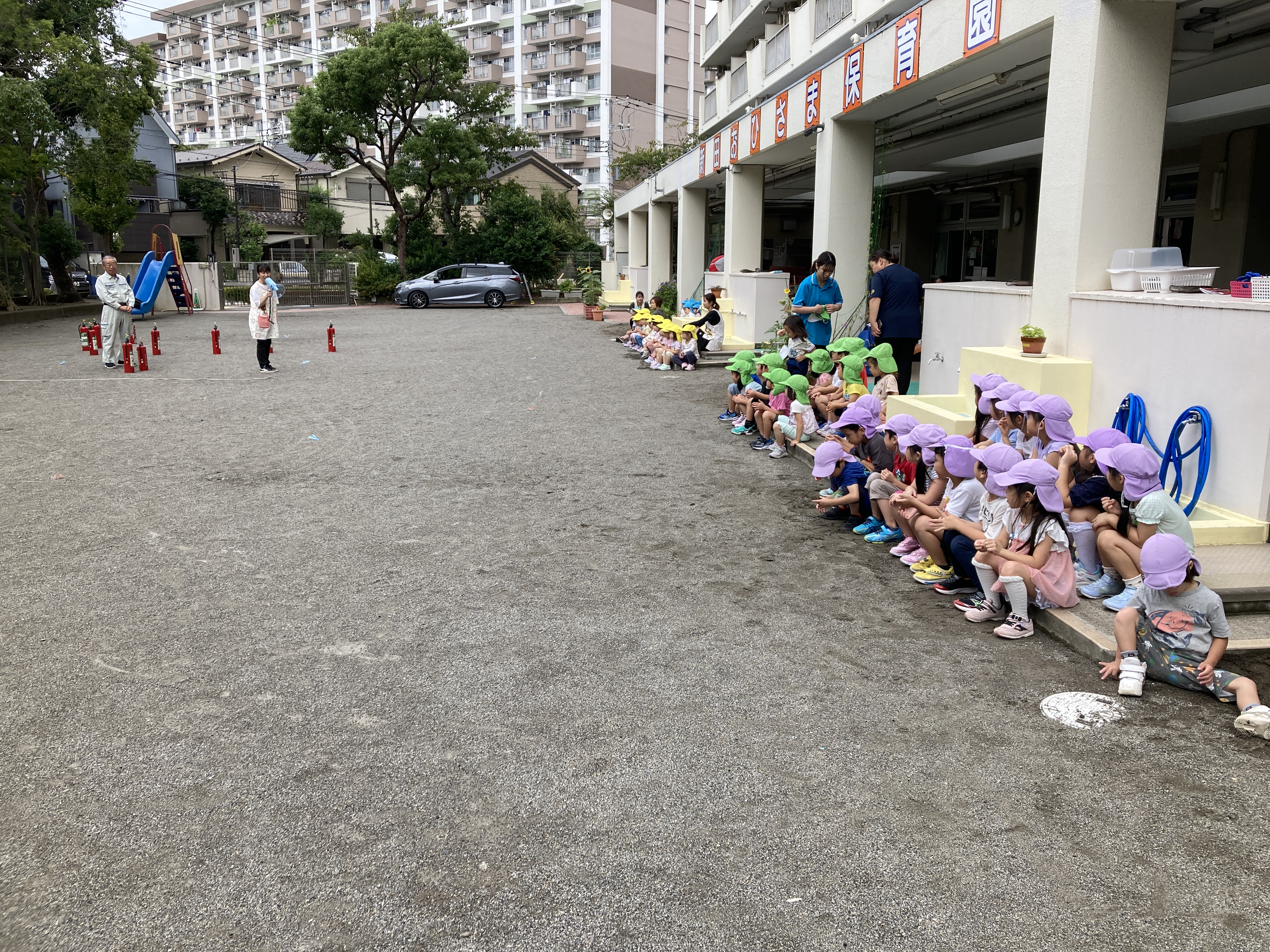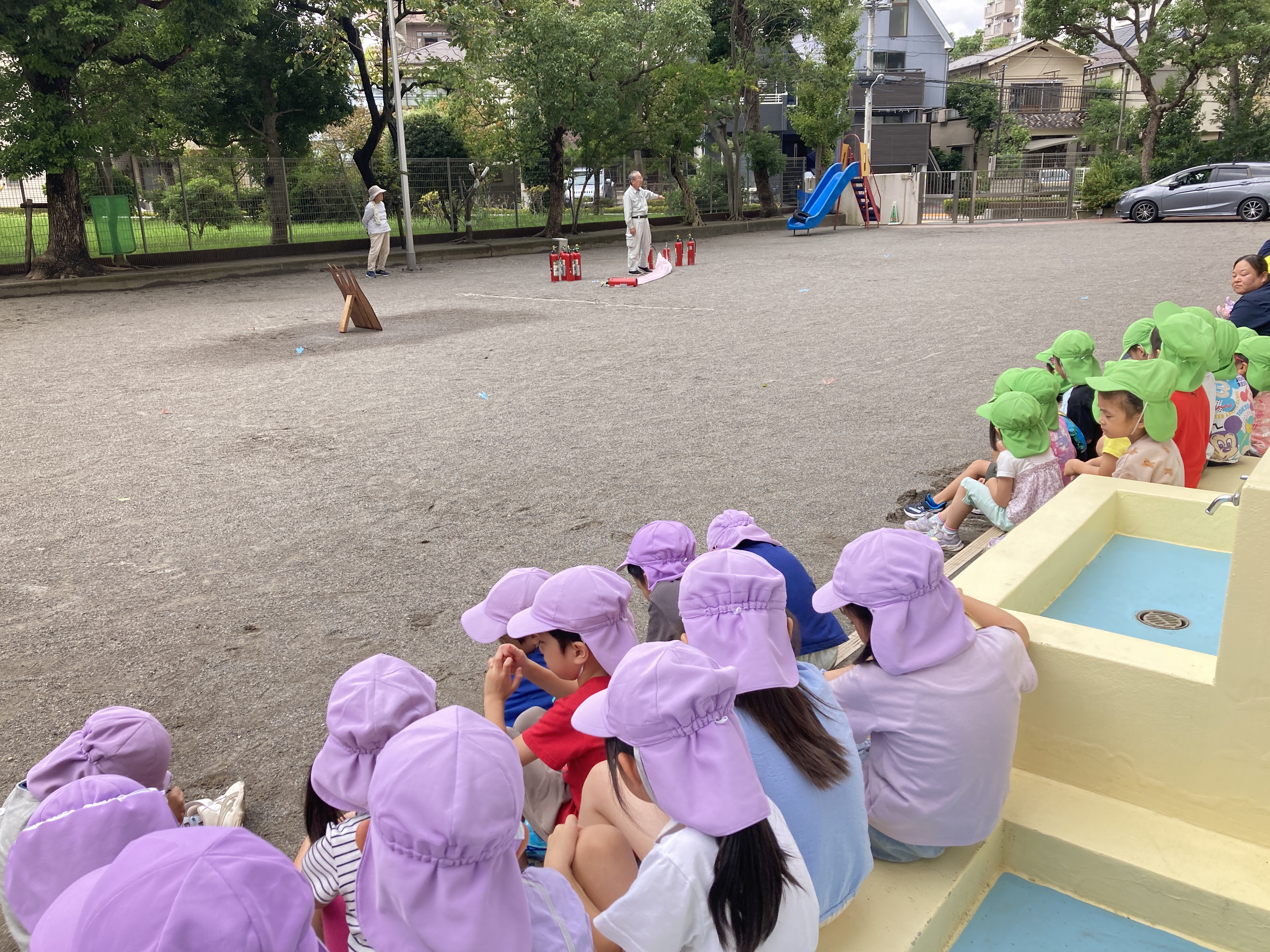 昨日の雨で少し涼しくなった園庭で、消火訓練を行いました。