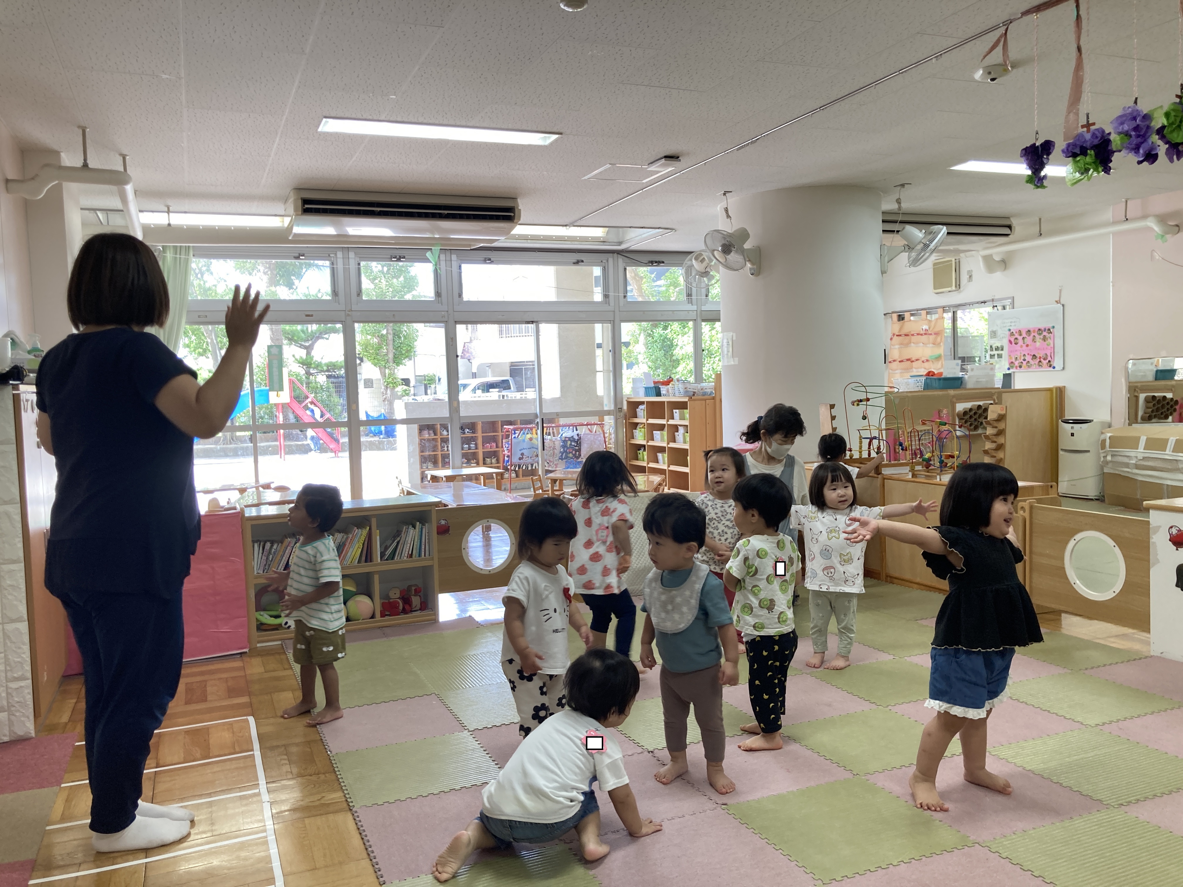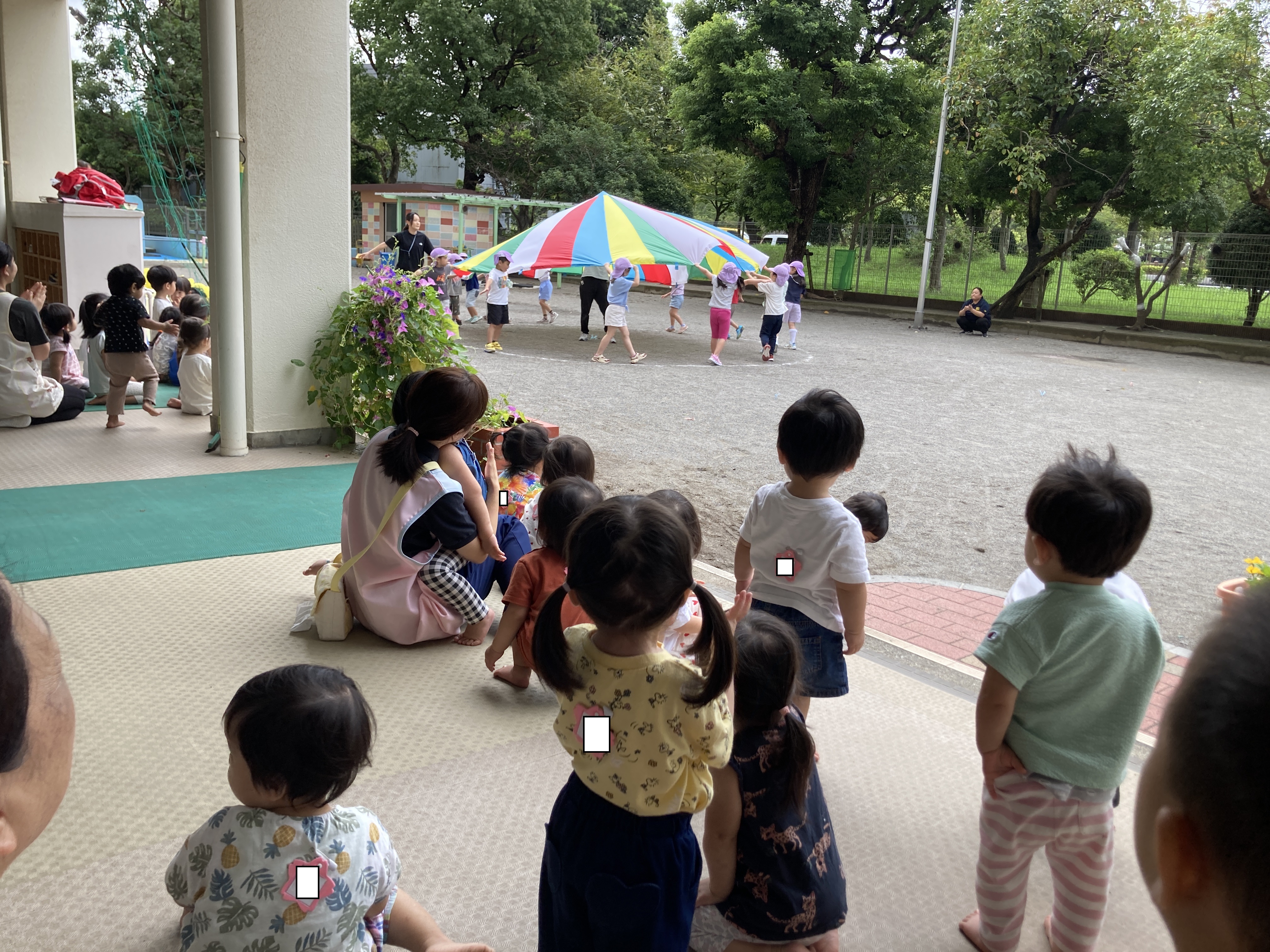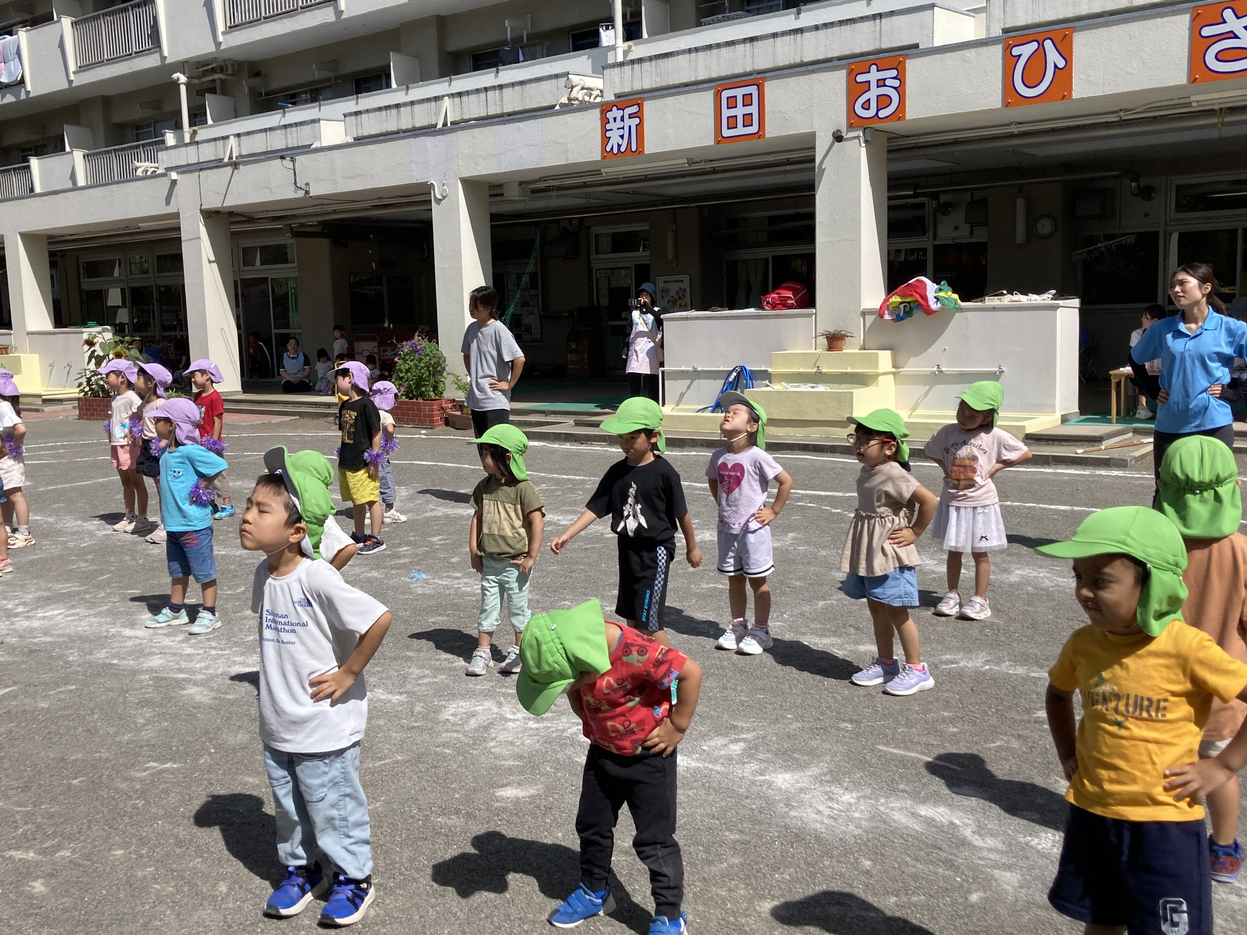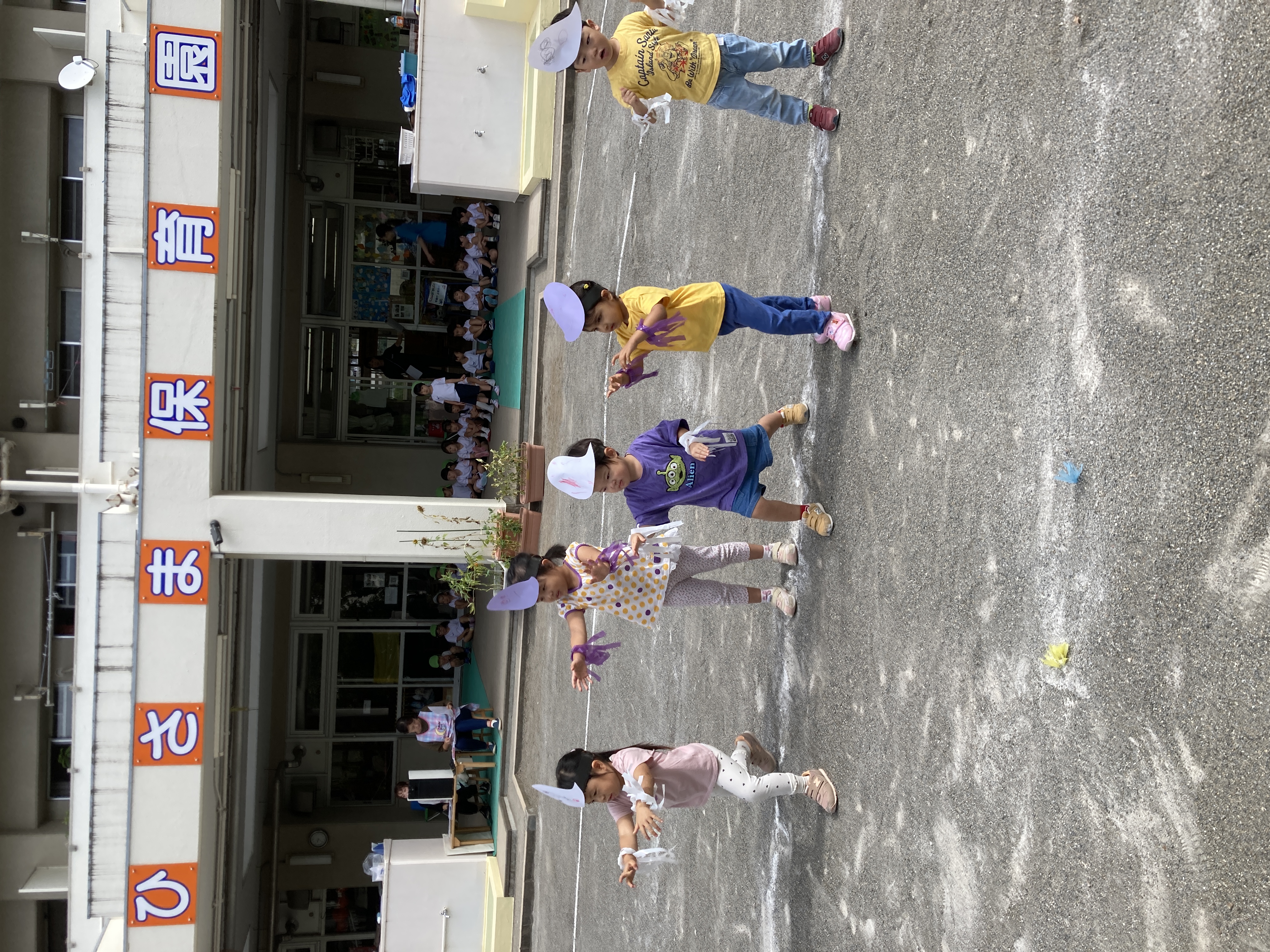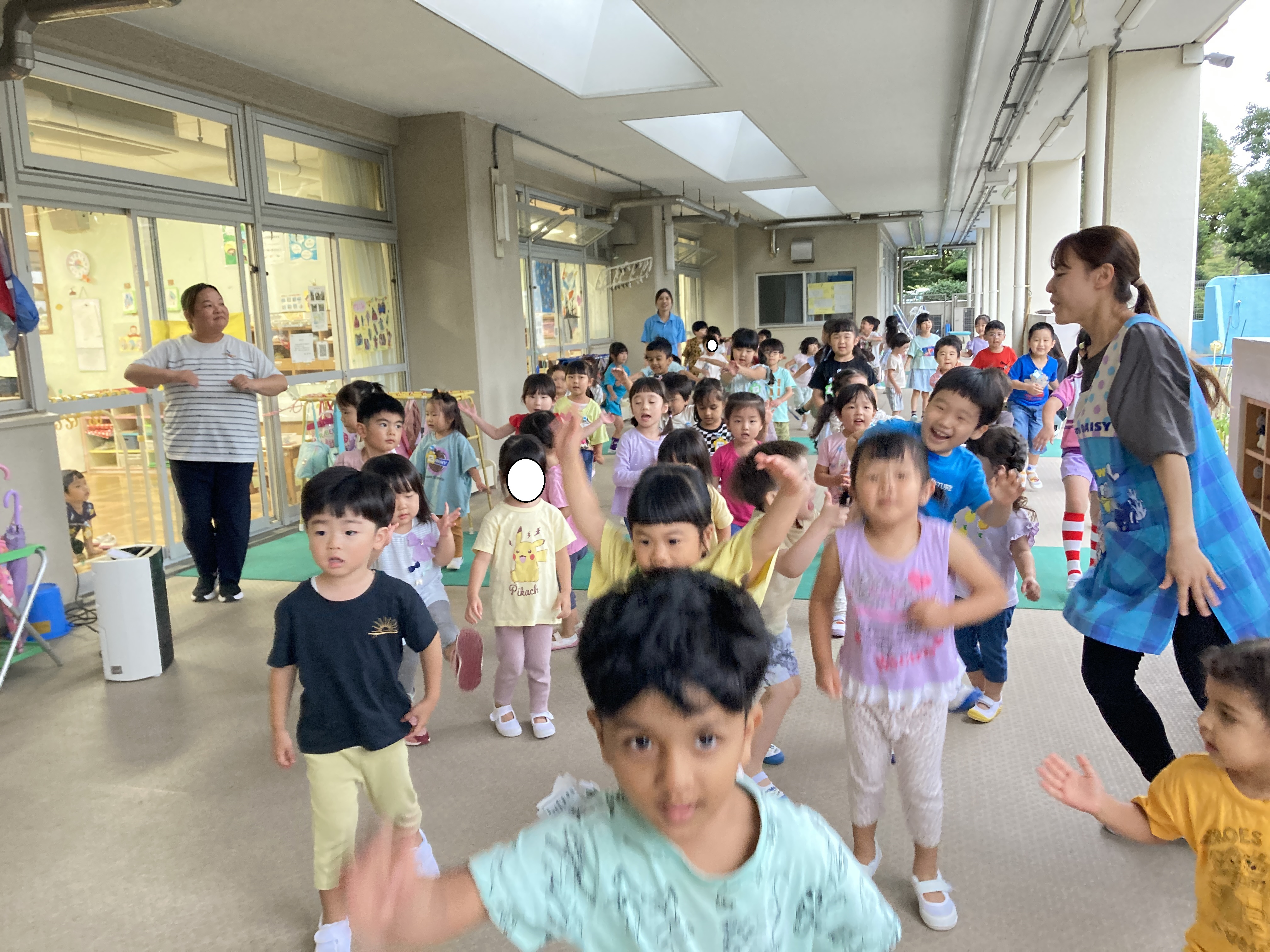 今週は運動会ウィークということで、おやつ後、2~5歳児クラスはテラスで準備体操「ウキウキパレード」をみんなで踊りました。