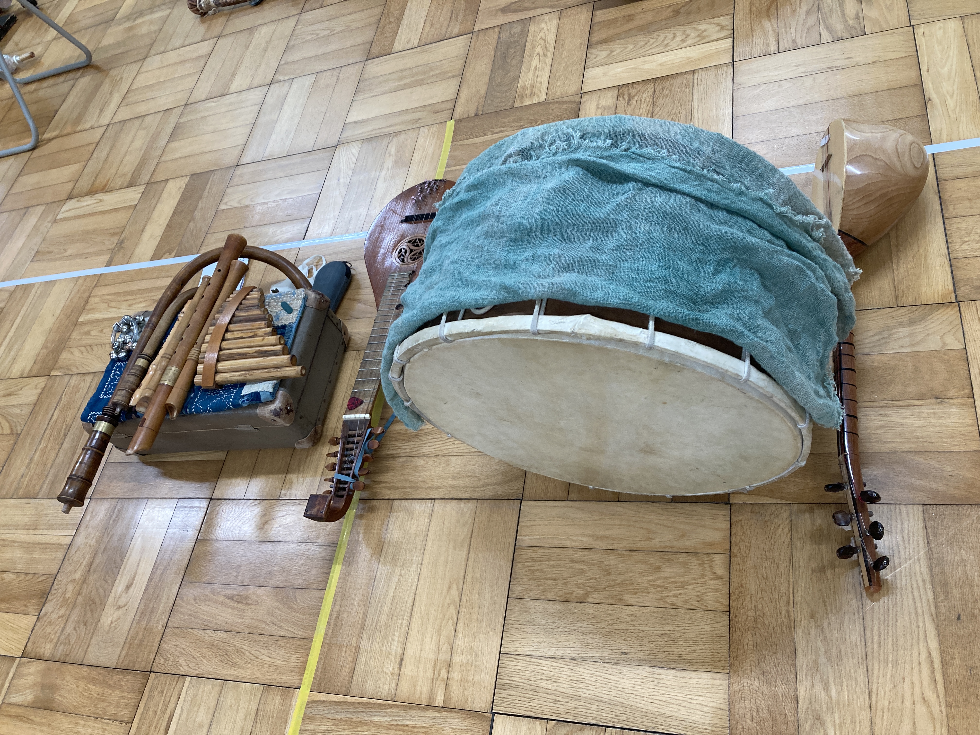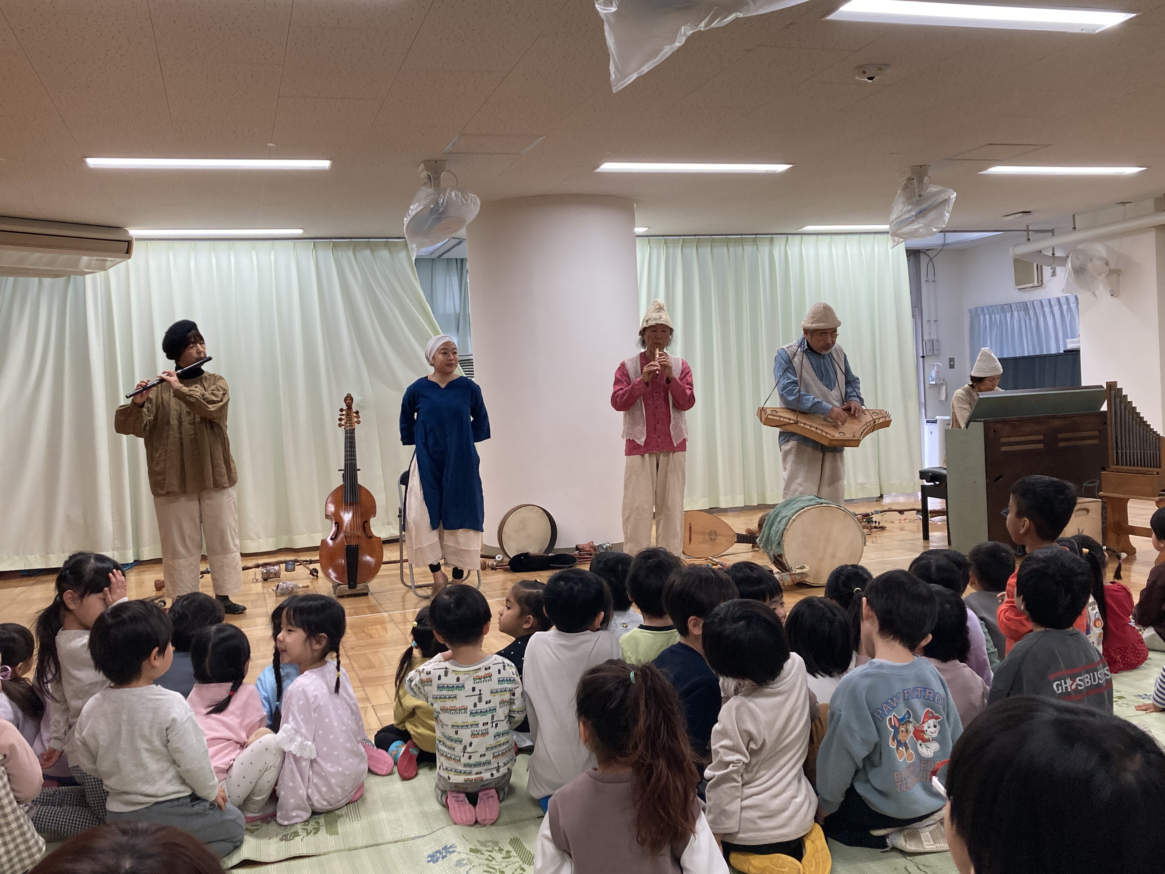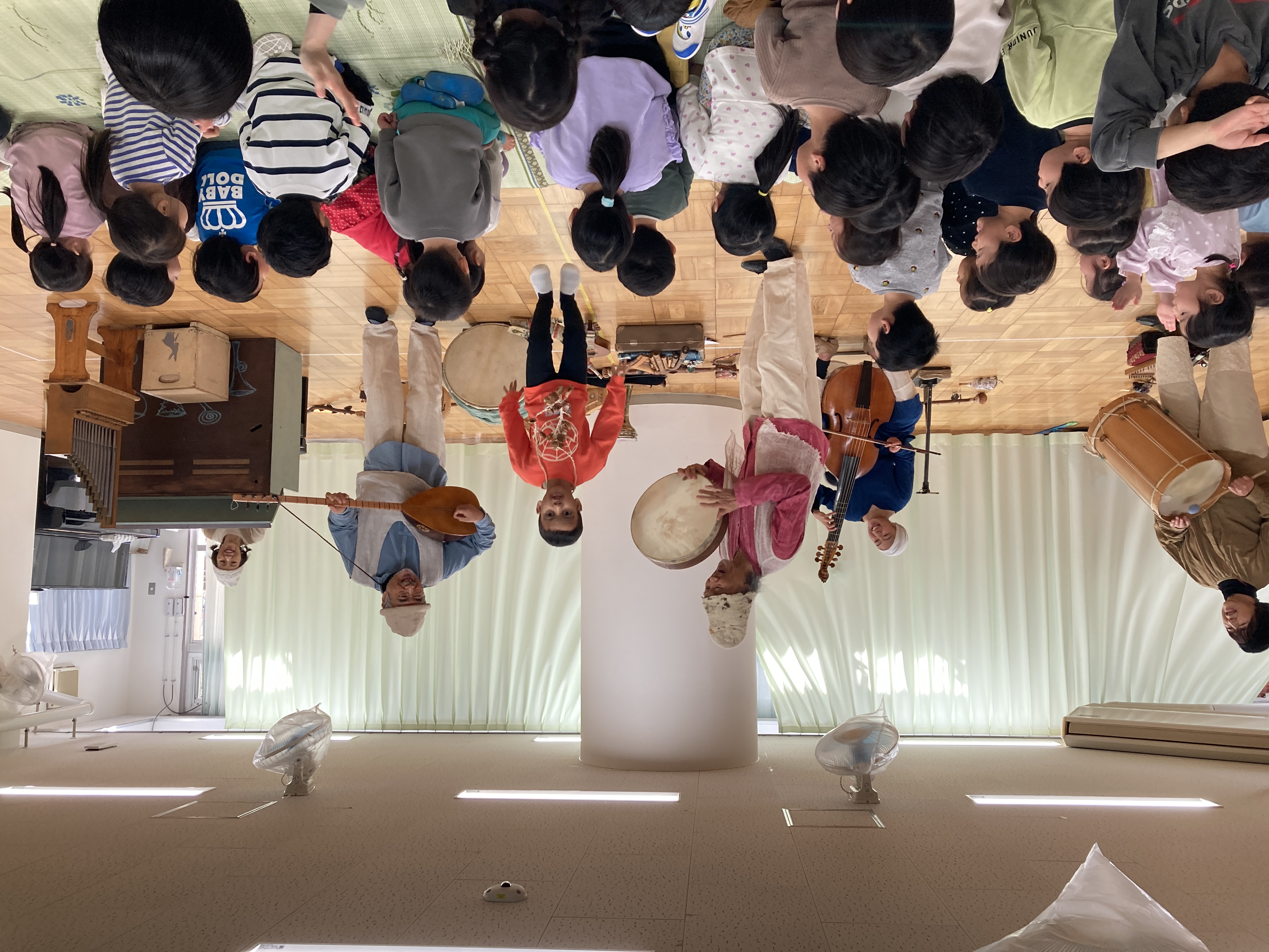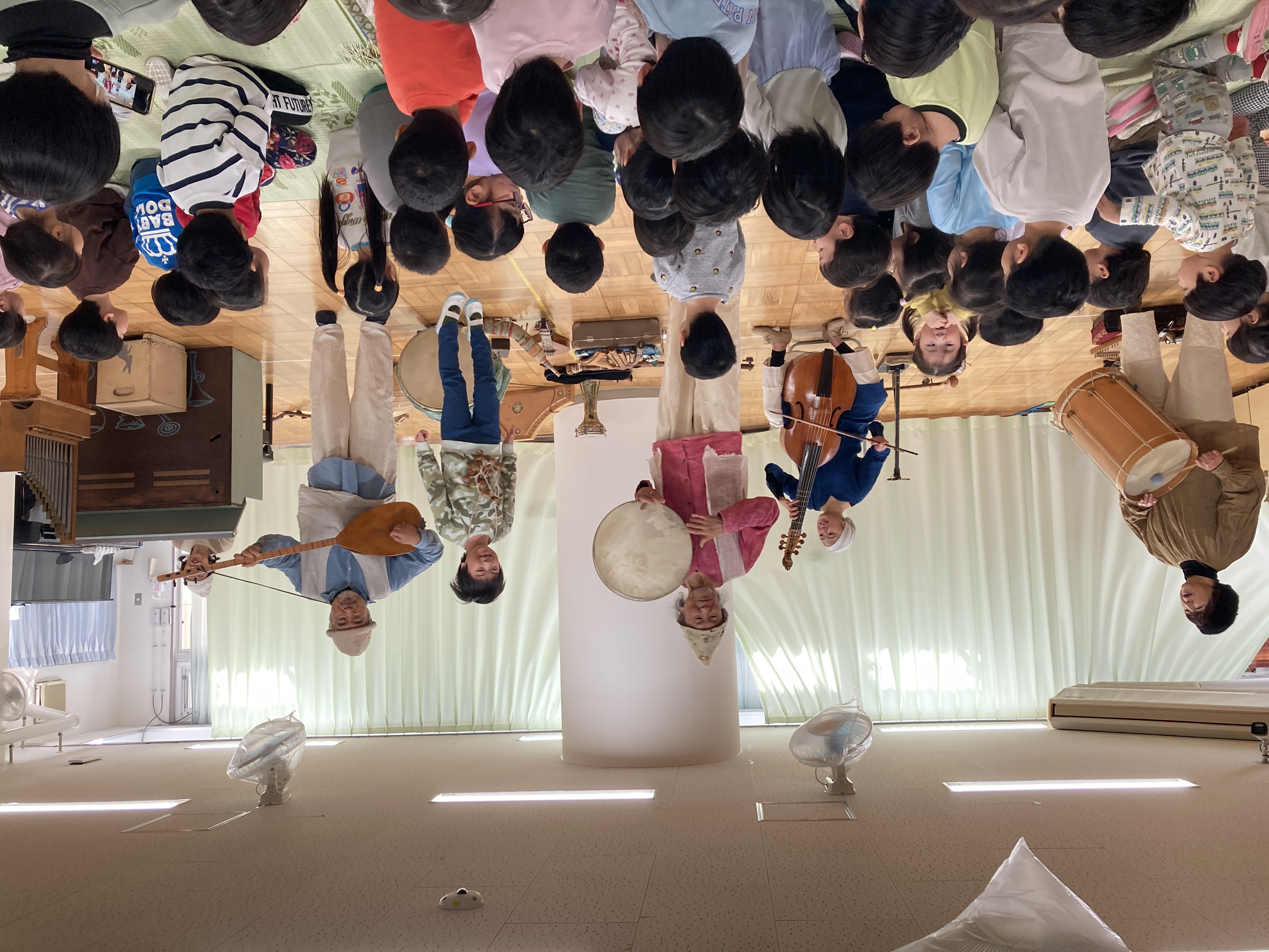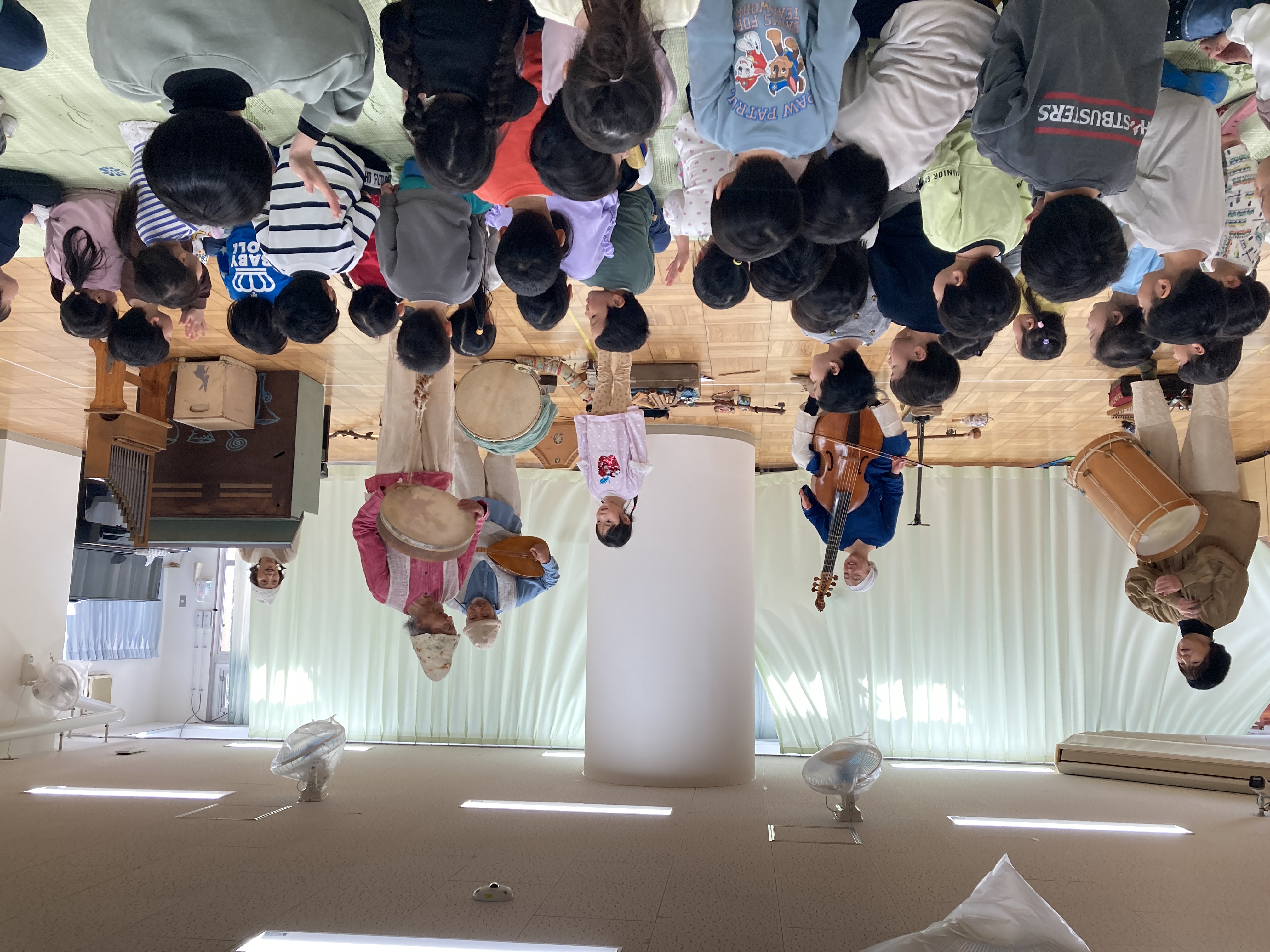 普段見ている楽器と少し違う楽器に「知らない楽器がいっぱいあるね」と興味深々の子ども達。