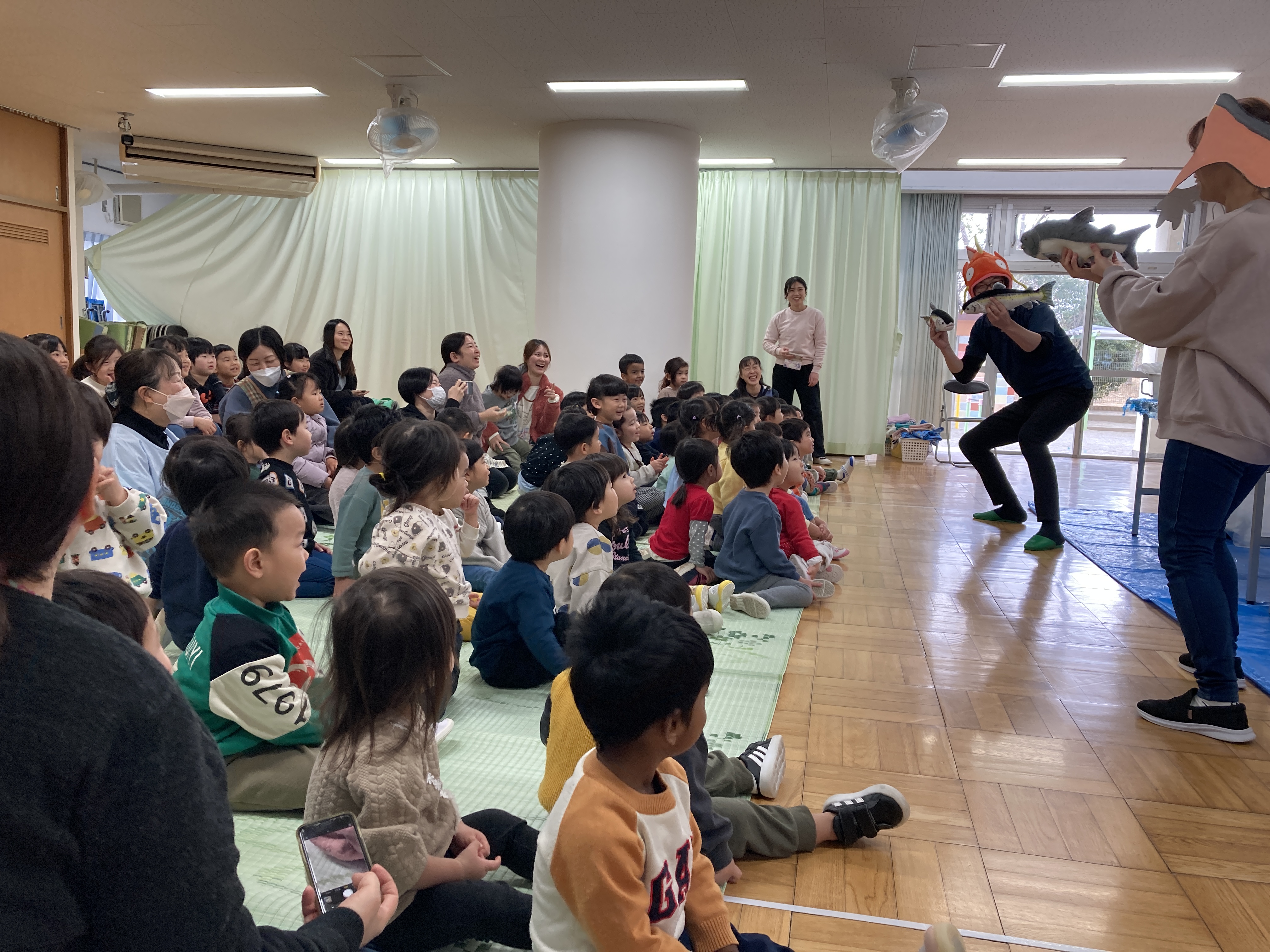 「サケの一生」の紙芝居を見た後、サケのぬいぐるみを使った寸劇が始まると、躍動感いっぱいのサケの動きに大笑い!