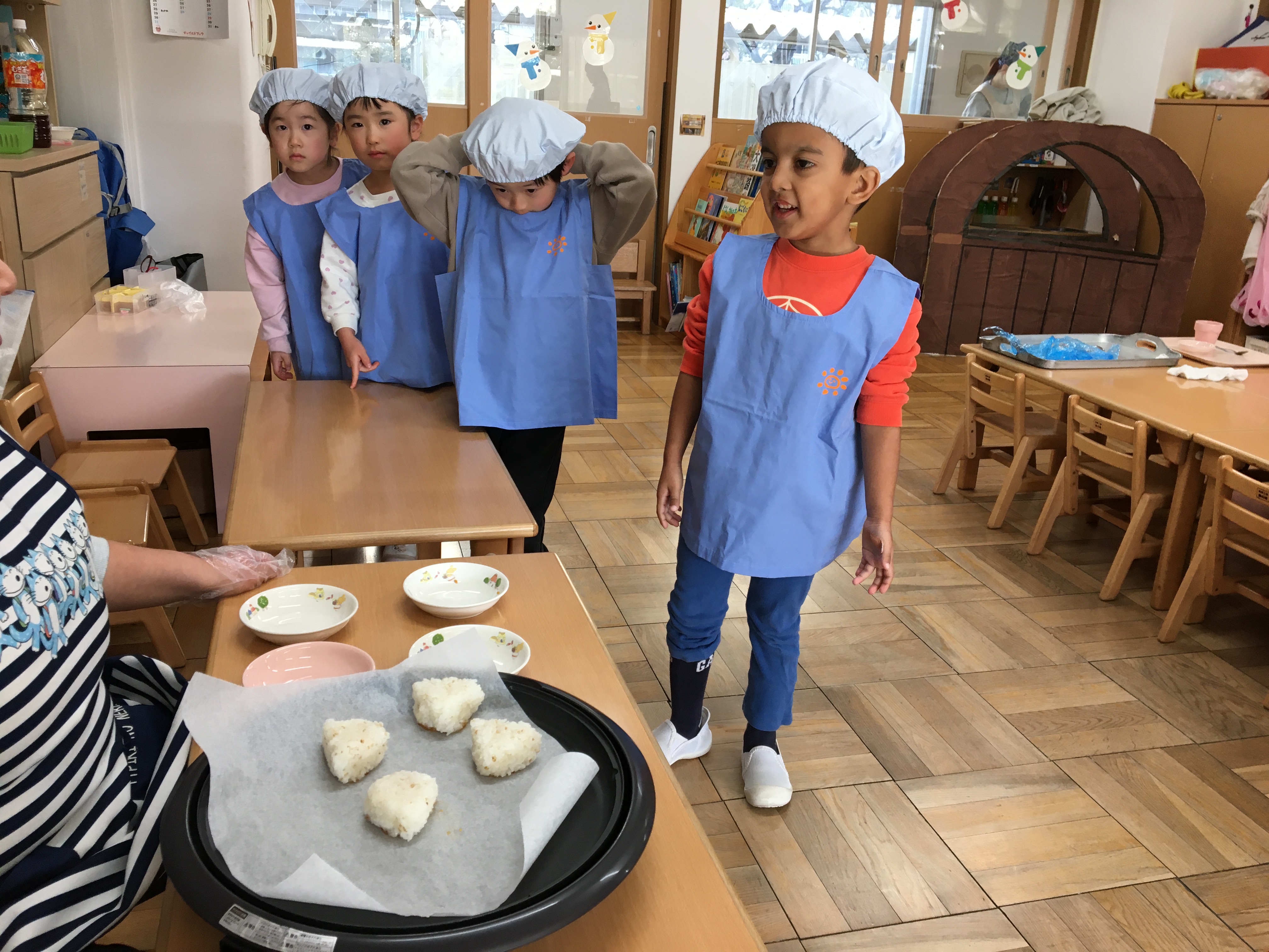 エプロン、帽子をかぶってクッキング準備スタート。