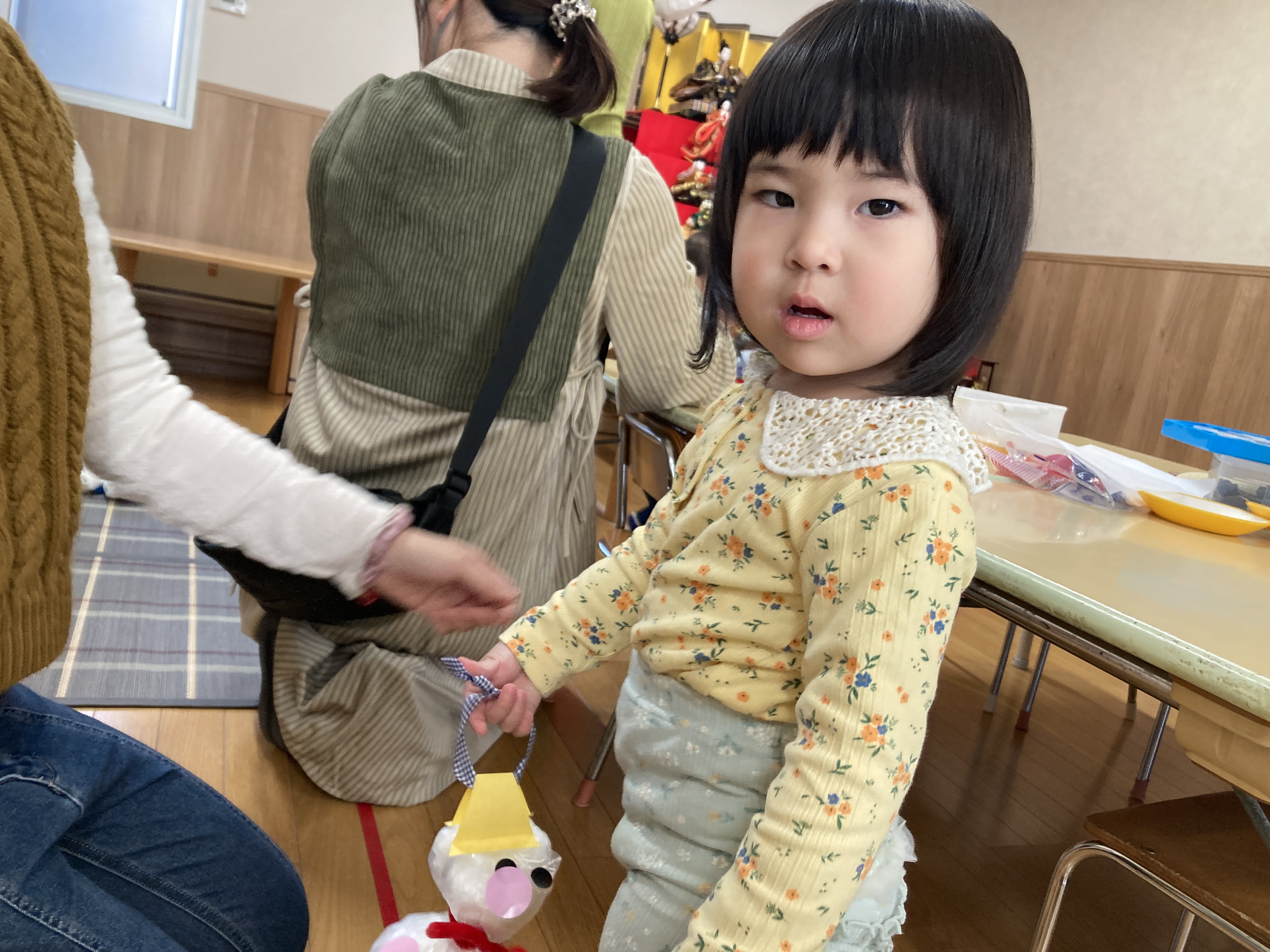 先日子育てひろばがあり、6組のご家庭が参加してくださいました。今回は、雪だるまの製作や園庭遊びを楽しみました。