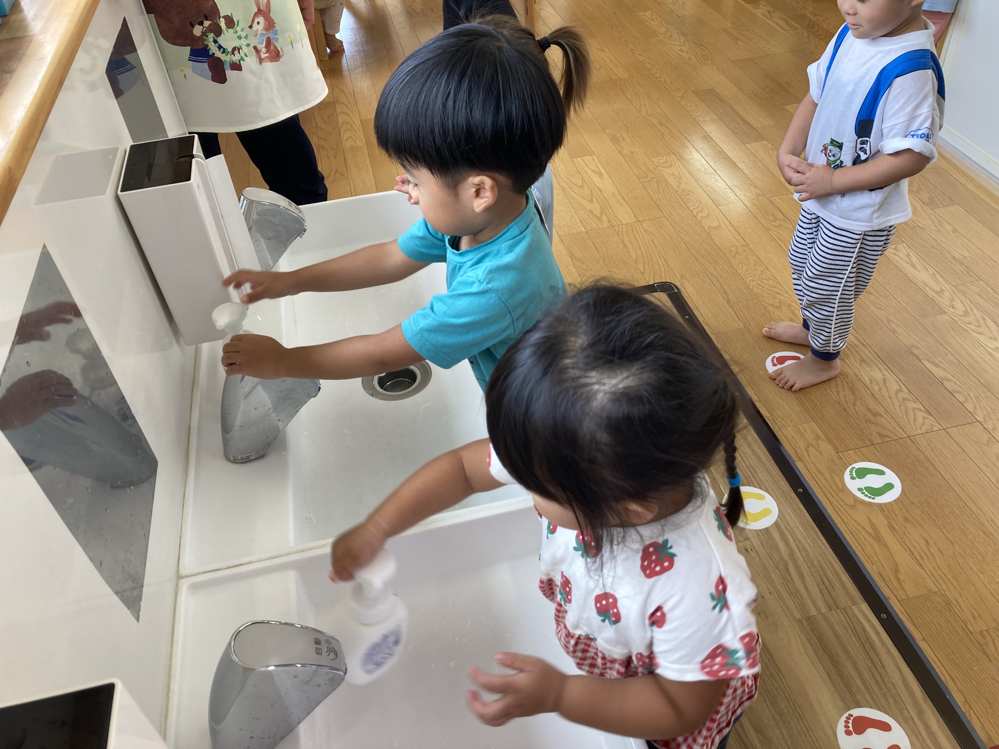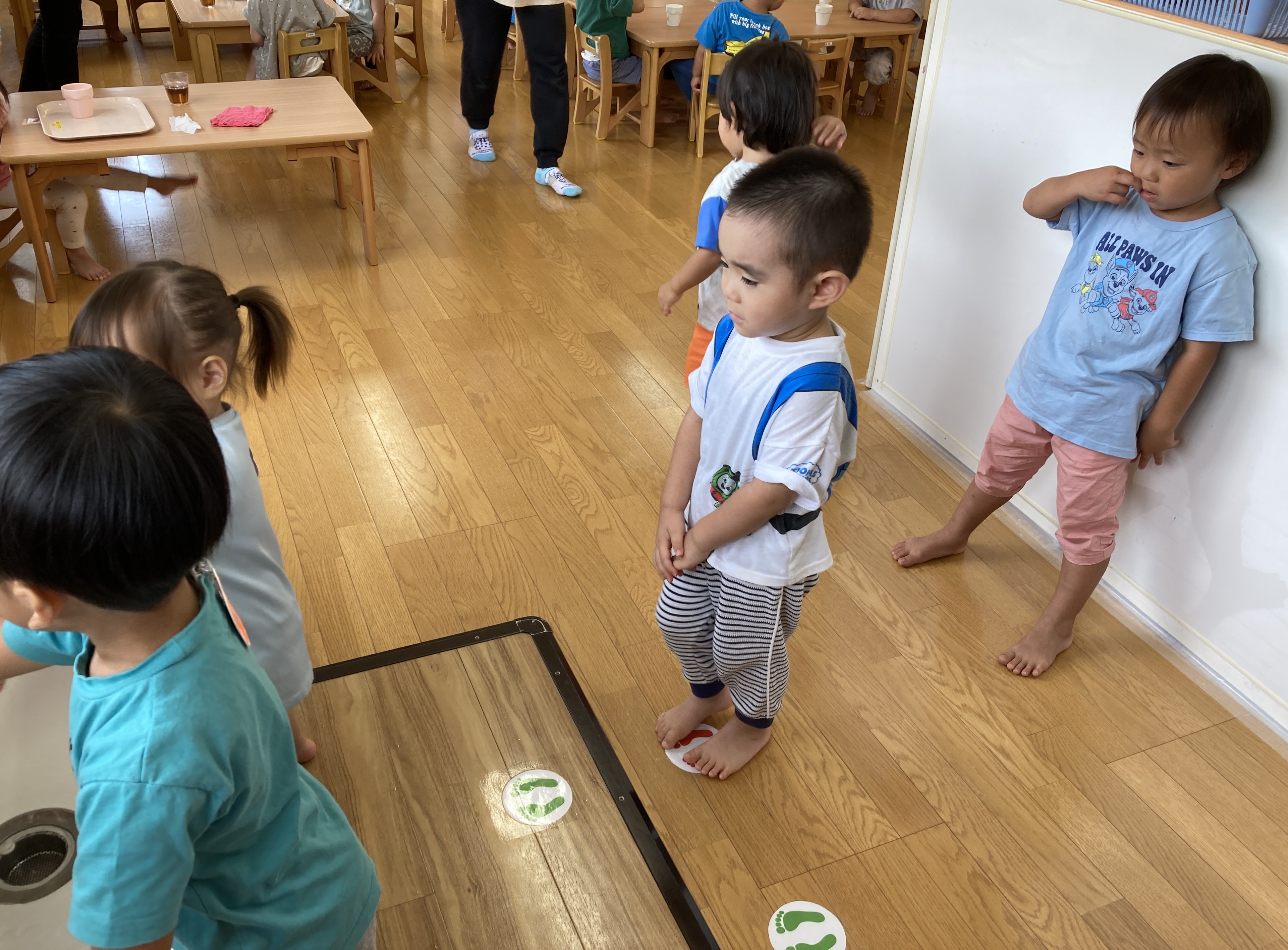 下の写真は、朝の牛乳の様子。まずは手洗い。ひとりでもしっかり洗えるようになりました。足形の所で待つことも出来てますね。