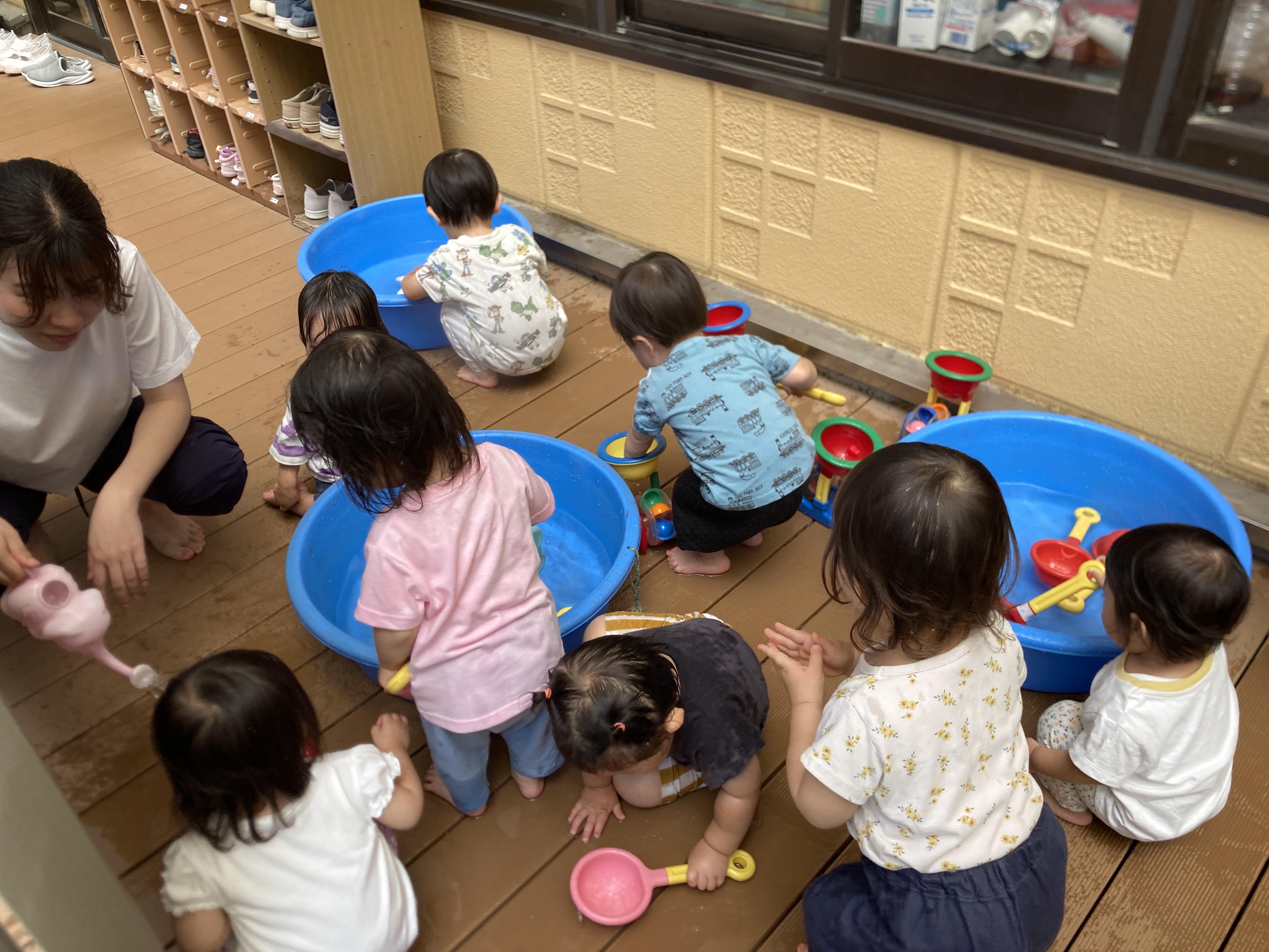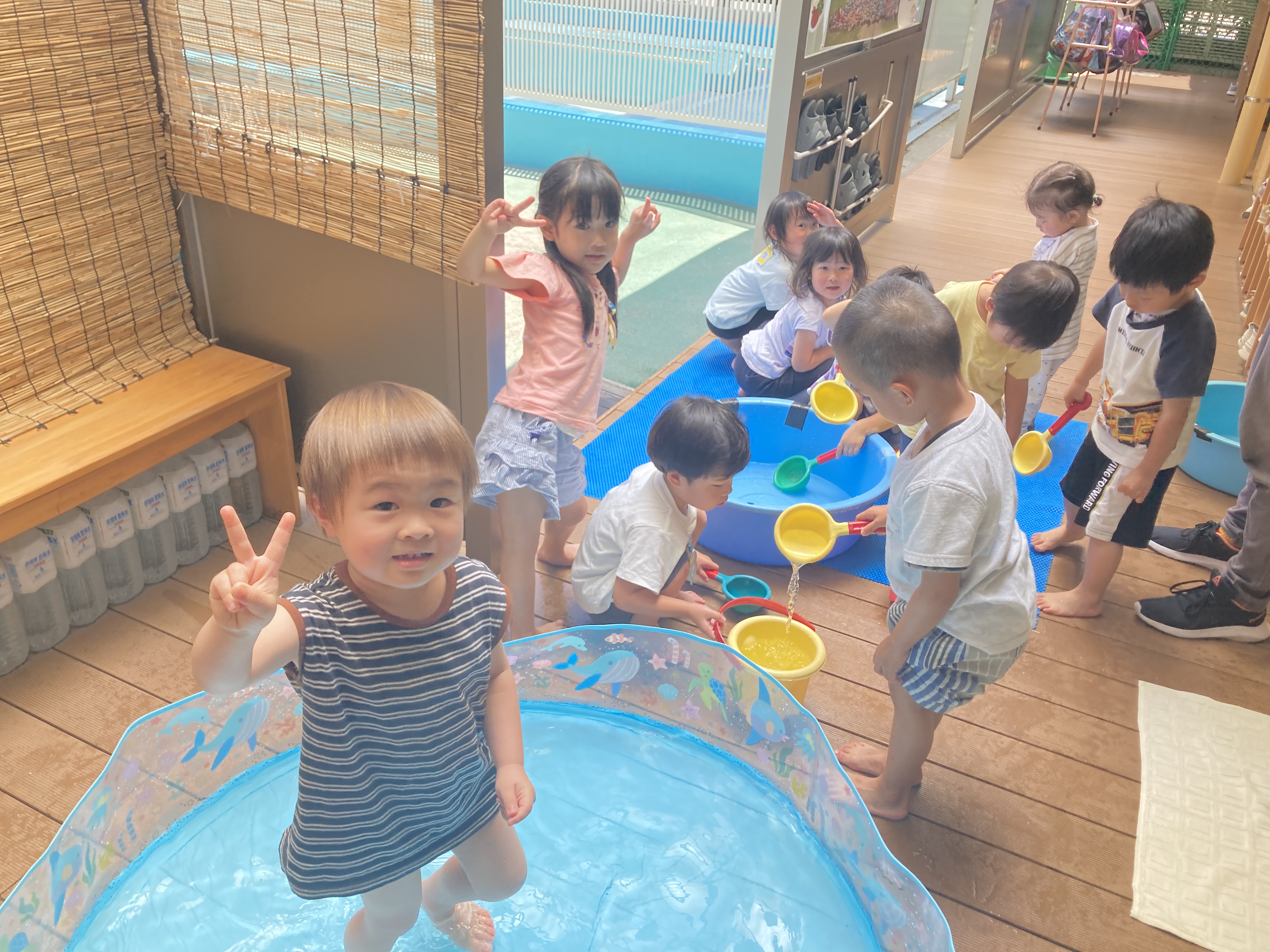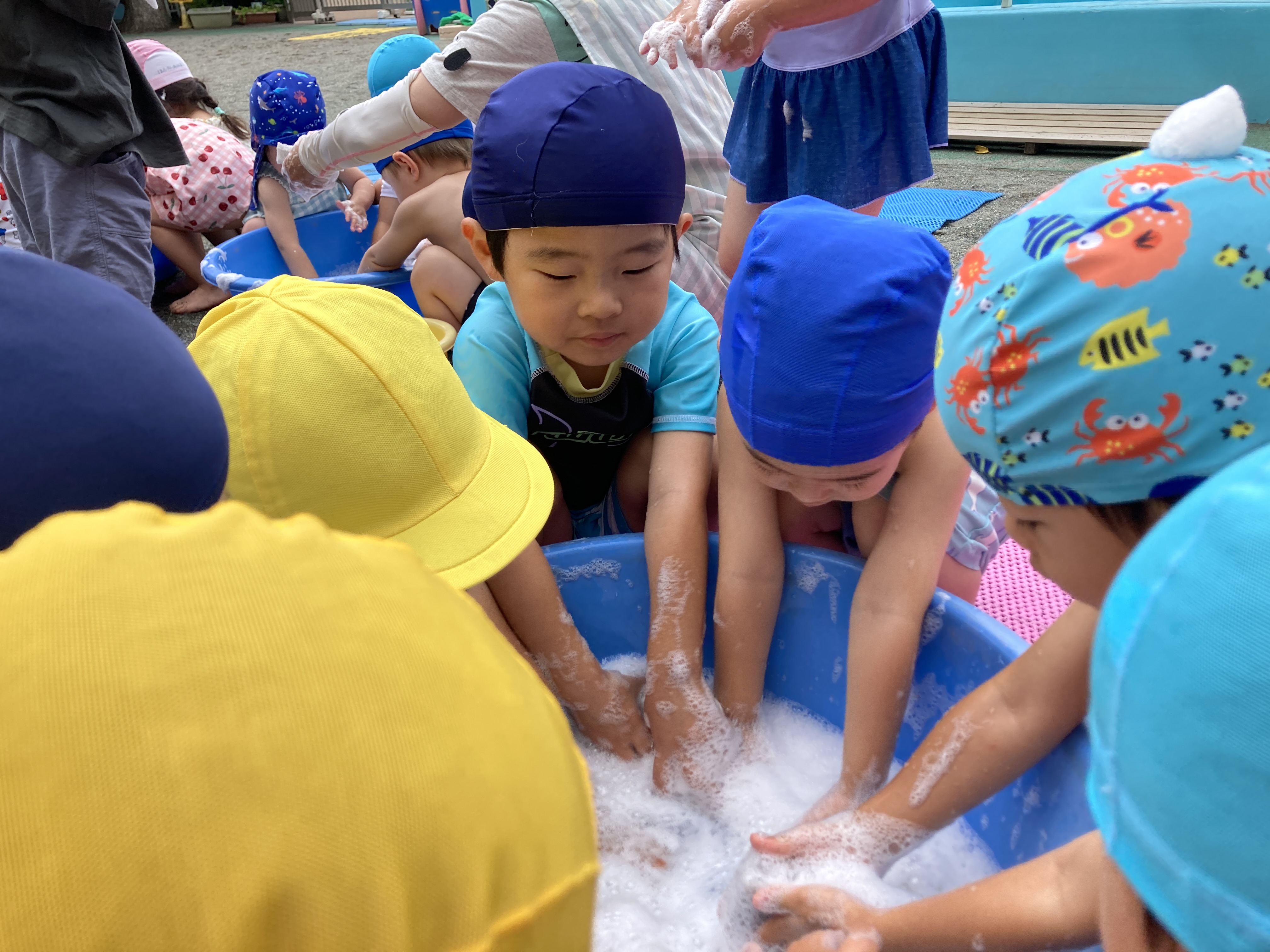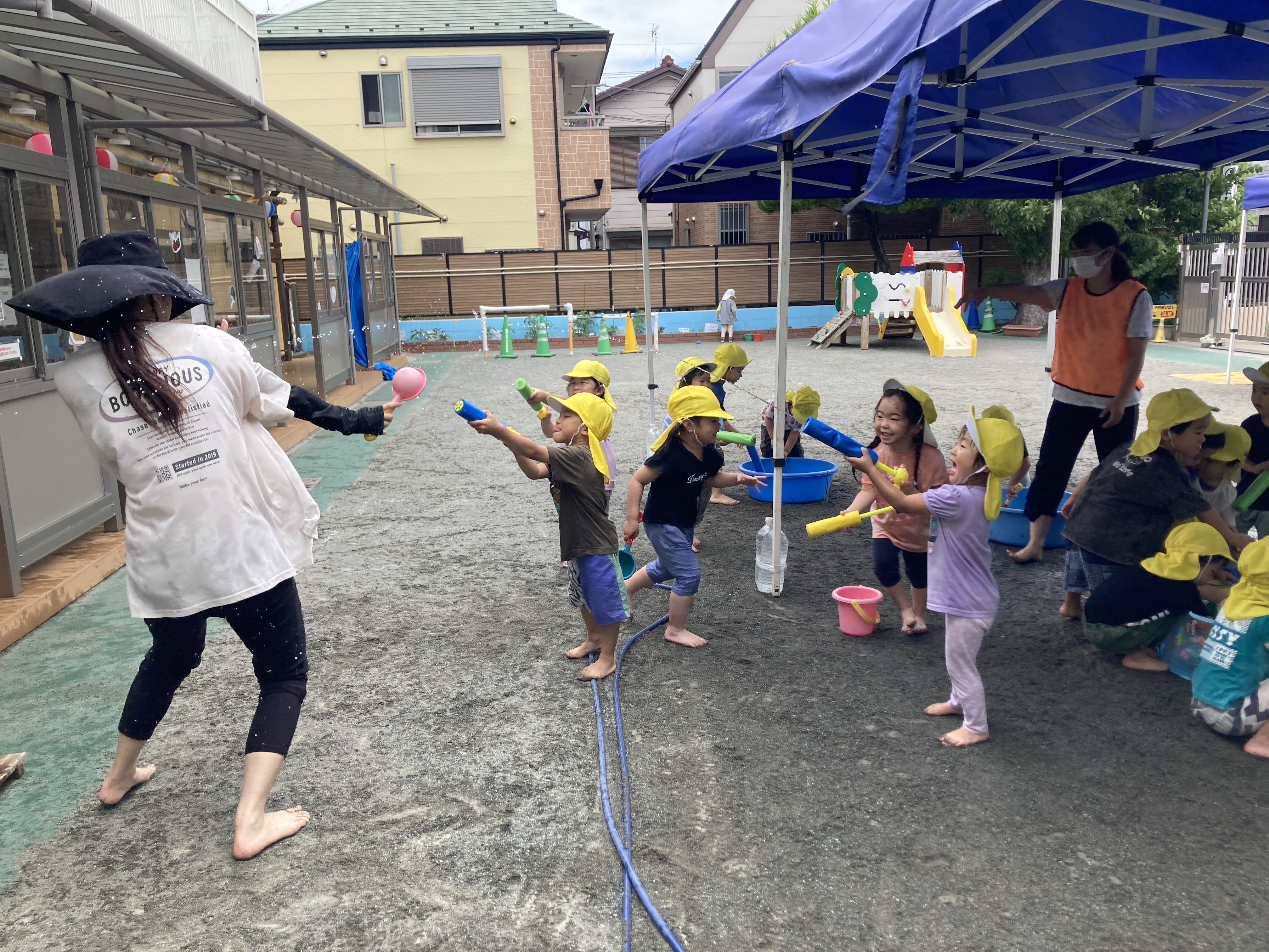 夏には、園庭に大きなテントを出し、水あそびや泡あそび等したり、テラスやプールでも遊びました。