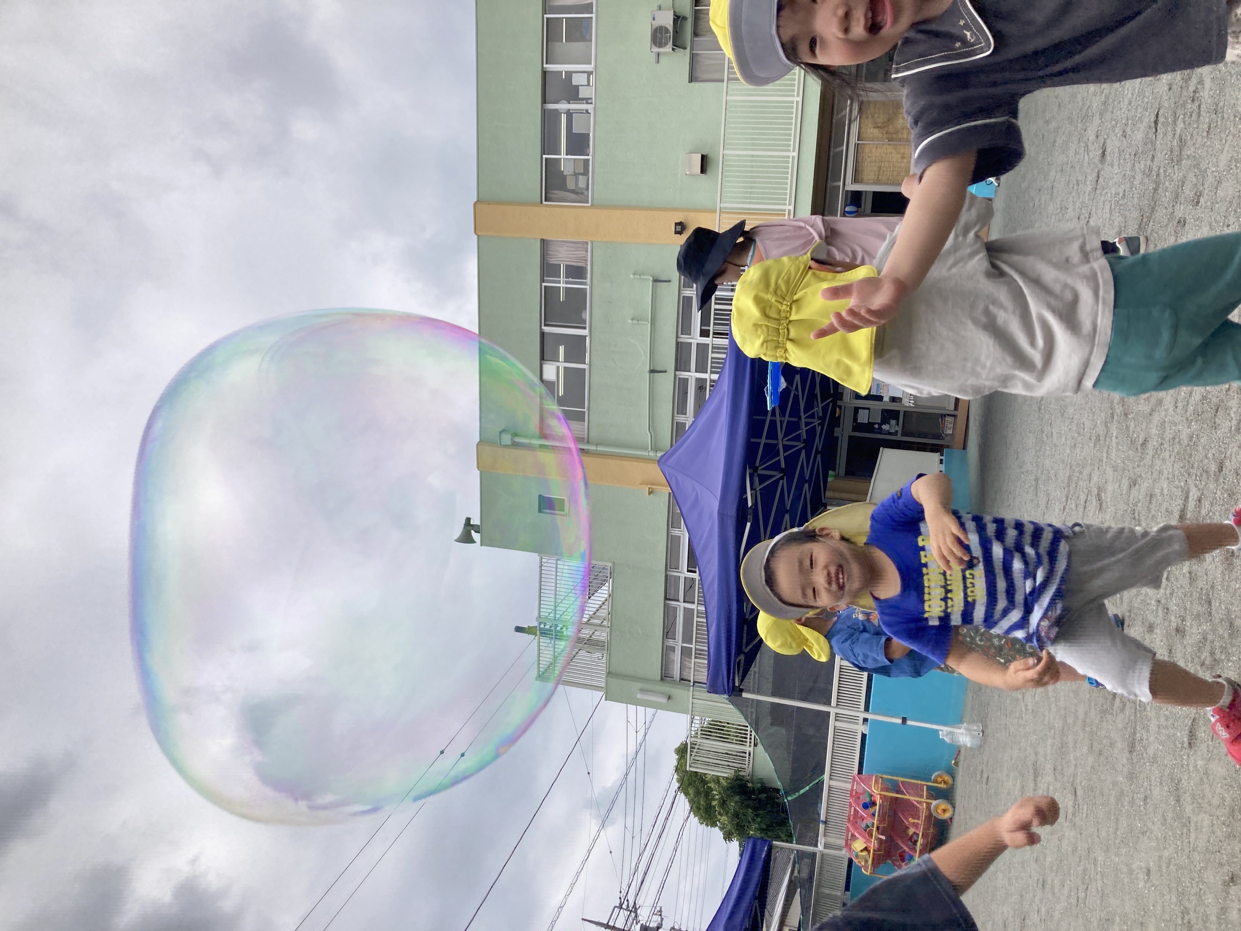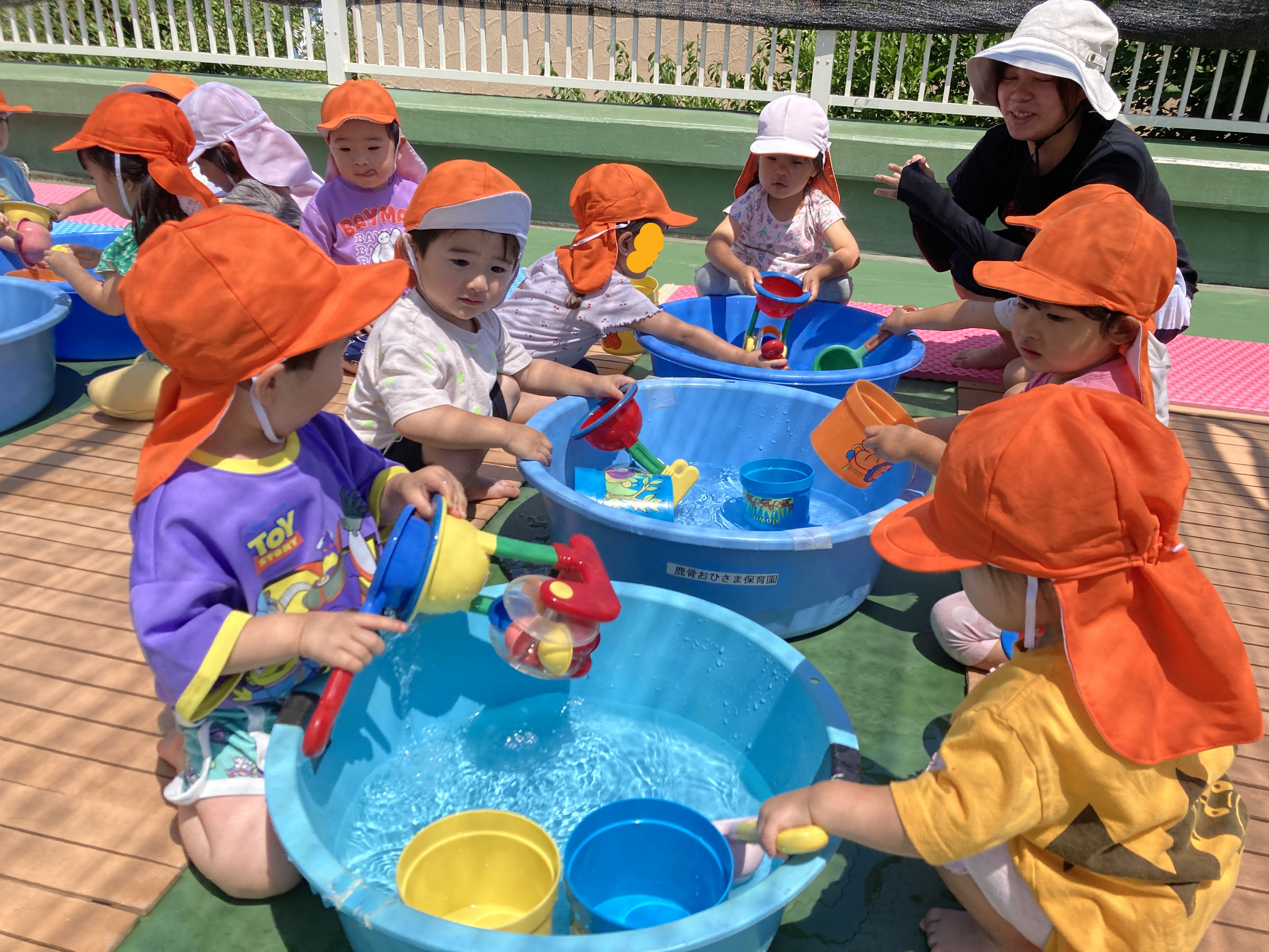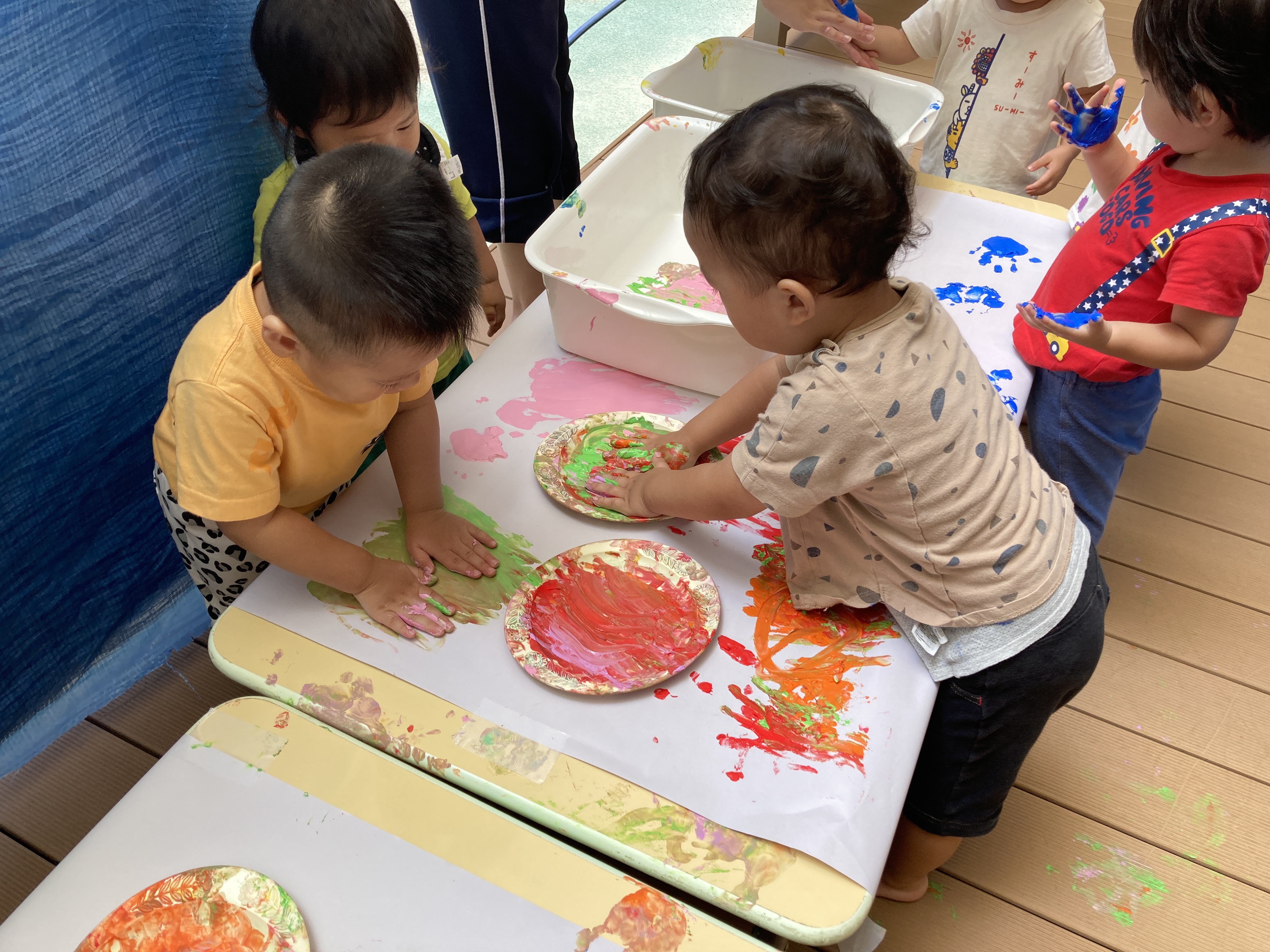 夏には、園庭に大きなテントを出し、水あそびや泡あそび等したり、テラスやプールでも遊びました。