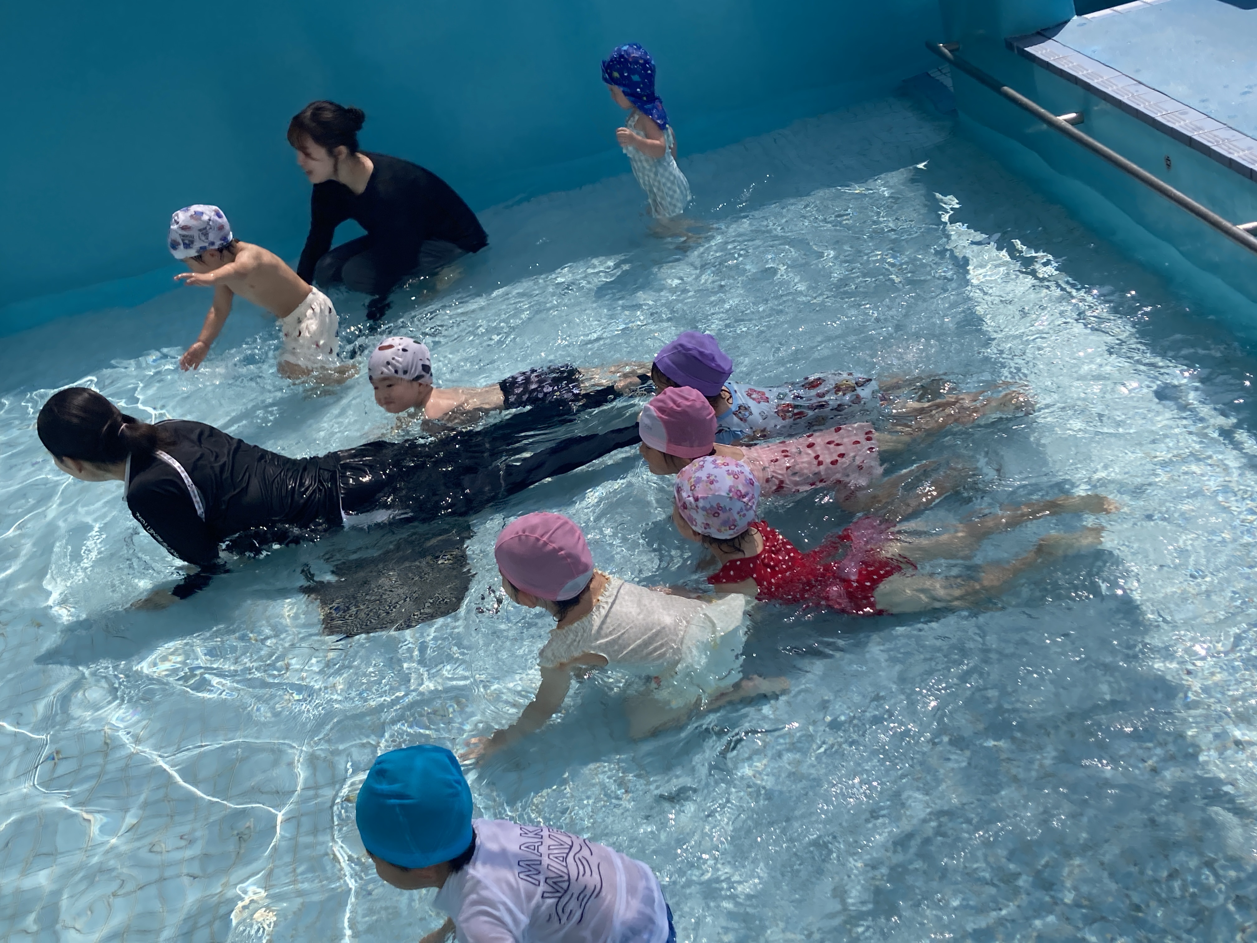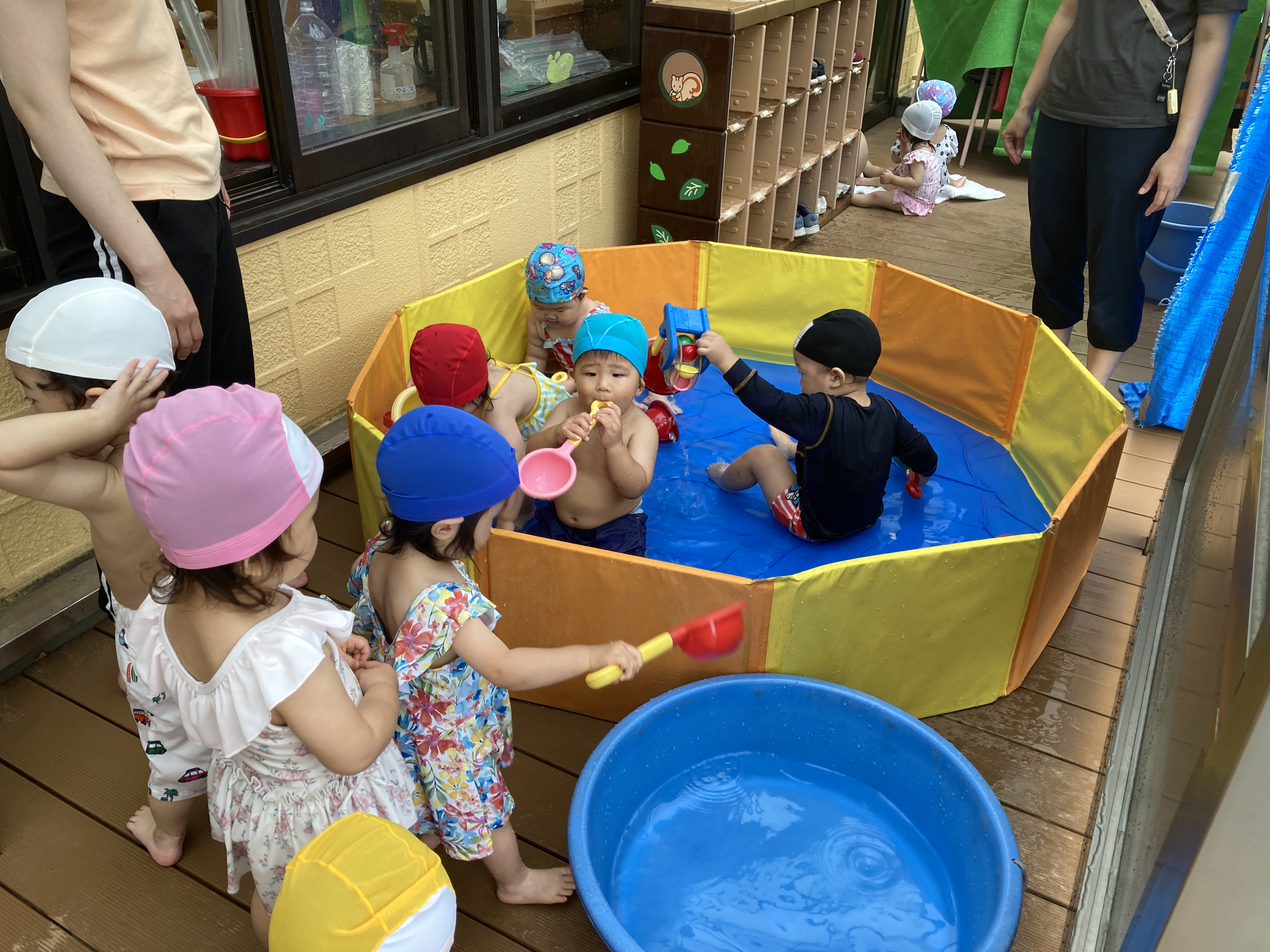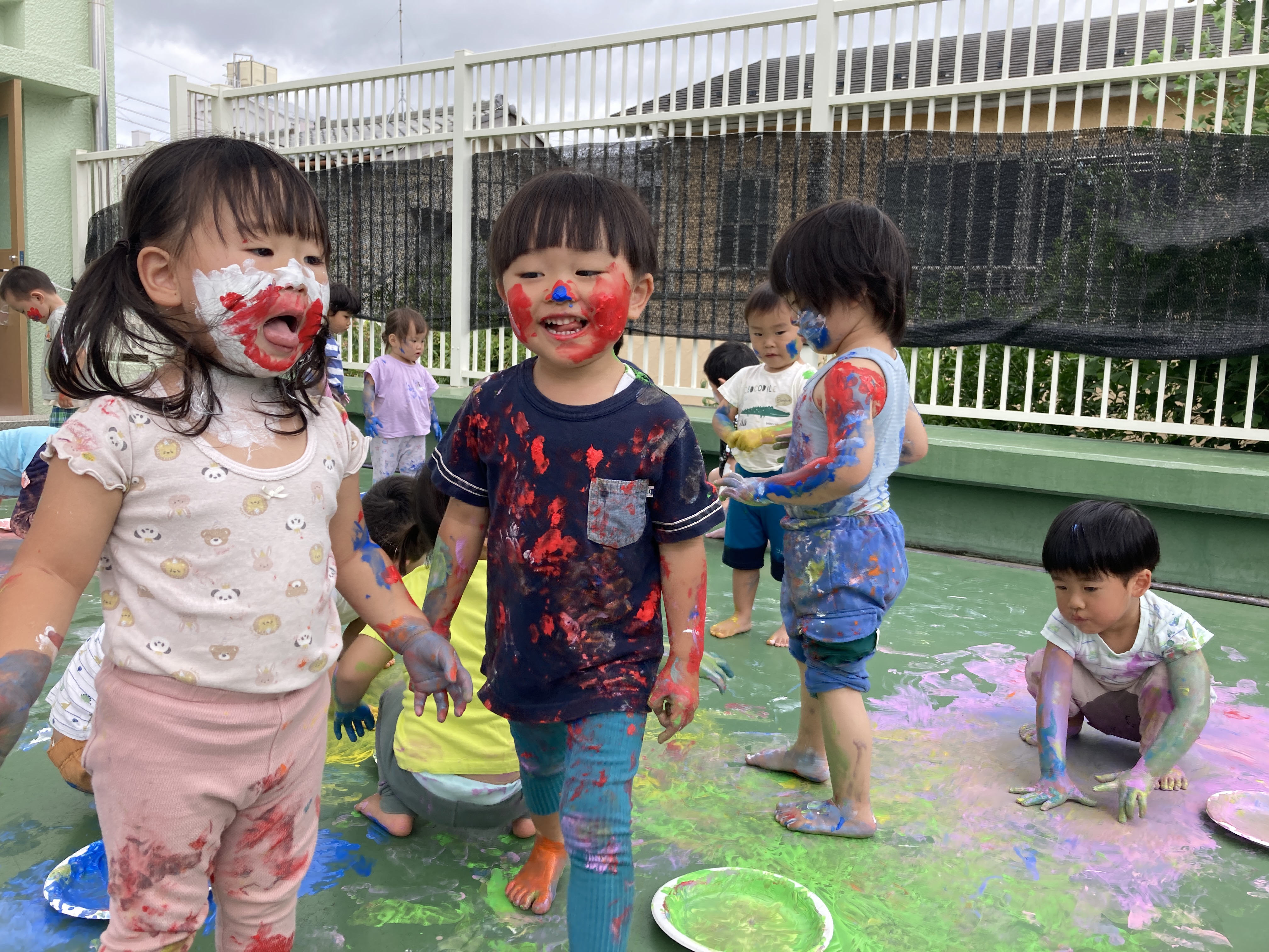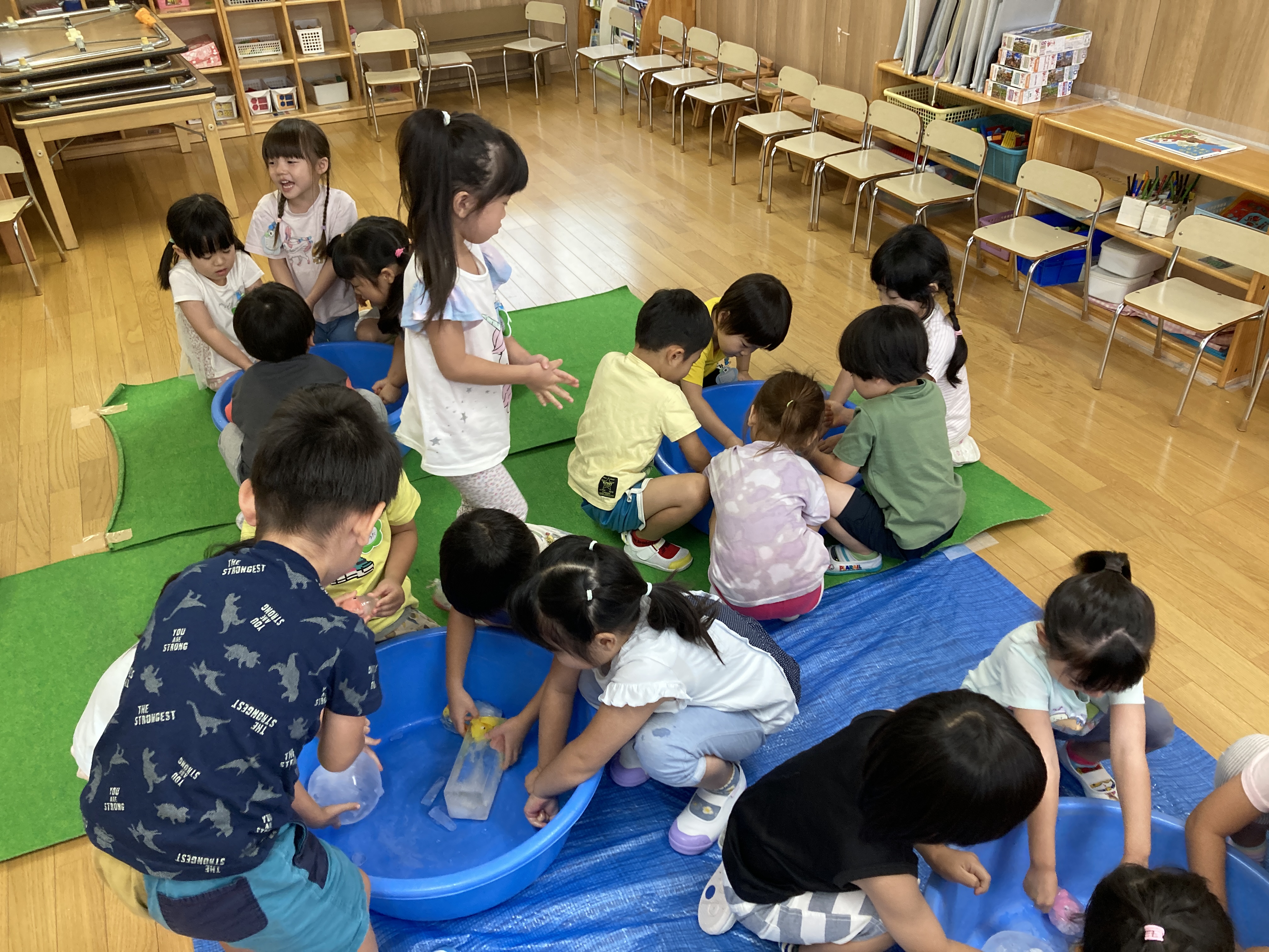 夏には、園庭に大きなテントを出し、水あそびや泡あそび等したり、テラスやプールでも遊びました。