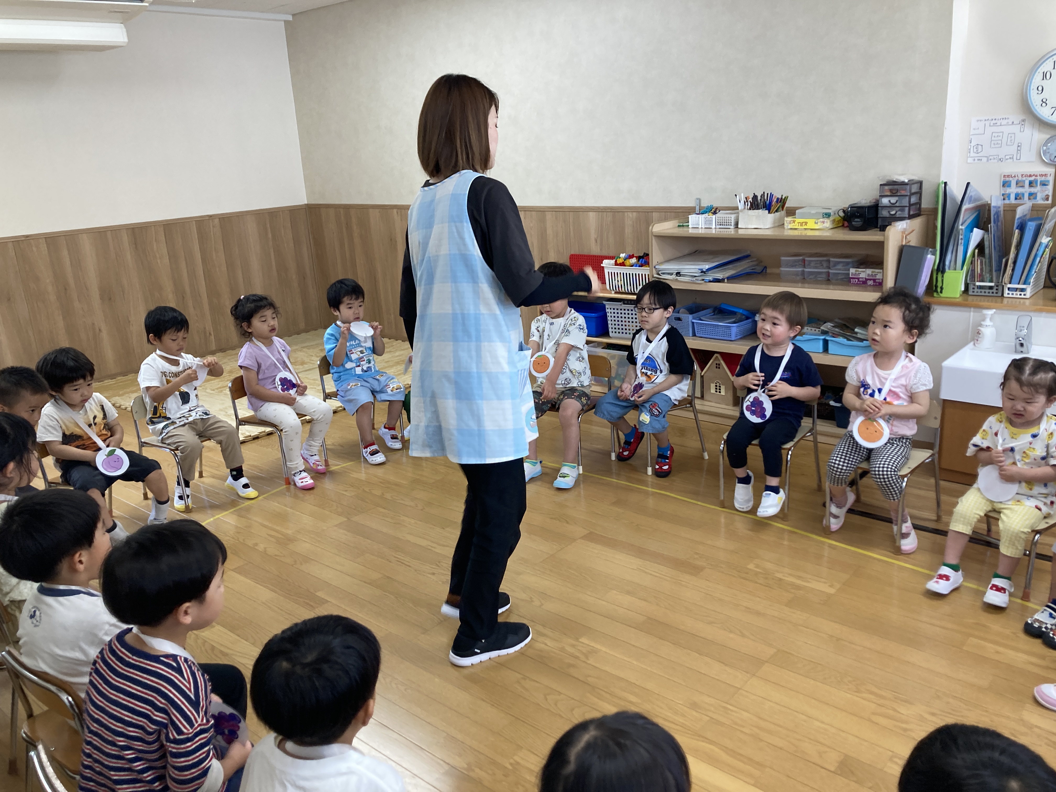 3歳になるとルールのあるゲームも楽しくなってきます。フルーツバスケットのルールをしっかり聞いてますね。