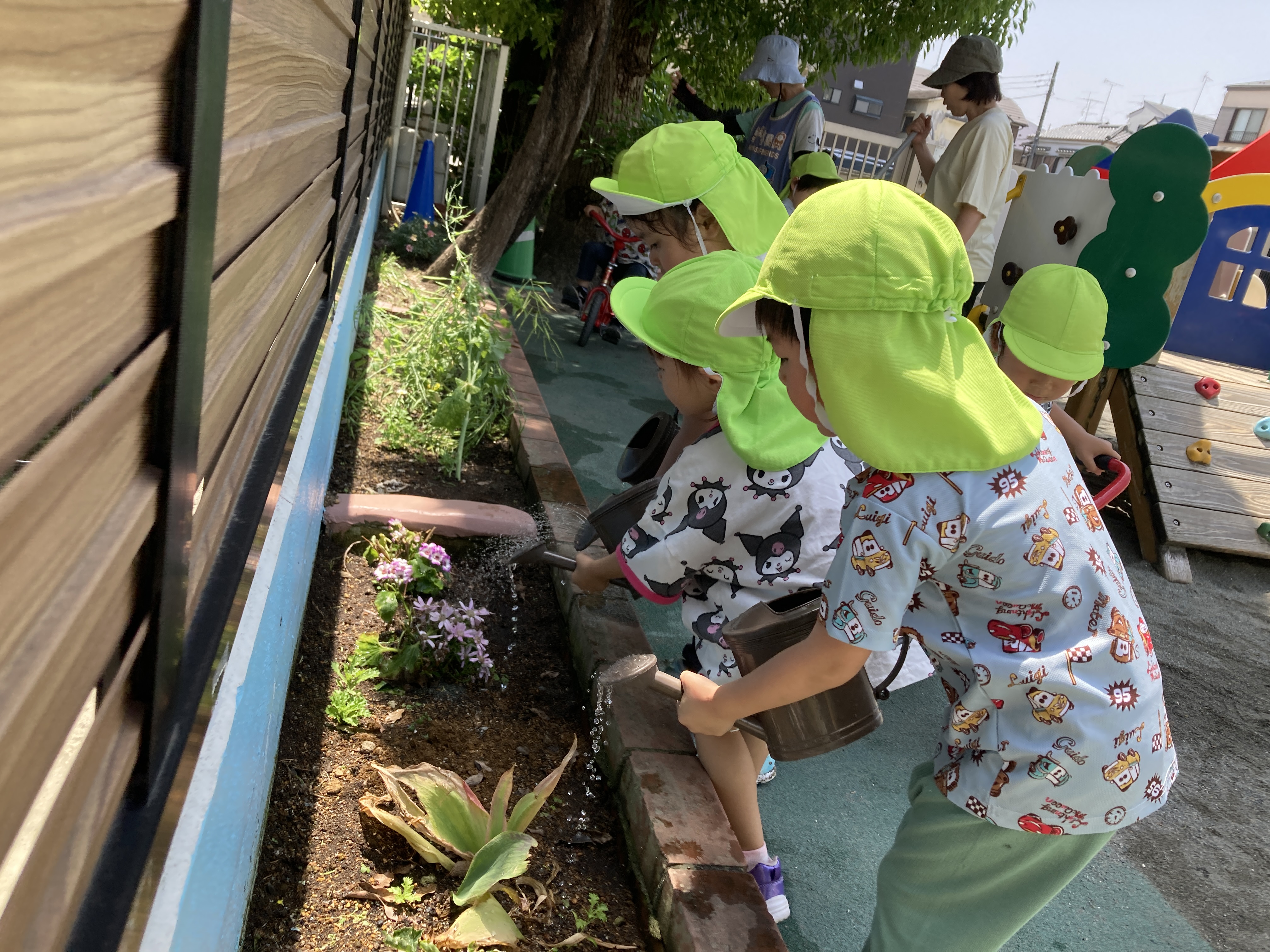 遊んでいる時に気が付いて、花壇の花に水をあげてくれています。友達と色々なことを体験できるのも保育園の良いところです。