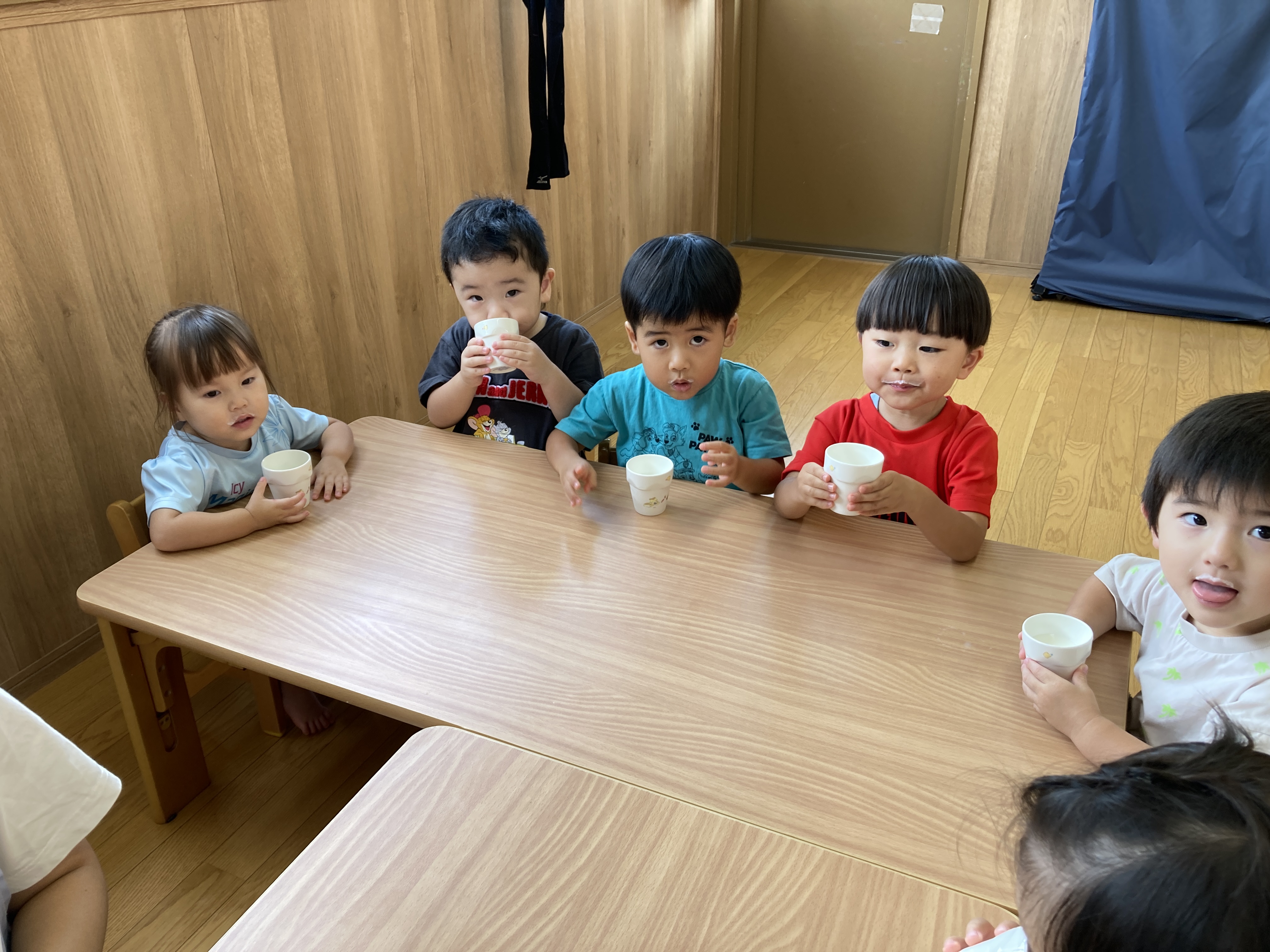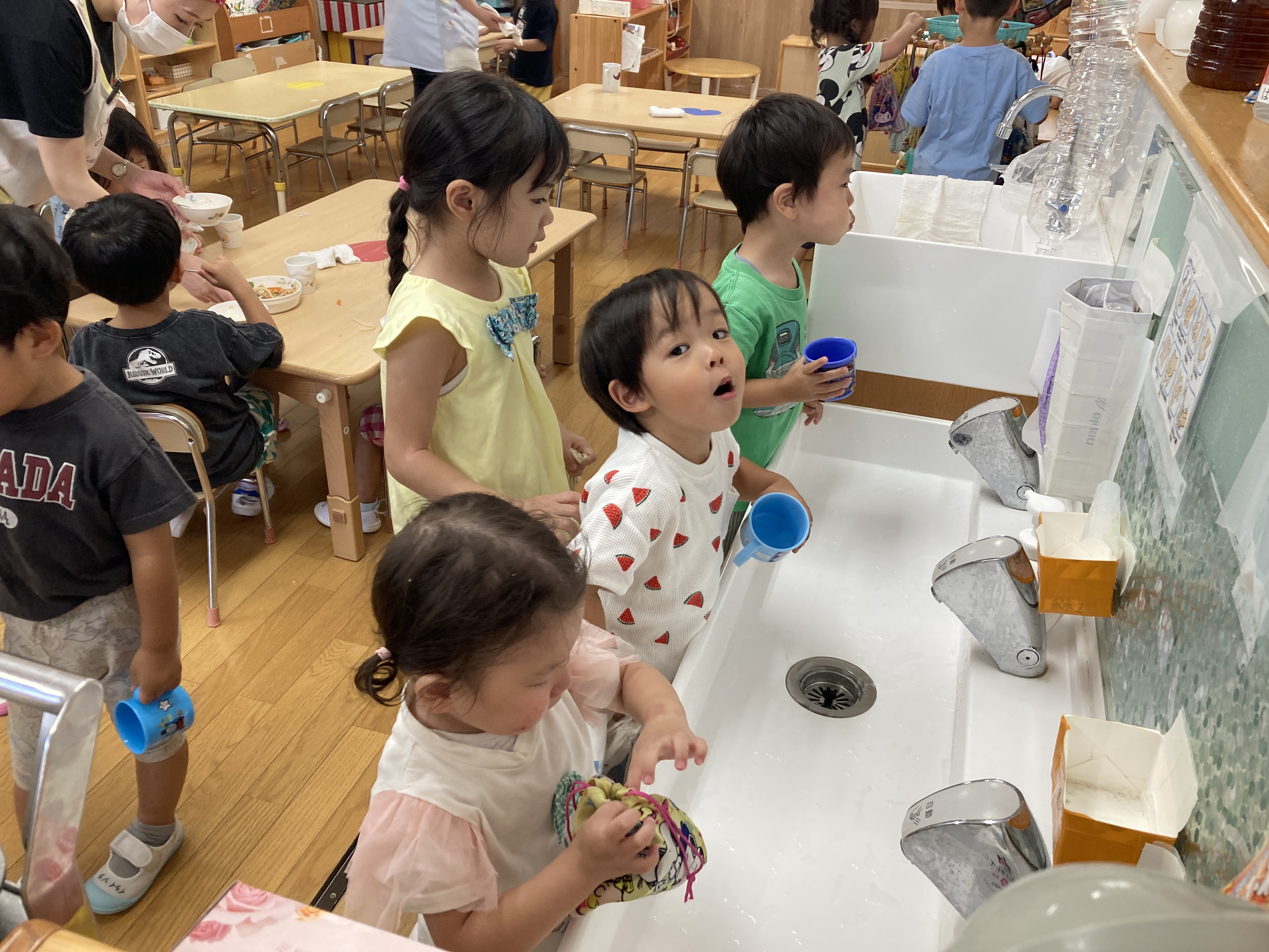 食事の後は、うがいです。2歳クラス後半から始めるうがい。3歳クラスになると上手ですね。
