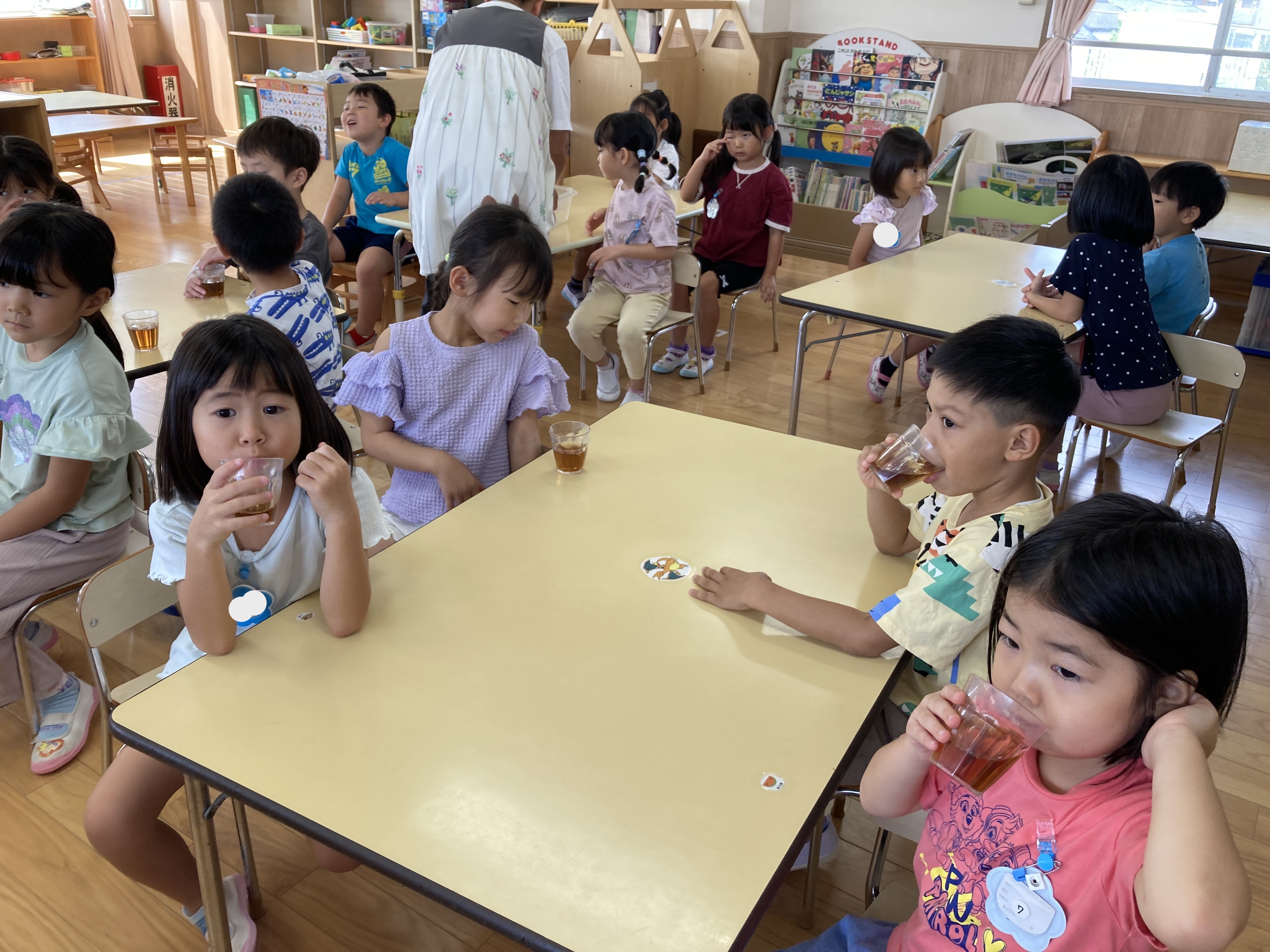 活動の合間のお茶タイム。絵を描くのが得意な担任が書きながら、何が描かれるのかを当てるゲームです。