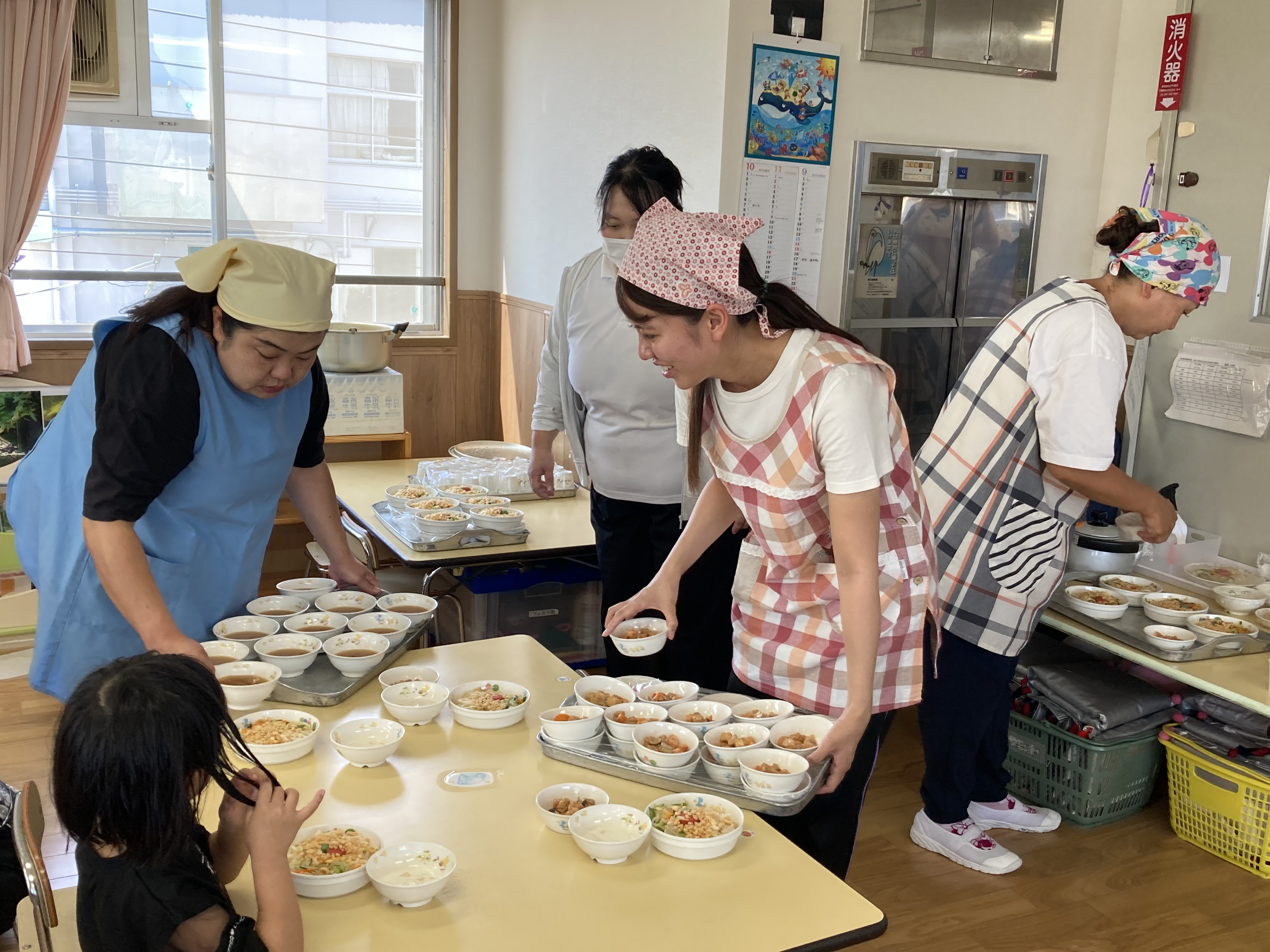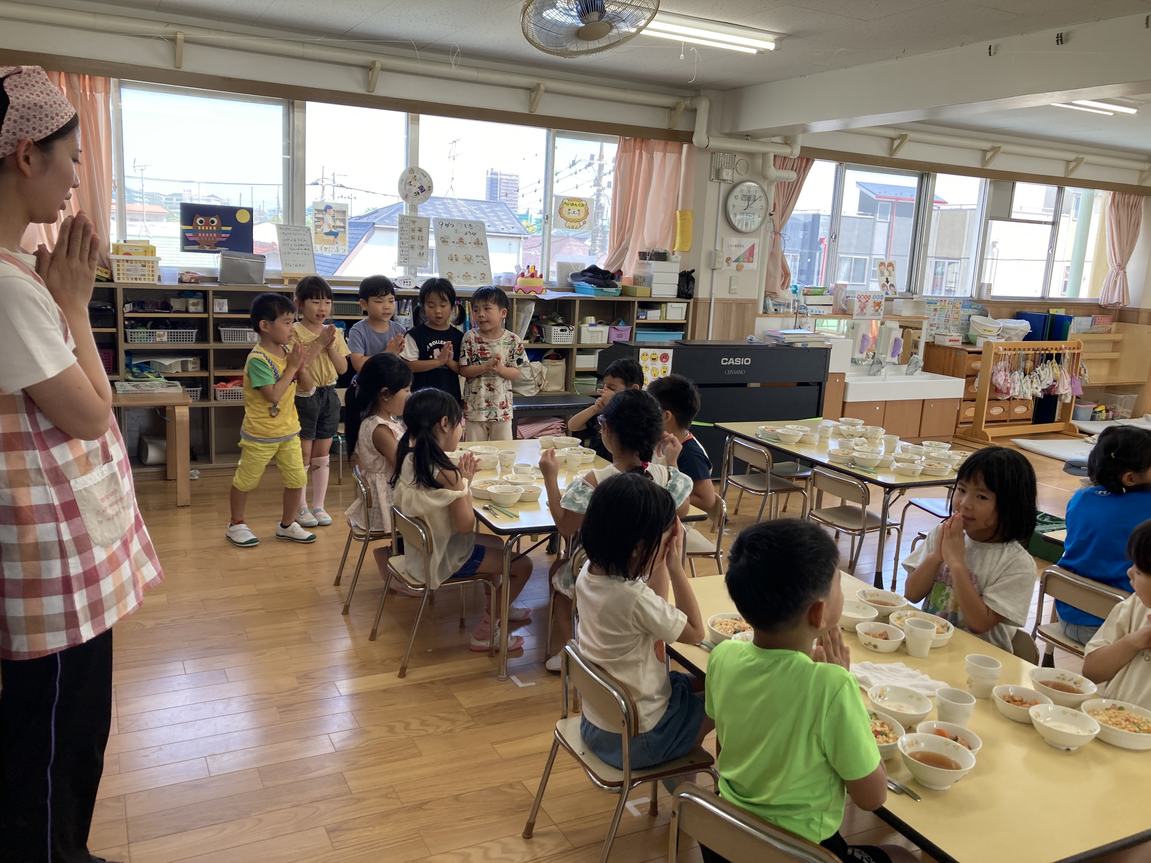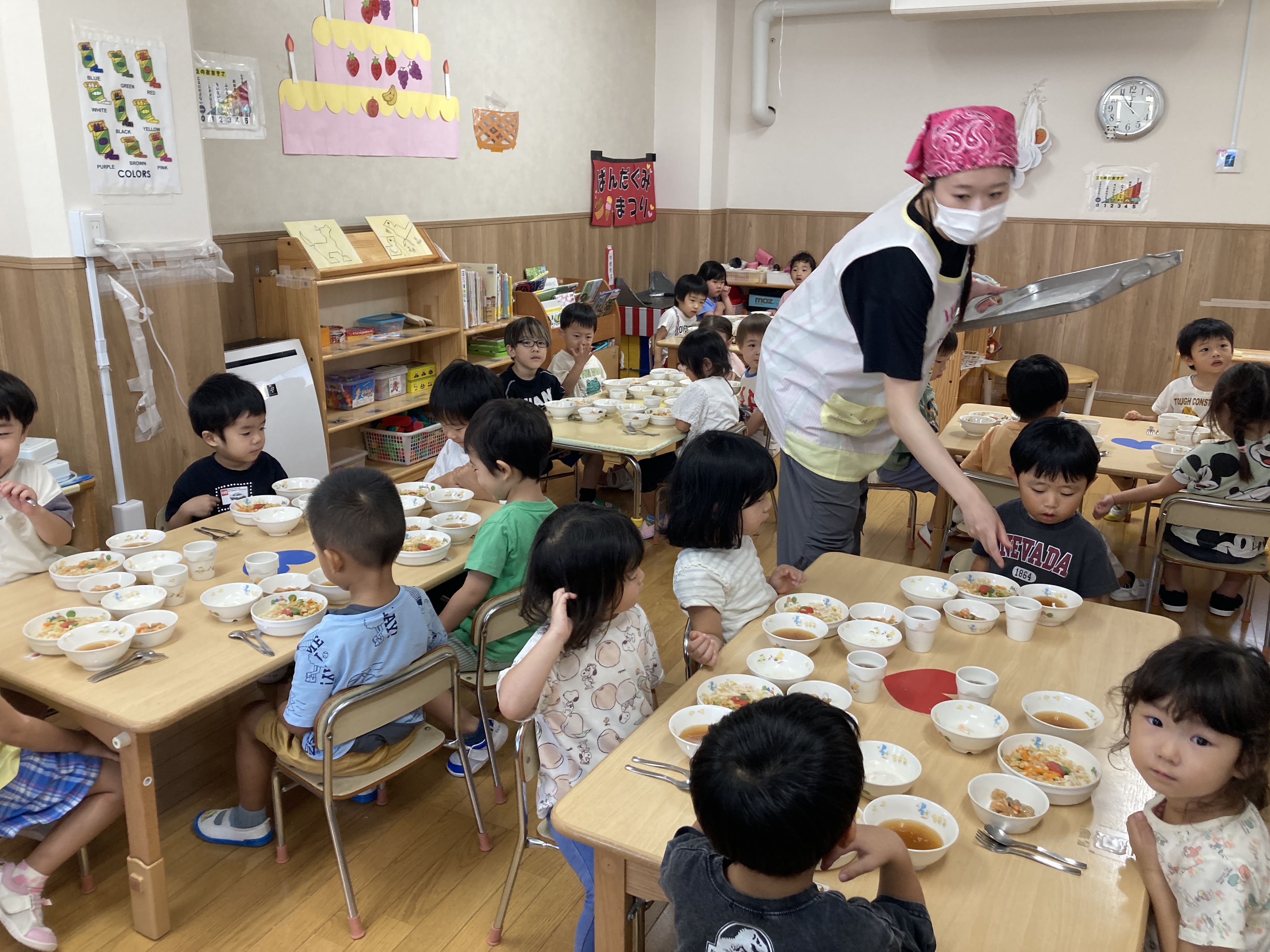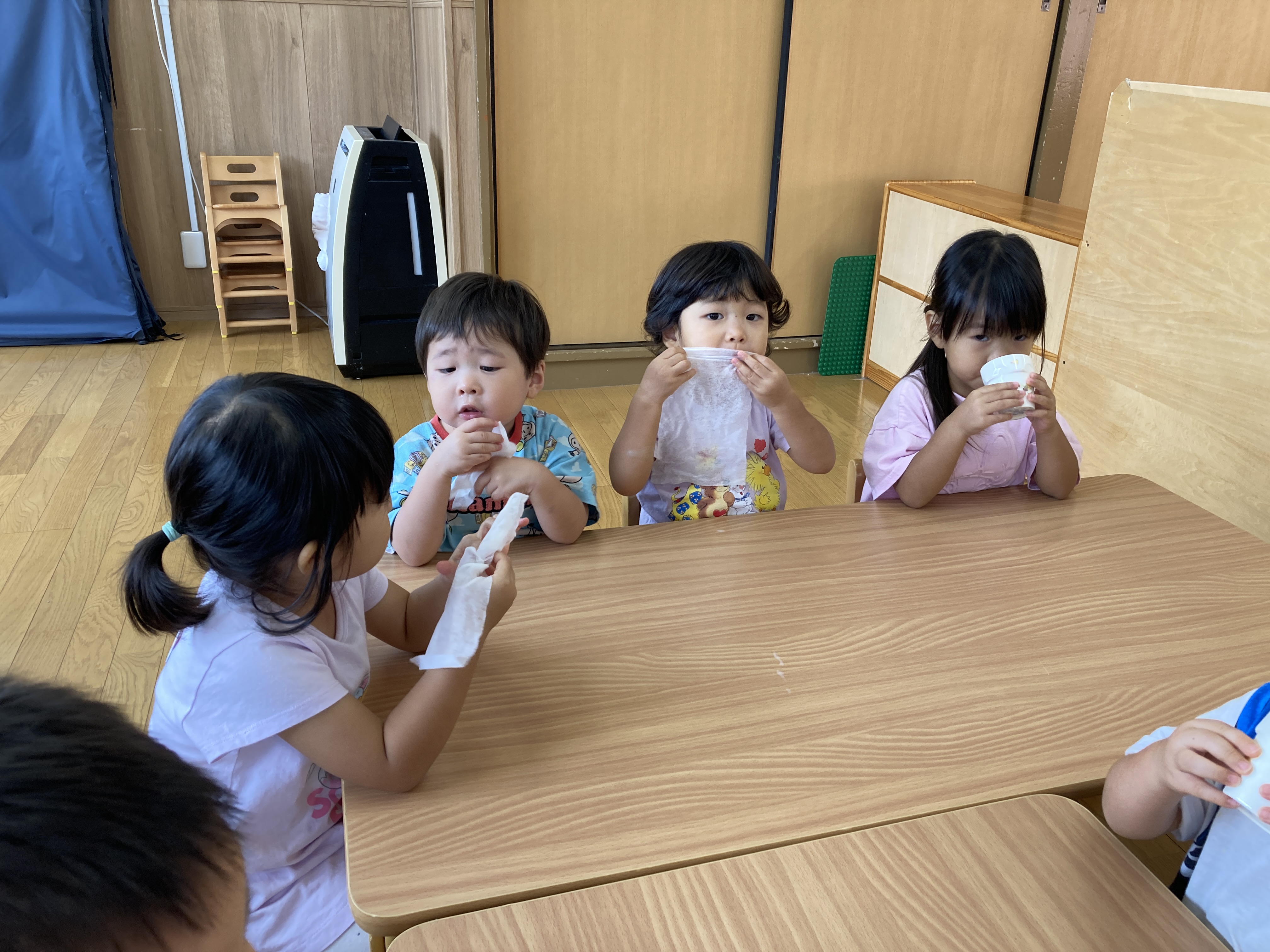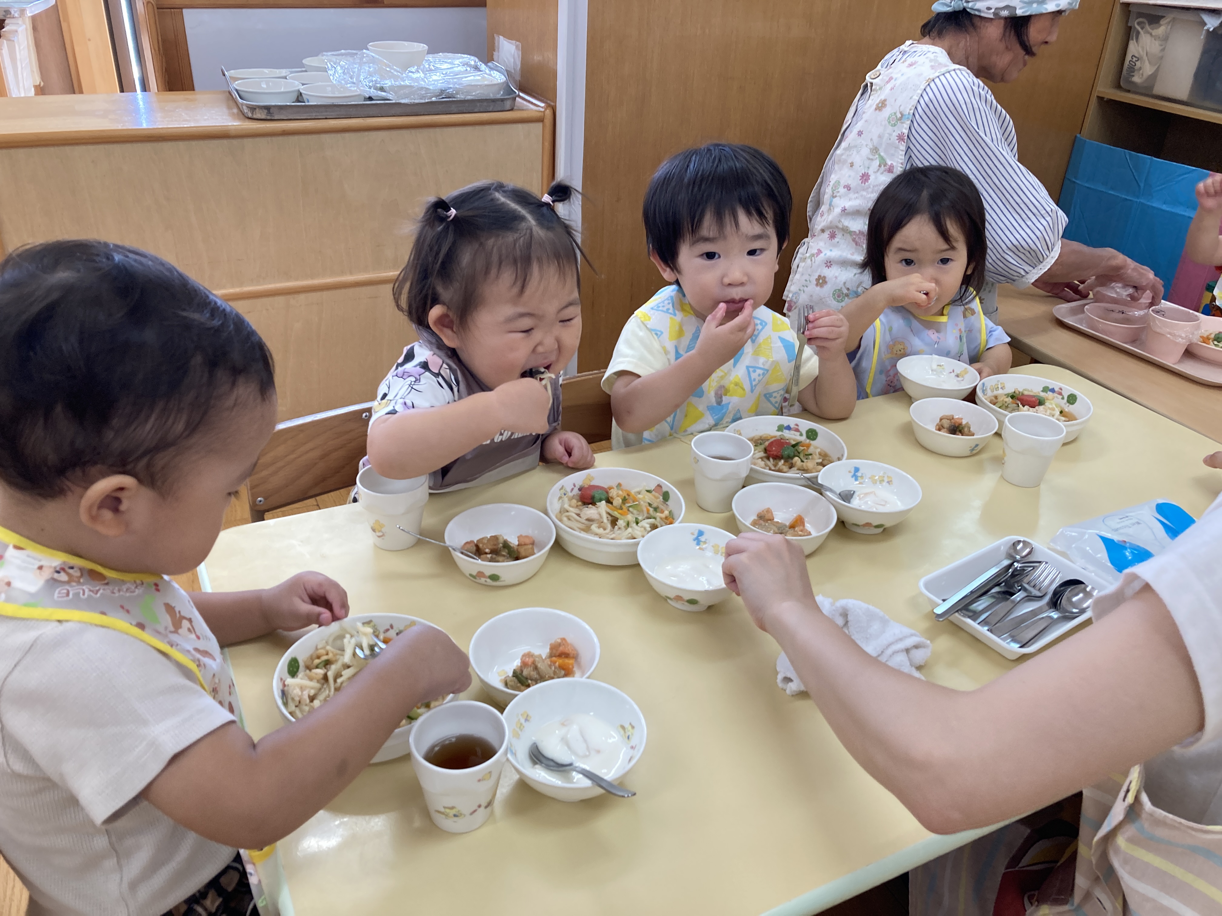食事の時間です。先生が配ってくれるのを静かに待てるようになりました。