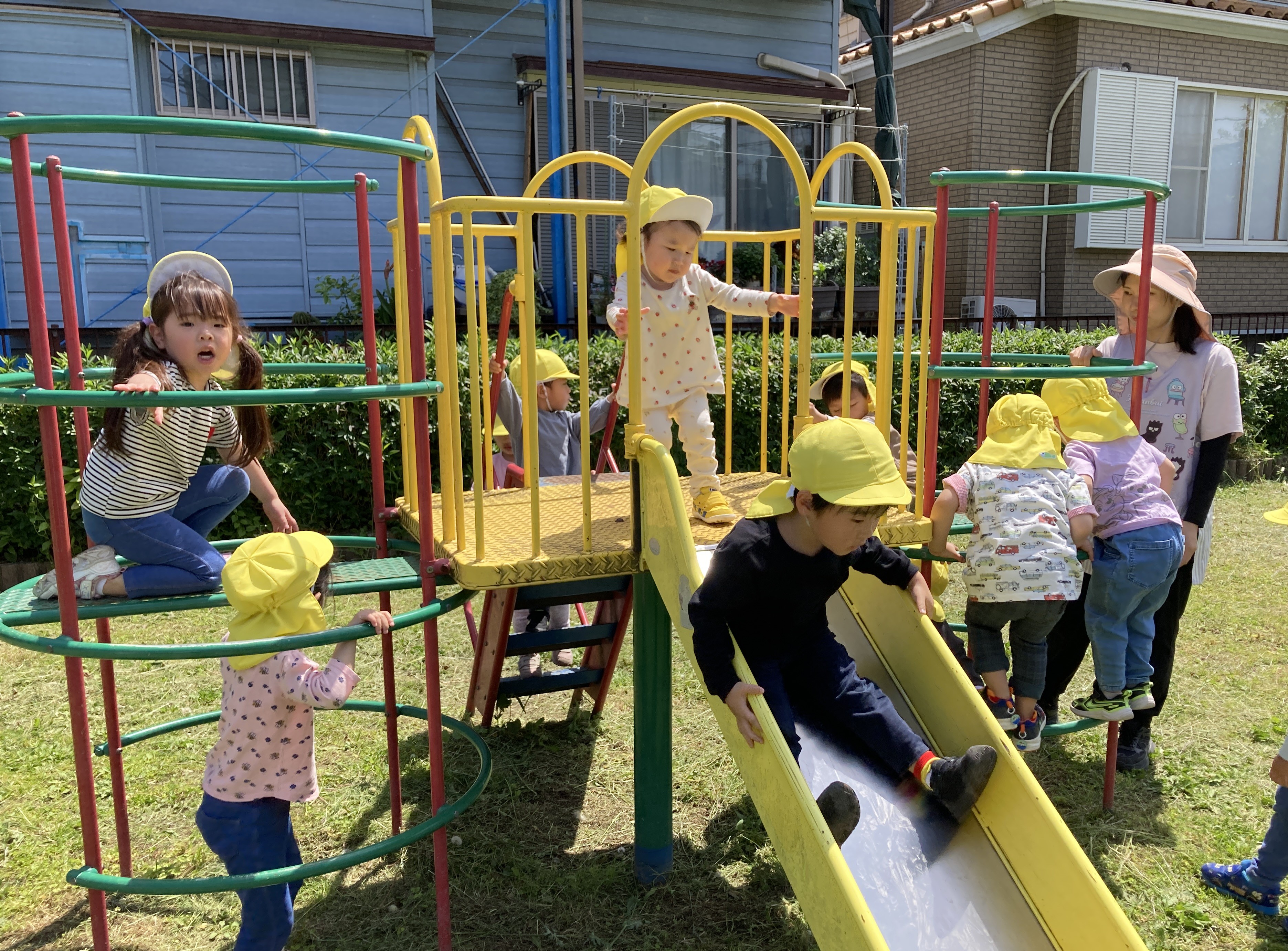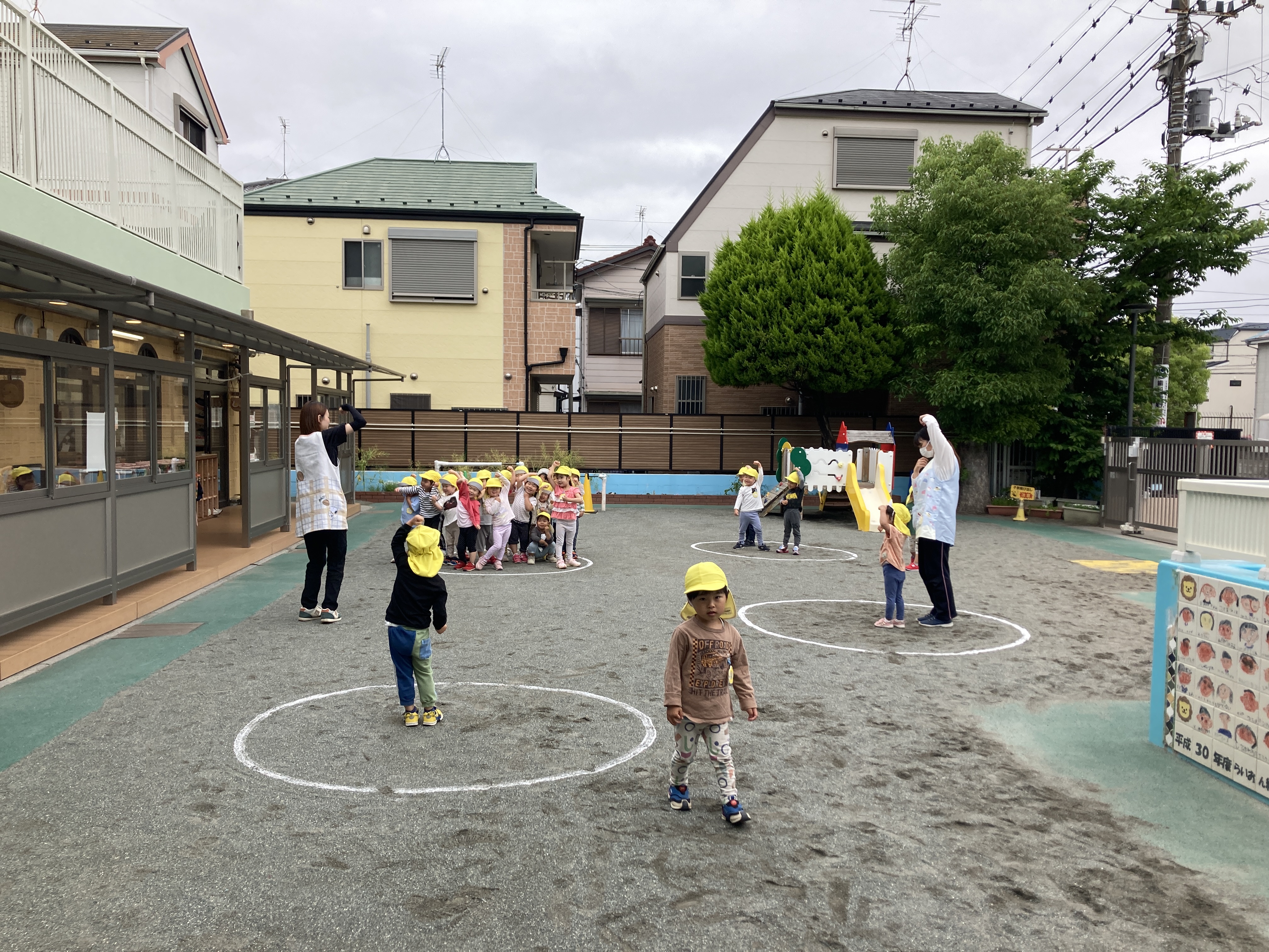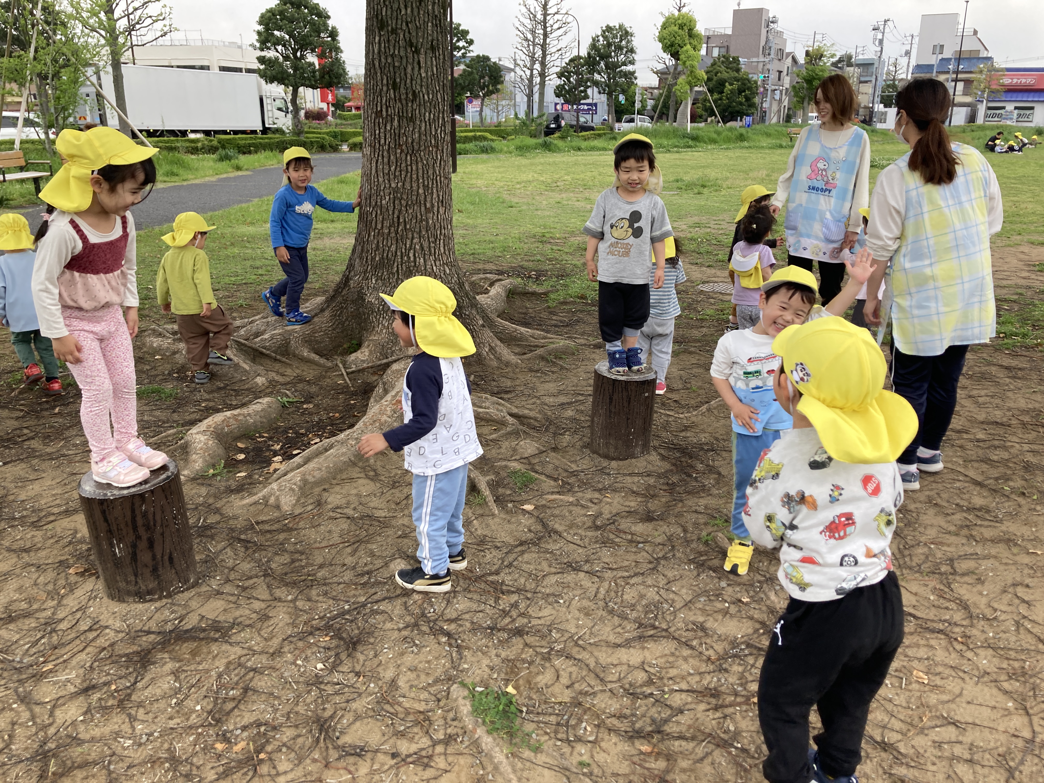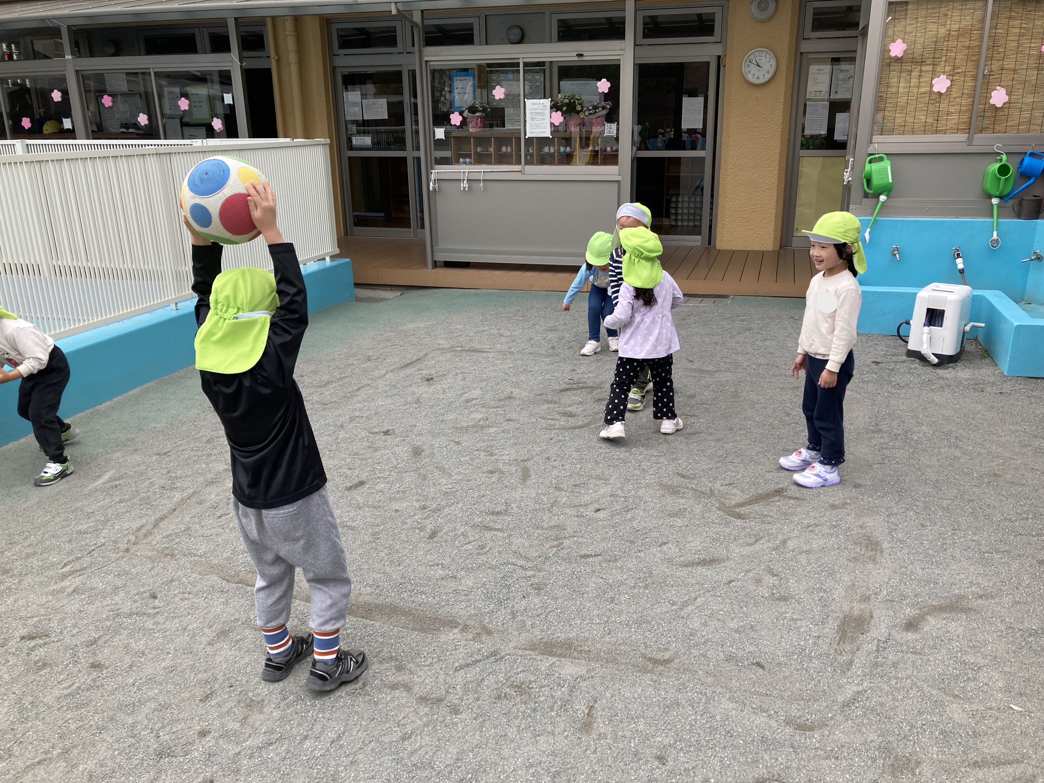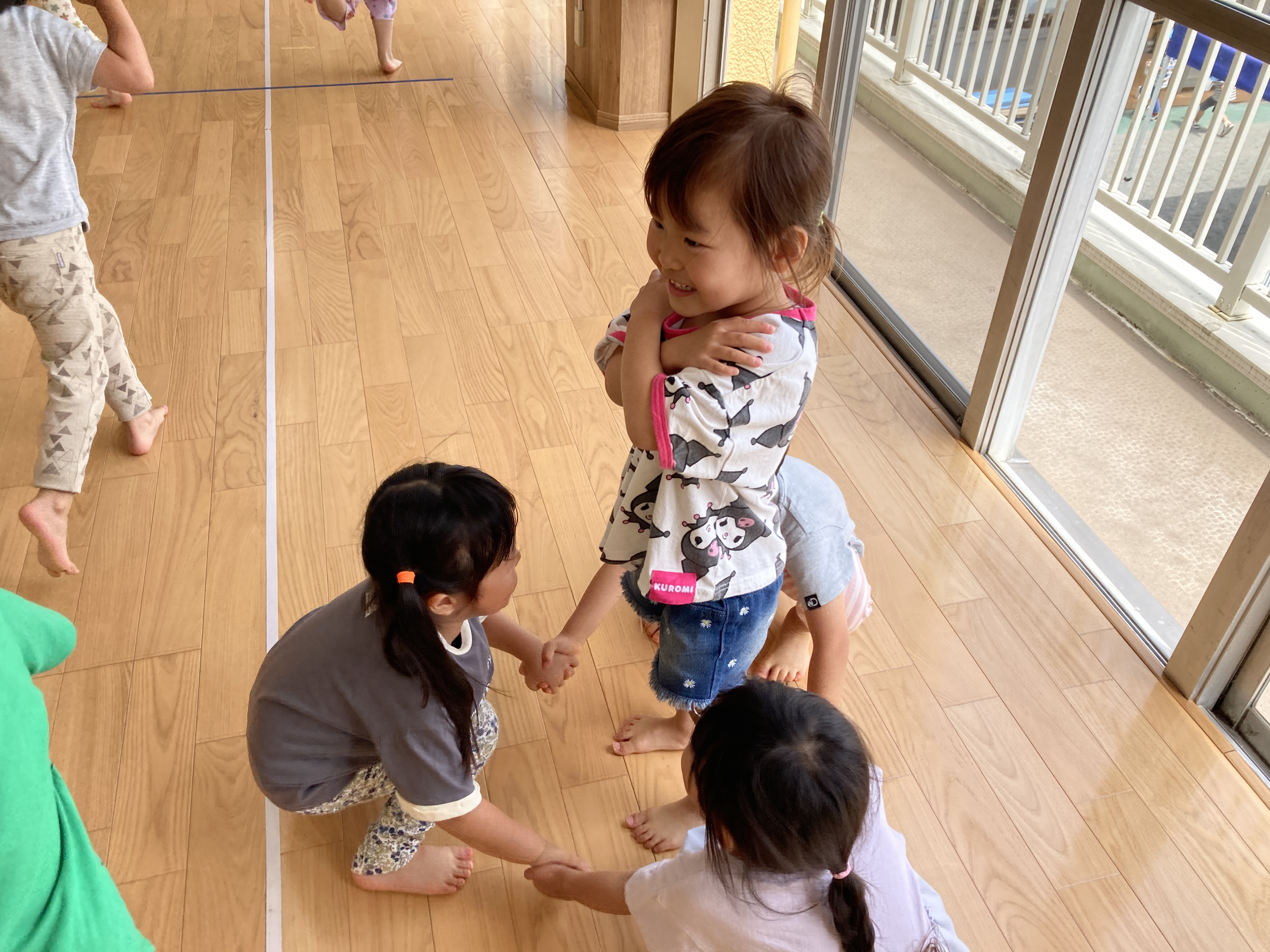 園庭の様子です。だるまさんのお引越しという遊びが人気です。おさるさんの真似♬
